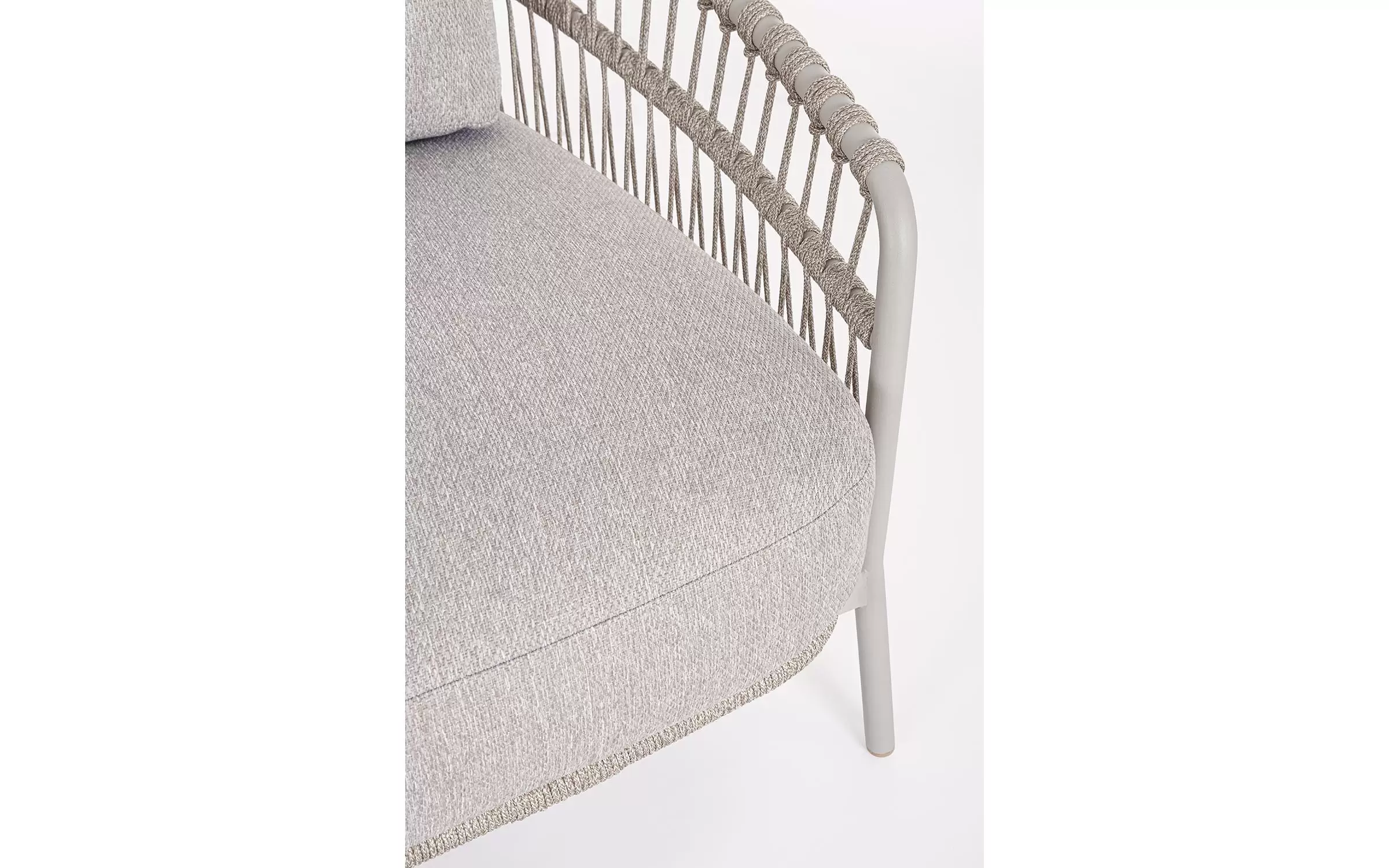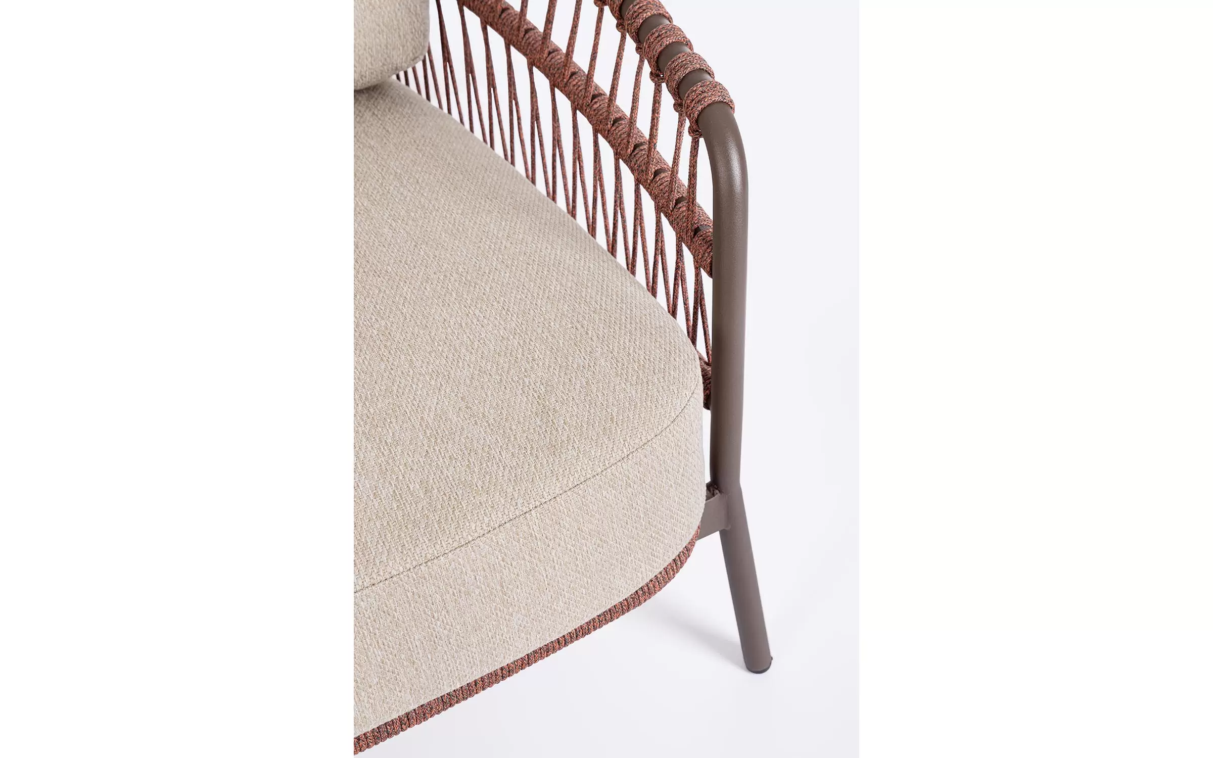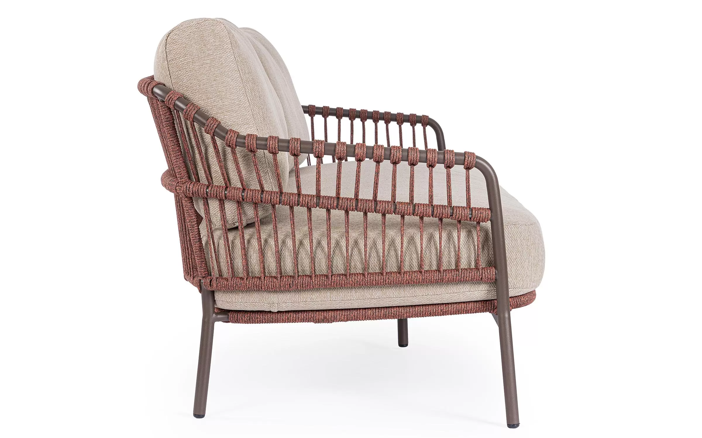 Nowoczesna sofa ogrodowa Talaia na nowoczesny taras. Konstrukcja ze stali nierdzewnej w malowaniu proszkowym opleciona lekkim oplotem z liny polipropylenowej.
