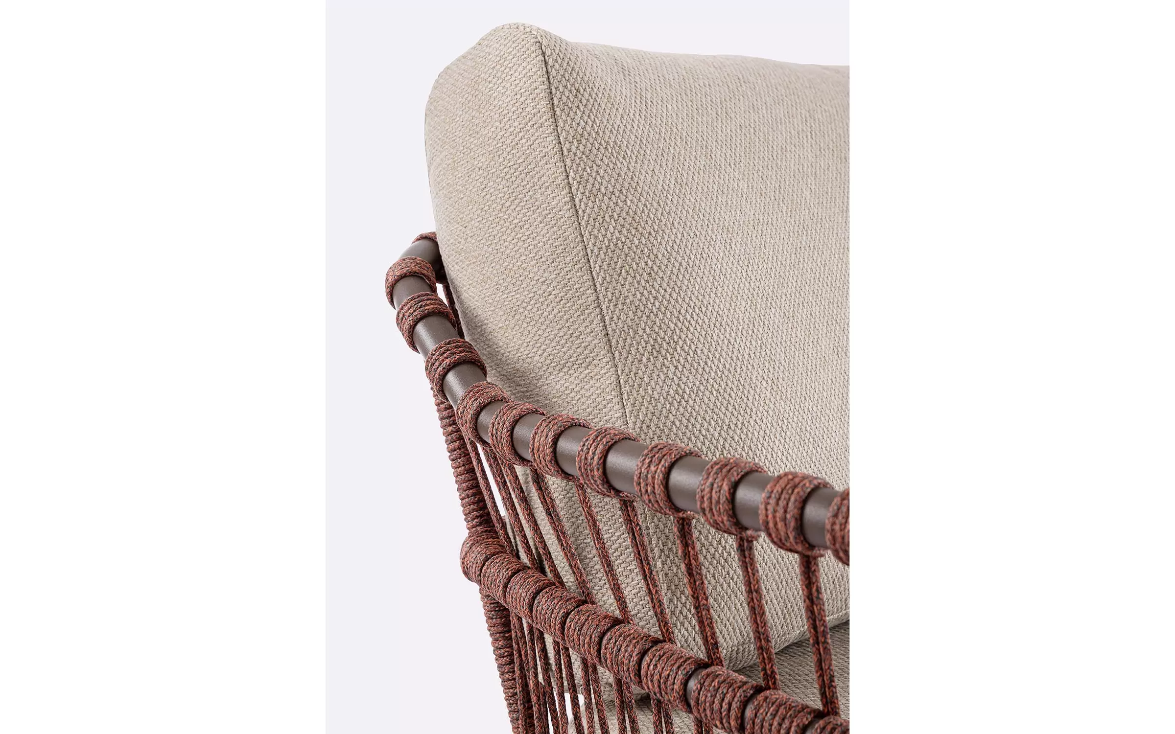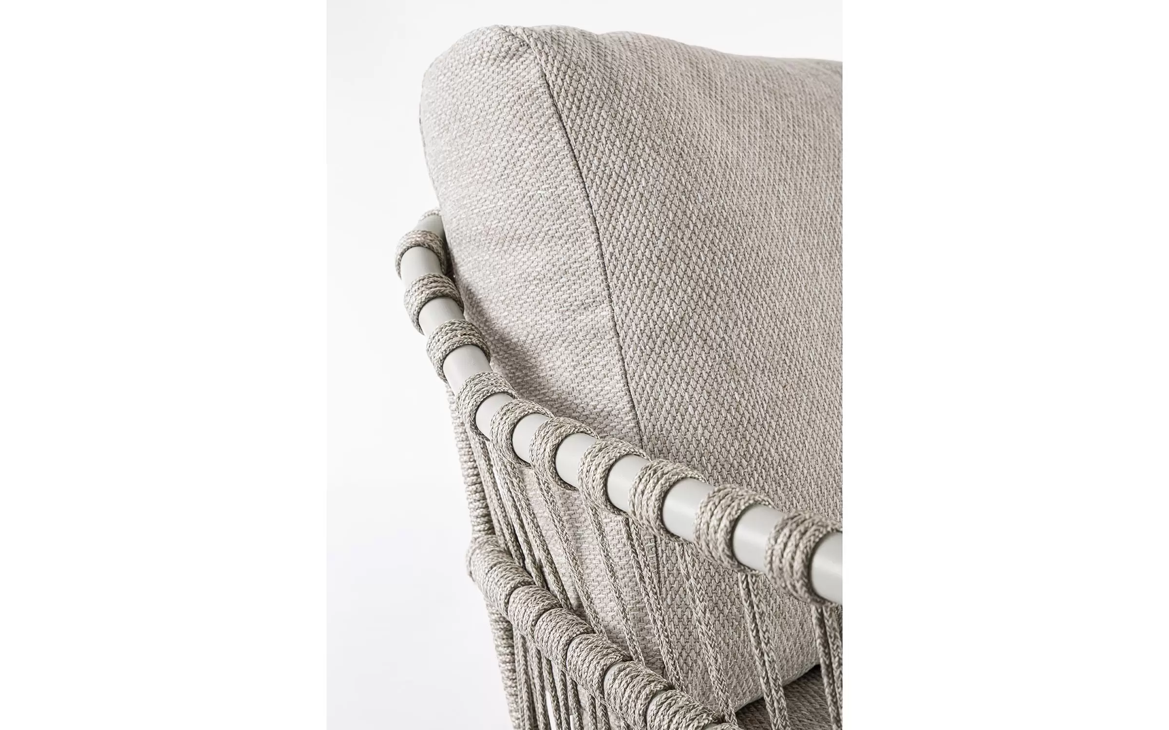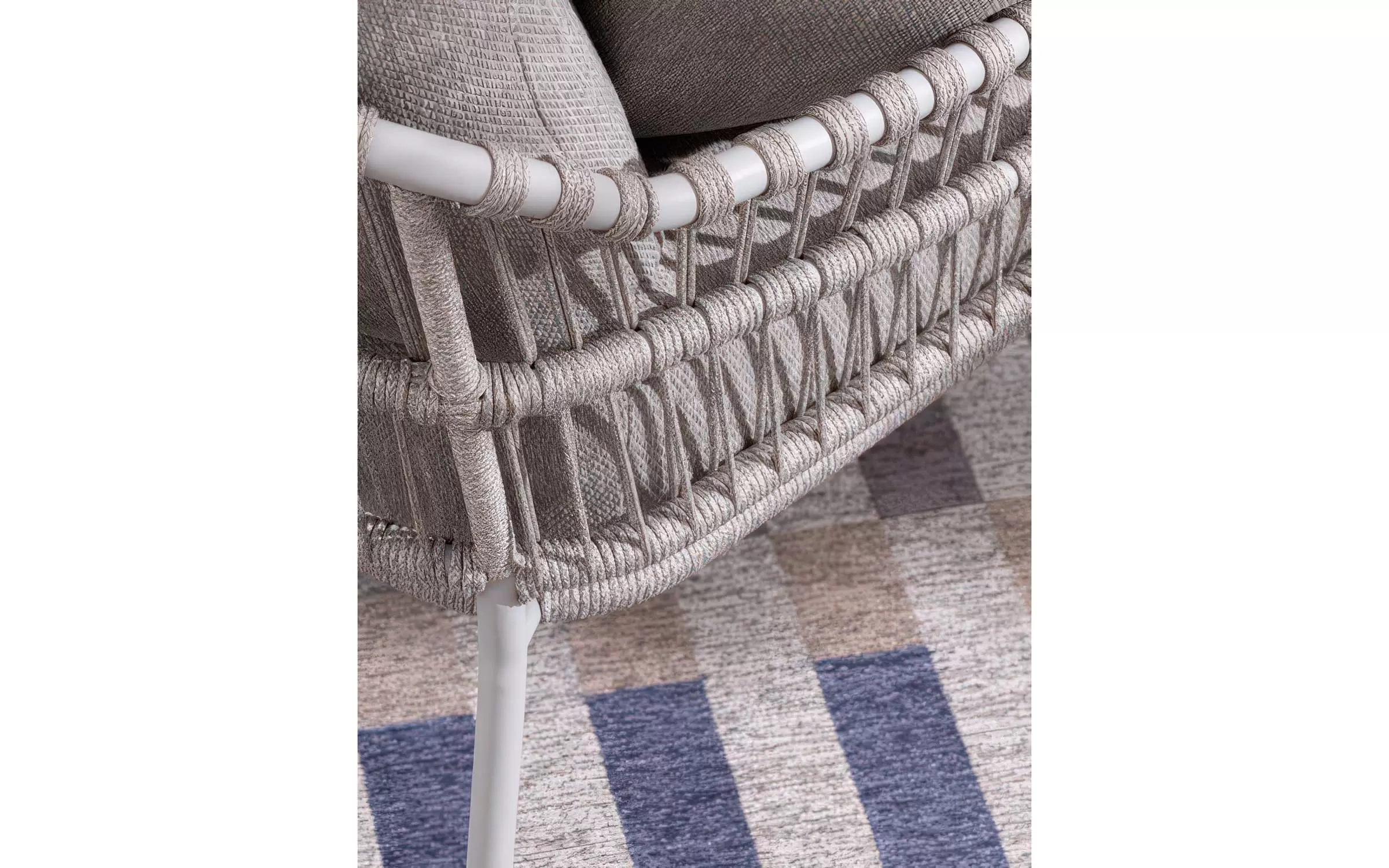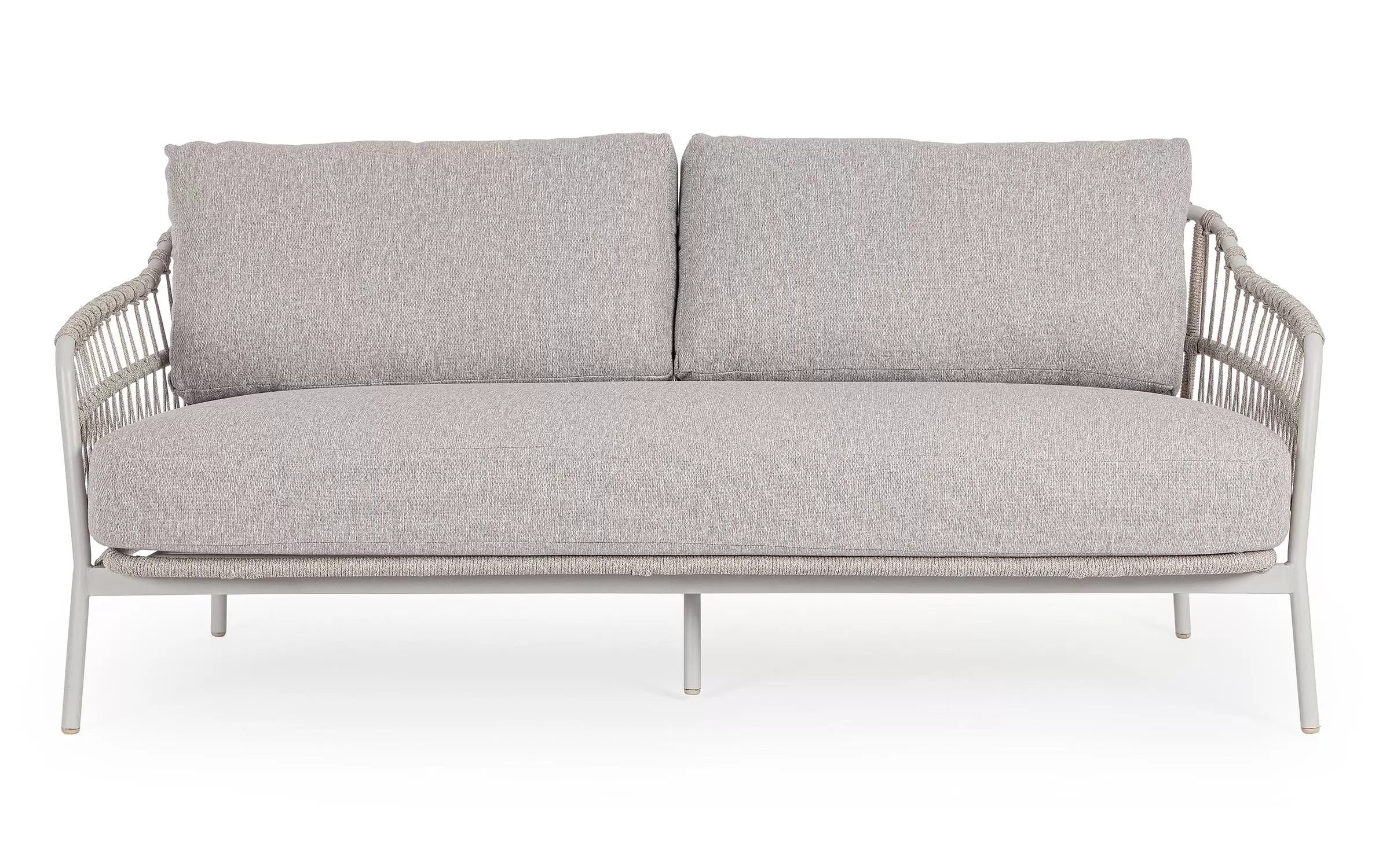 Nowoczesna sofa ogrodowa Talaia na nowoczesny taras. Konstrukcja ze stali nierdzewnej w malowaniu proszkowym opleciona lekkim oplotem z liny polipropylenowej.