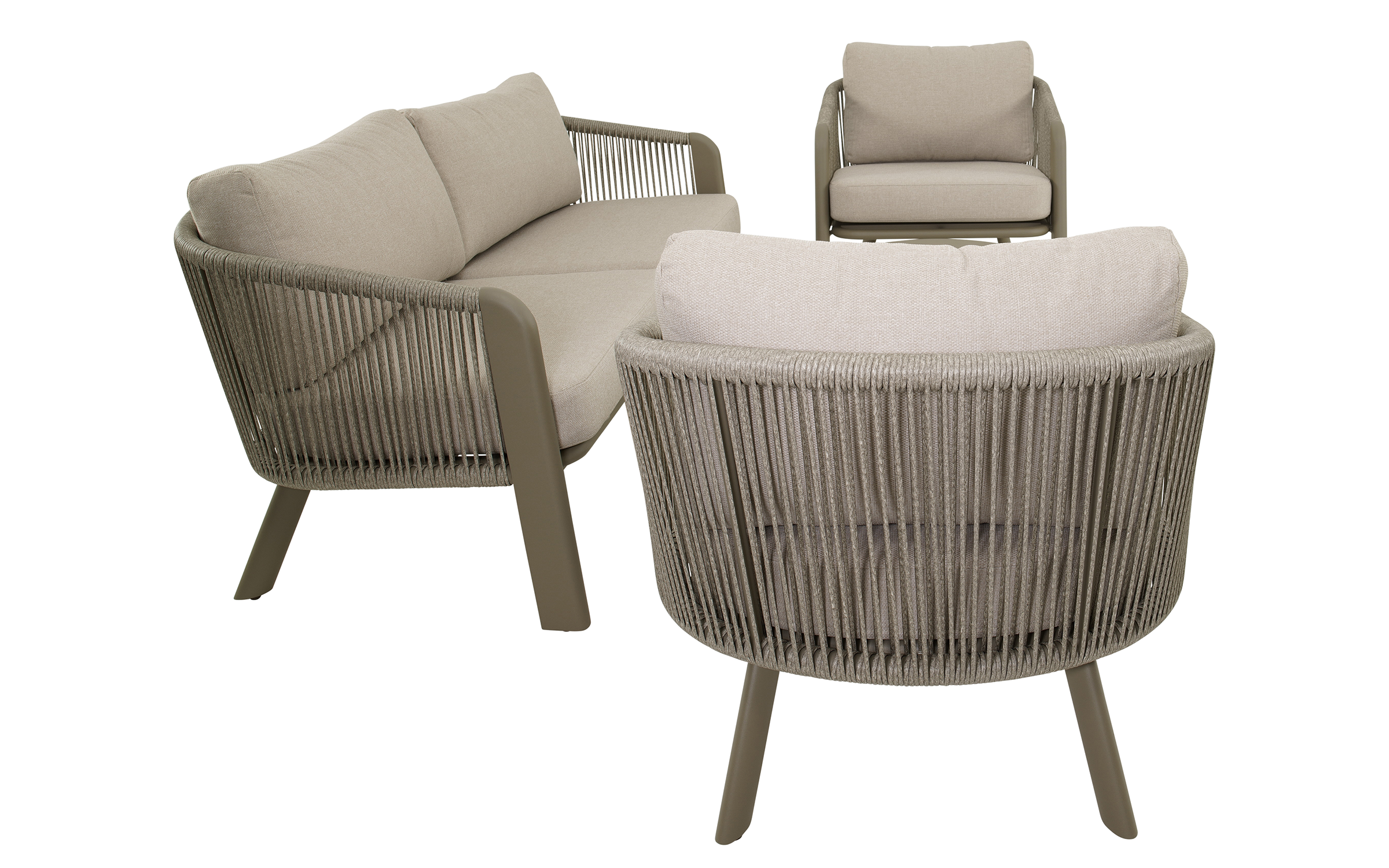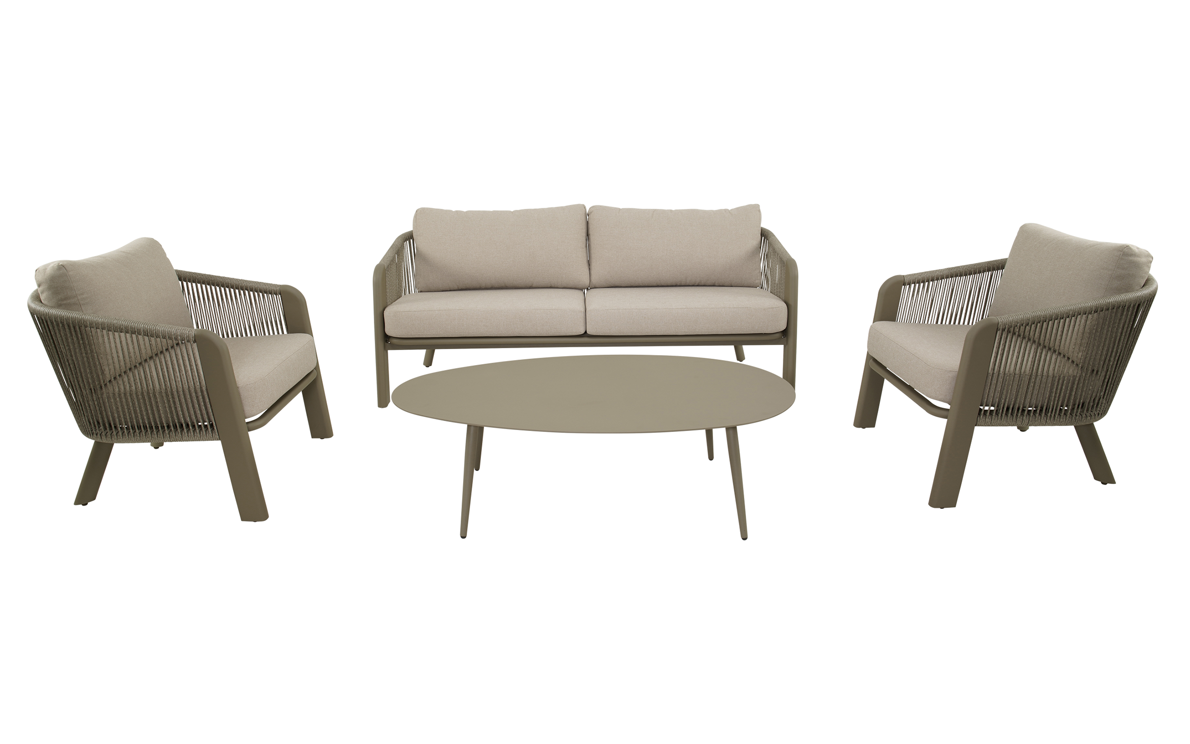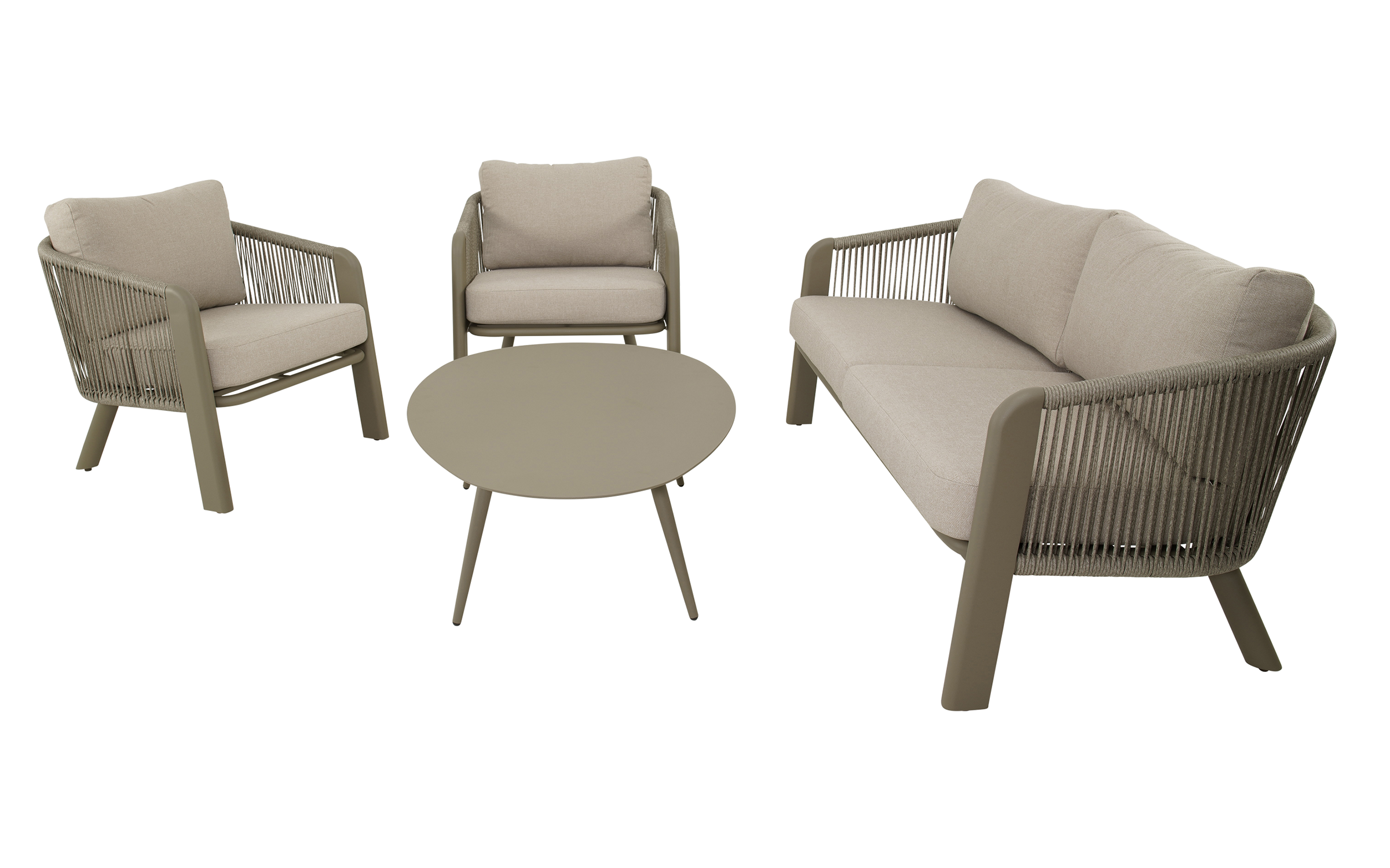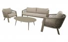 Zestaw lounge TANOA marki Lesli Living to elegancka propozycja do ogrodu lub na taras. W skład zestawu wchodzi sofa 2,5‑osobowa, dwa fotele oraz stolik kawowy. Konstrukcja wykonana z aluminium malowanego proszkowo w kolorze mat taupe zapewnia trwałość i odporność na warunki atmosferyczne. Boki i oparcia oplecione są liną polipropylenową Ø8 mm w kolorze taupe, co nadaje lekkości i zapewnia przewiewne, komfortowe siedzenie. Poduszki z tkaniny Olefin 240 g/m² są odporne na wilgoć, promieniowanie UV i zabrudzenia. Stolik wyposażony jest w aluminiowy blat o grubości 2,5 mm.