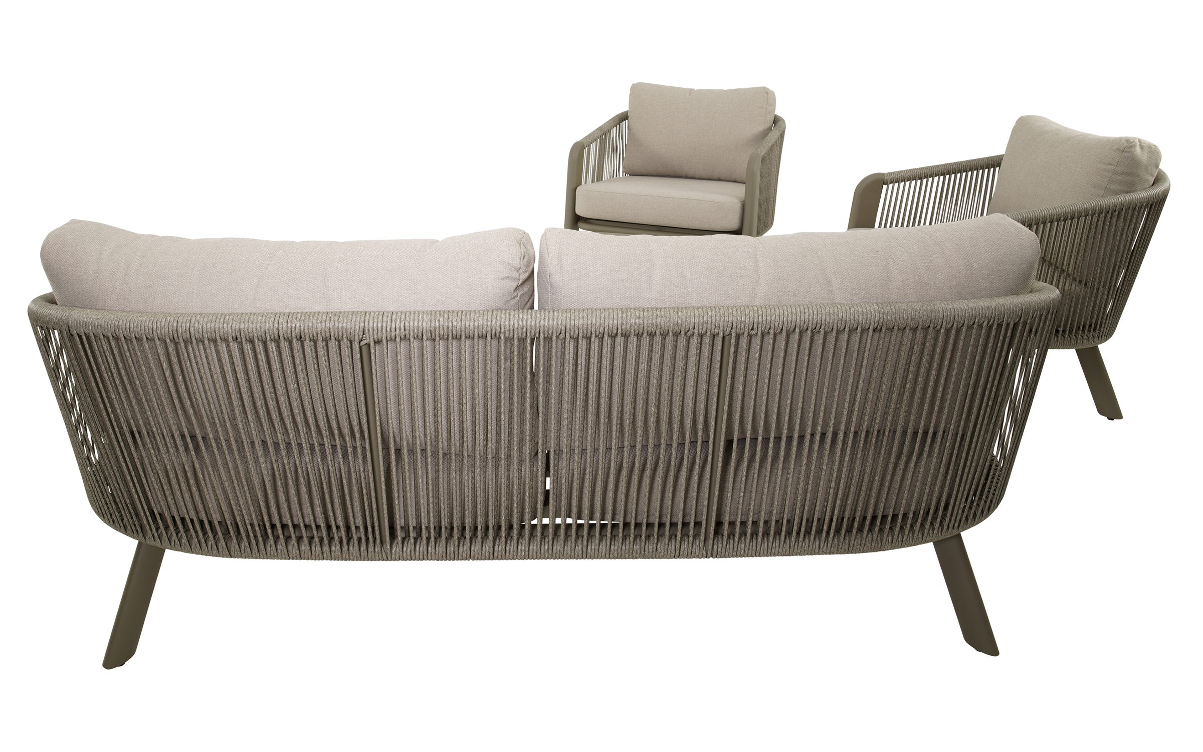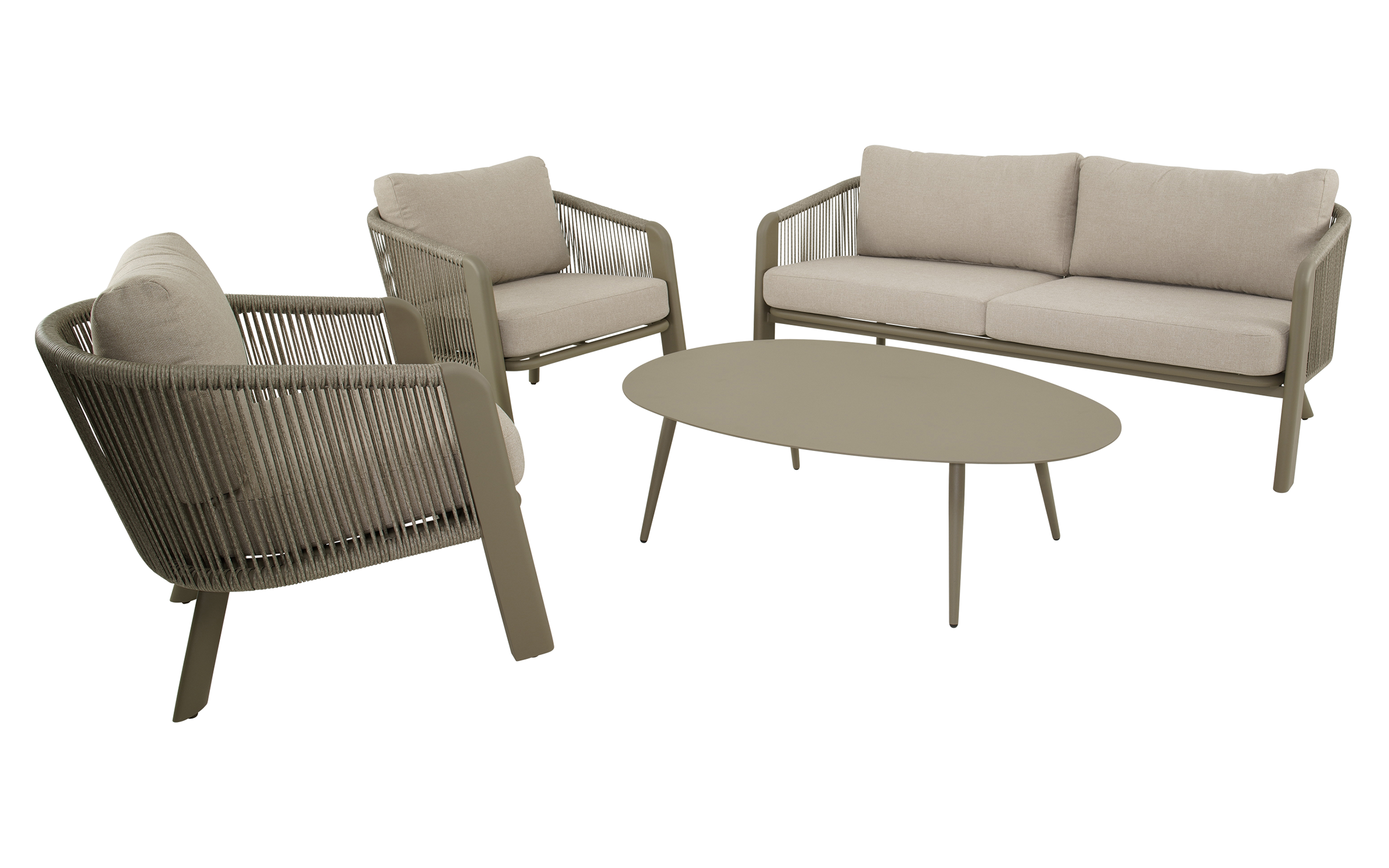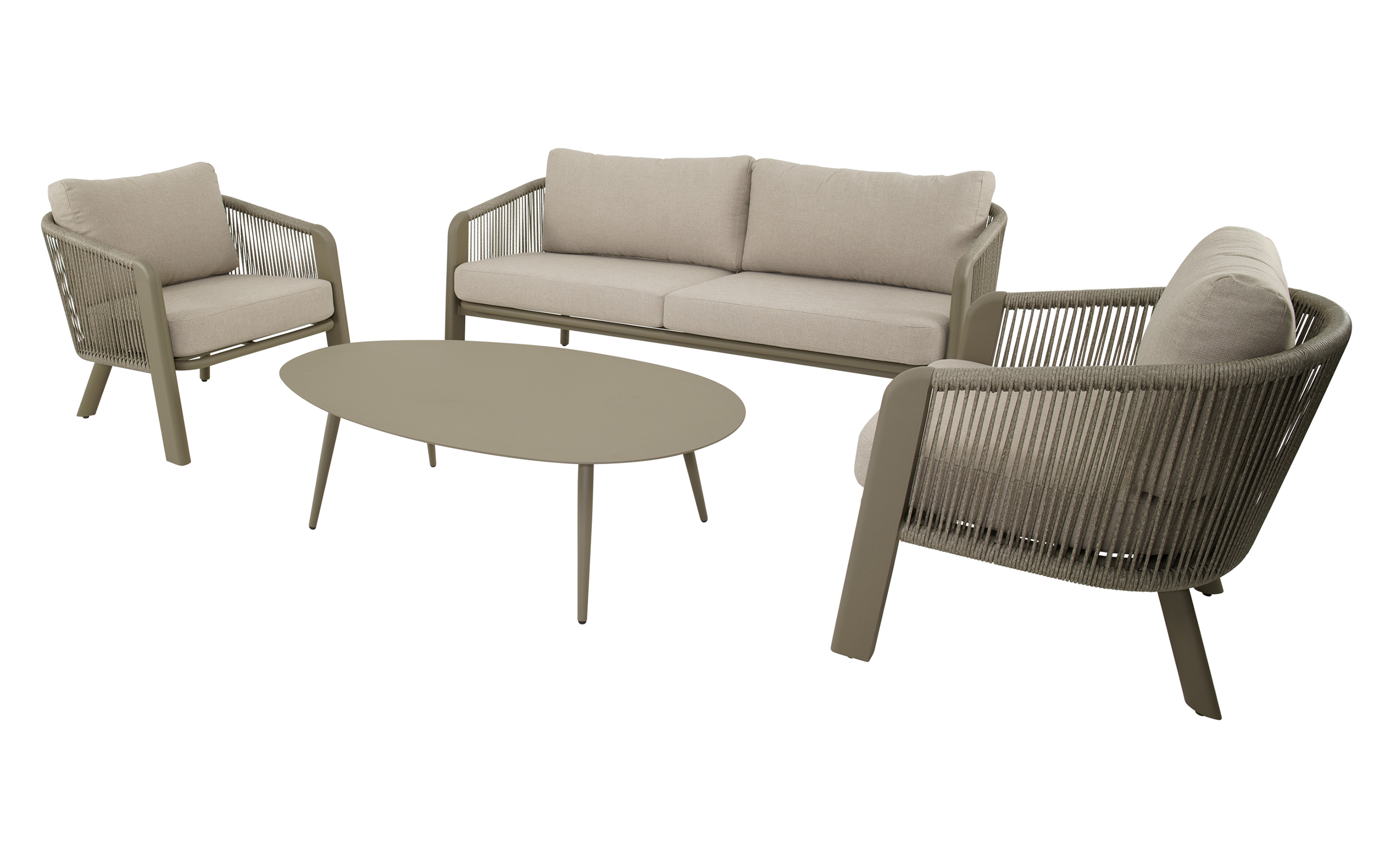 Zestaw lounge TANOA marki Lesli Living to elegancka propozycja do ogrodu lub na taras. W skład zestawu wchodzi sofa 2,5‑osobowa, dwa fotele oraz stolik kawowy. Konstrukcja wykonana z aluminium malowanego proszkowo w kolorze mat taupe zapewnia trwałość i odporność na warunki atmosferyczne. Boki i oparcia oplecione są liną polipropylenową Ø8 mm w kolorze taupe, co nadaje lekkości i zapewnia przewiewne, komfortowe siedzenie. Poduszki z tkaniny Olefin 240 g/m² są odporne na wilgoć, promieniowanie UV i zabrudzenia. Stolik wyposażony jest w aluminiowy blat o grubości 2,5 mm.