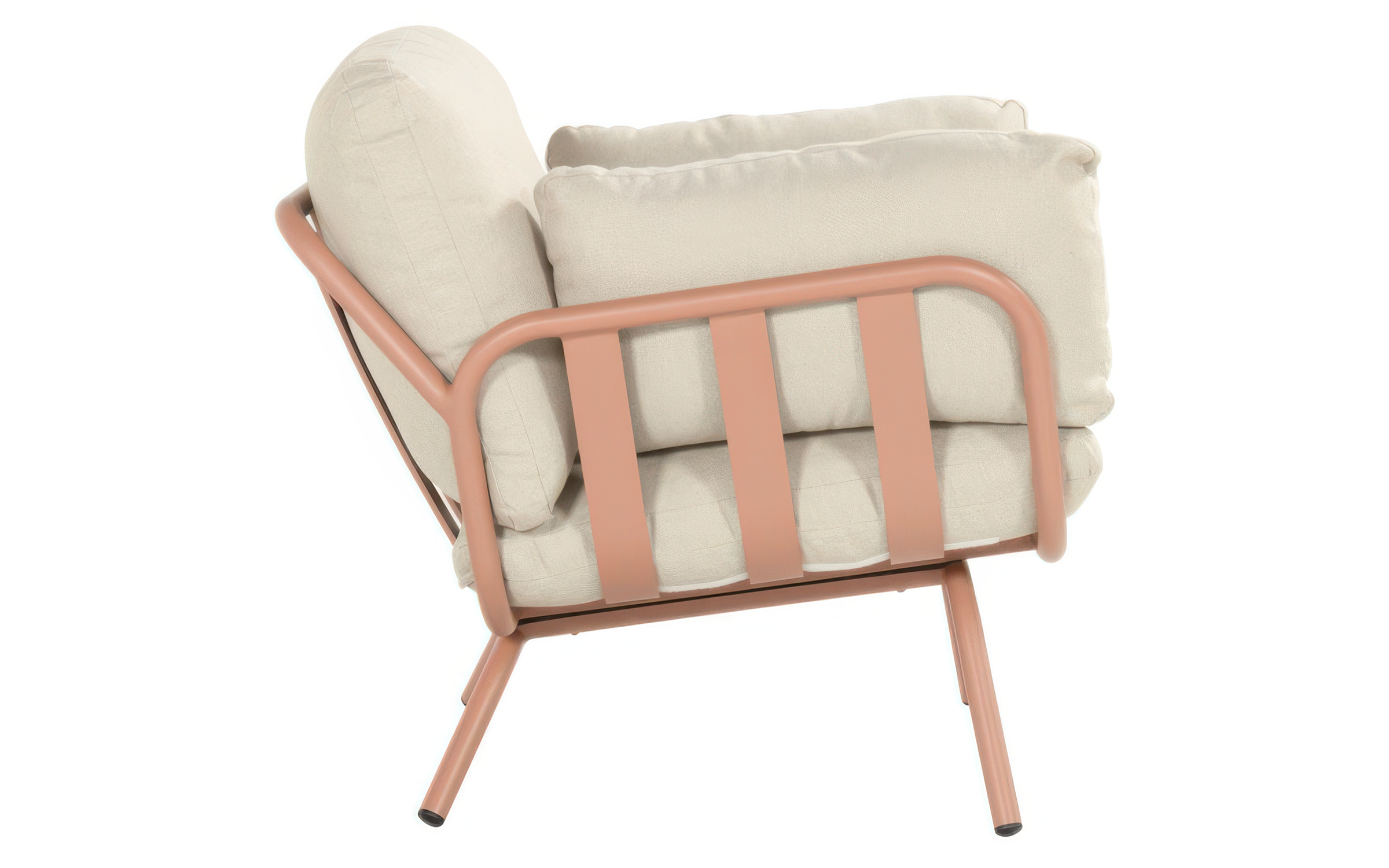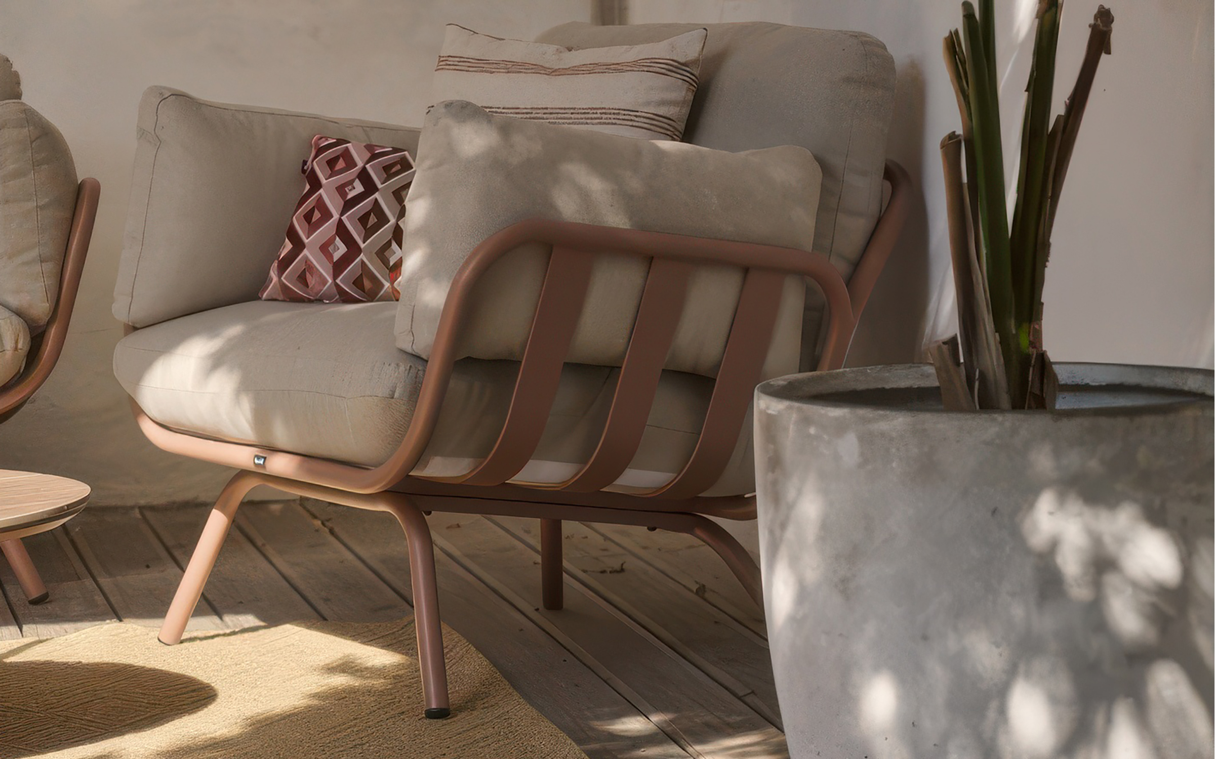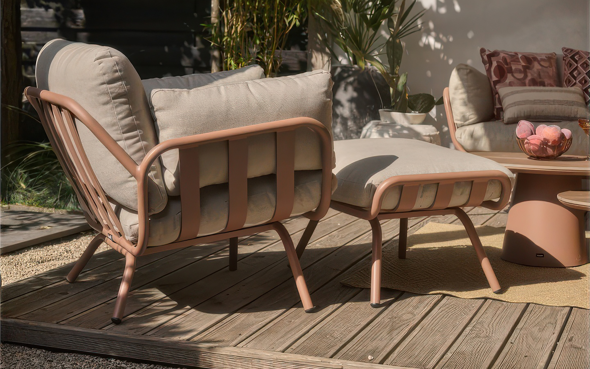 Konstrukcja z aluminium, poduszki z poliesteru z silikonem. Materiały odporne na wilgoć, promieniowanie UV i zabrudzenia. Łatwe w pielęgnacji, nie wymagają impregnacji.