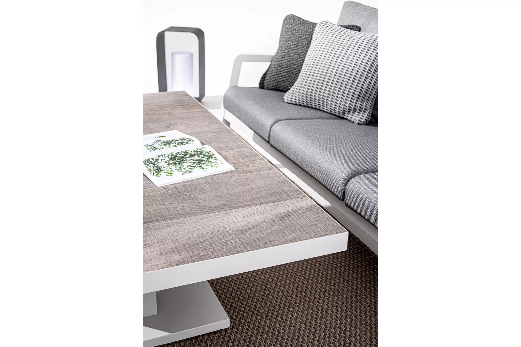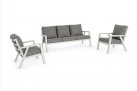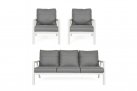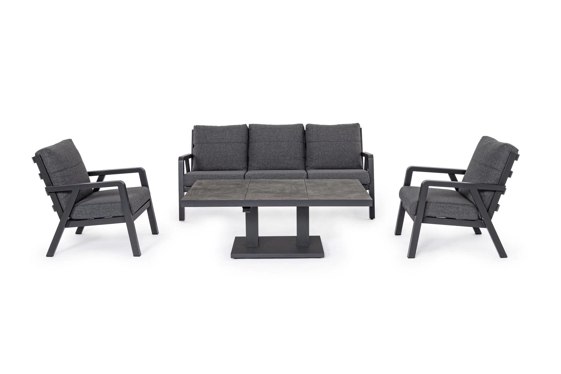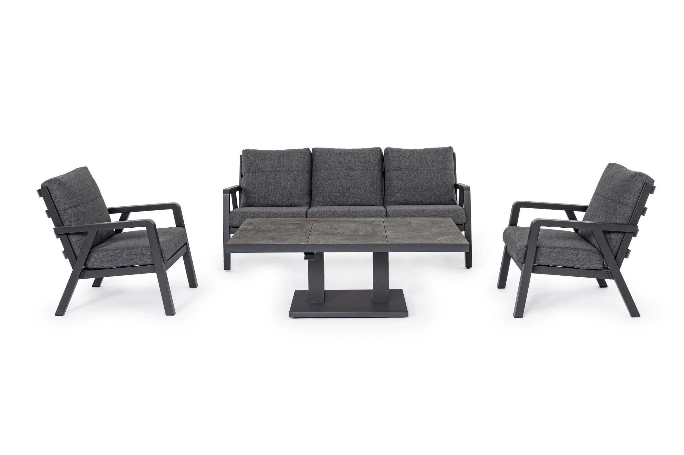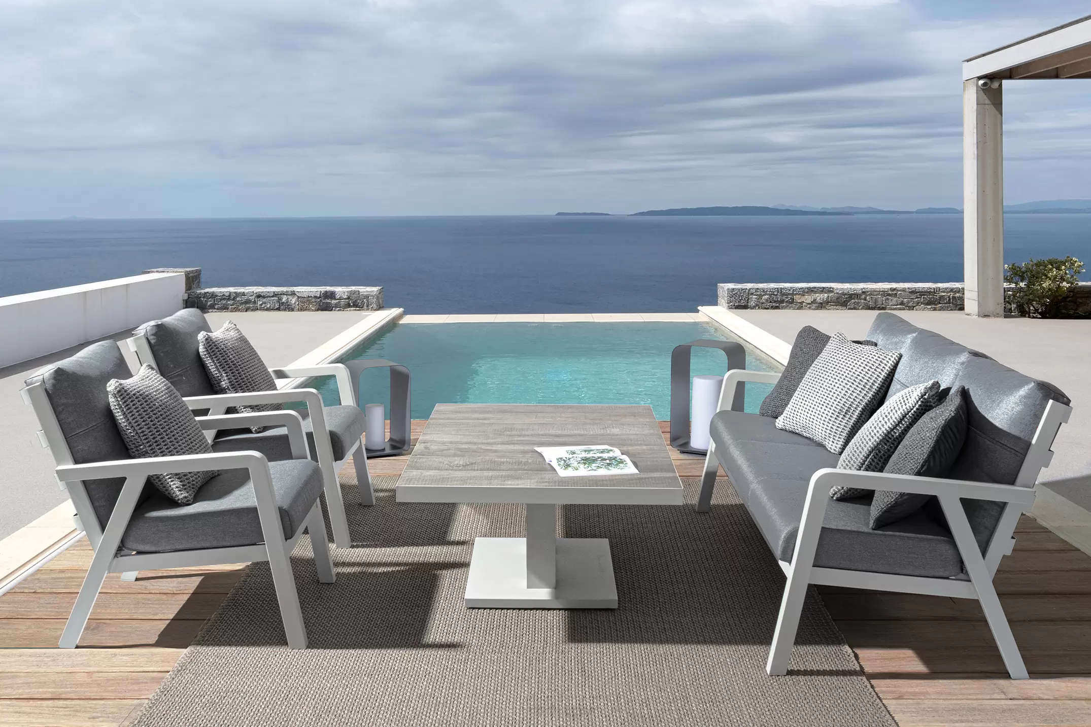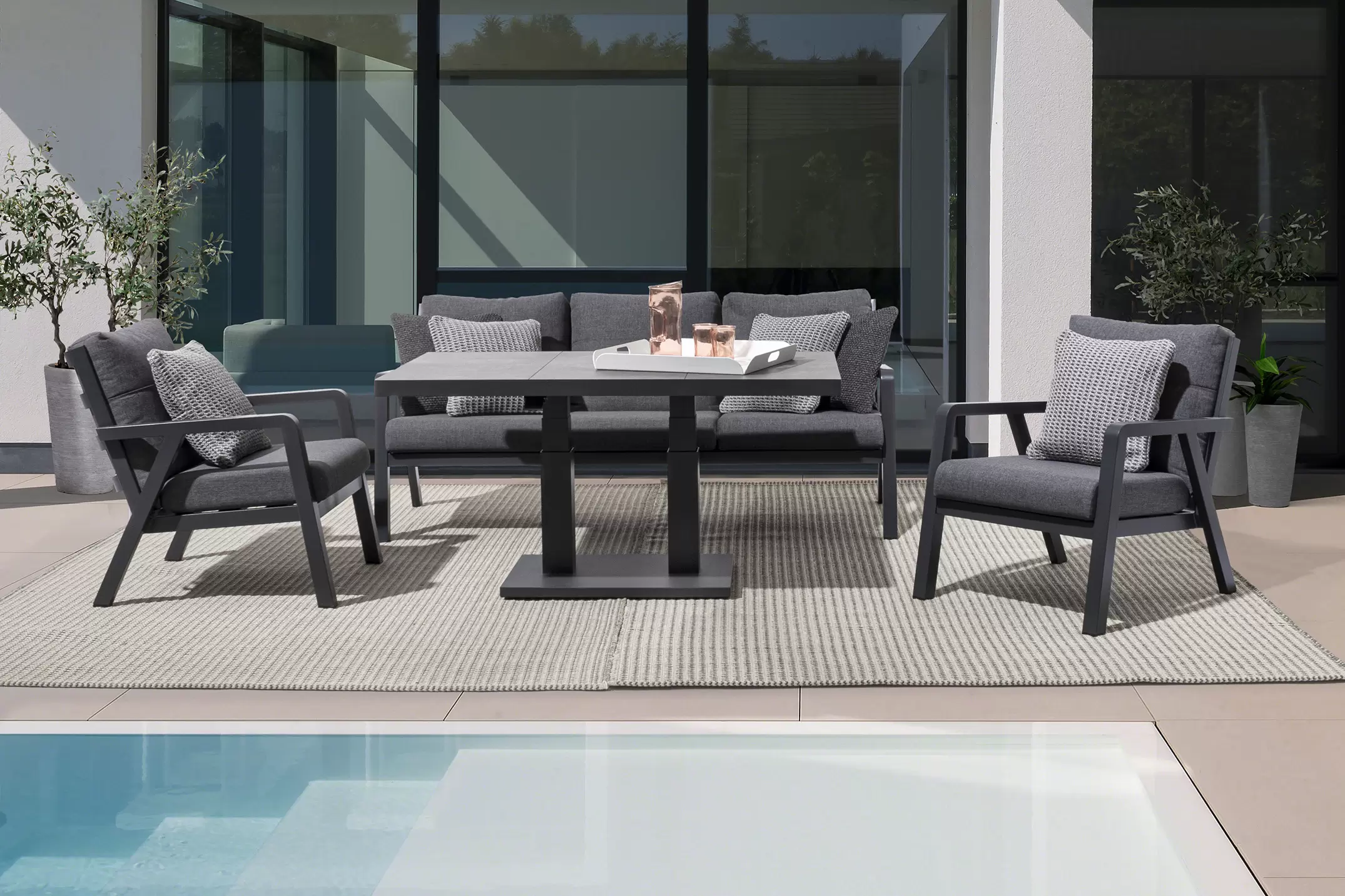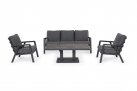 Zestaw aluminiowy ogrodowy z szeroką sofą i wysokimi oparciami. Każdy element zestawu można nabyć osobno. W komplecie stolik z płynnie podnoszonym blatem ceramicznym.