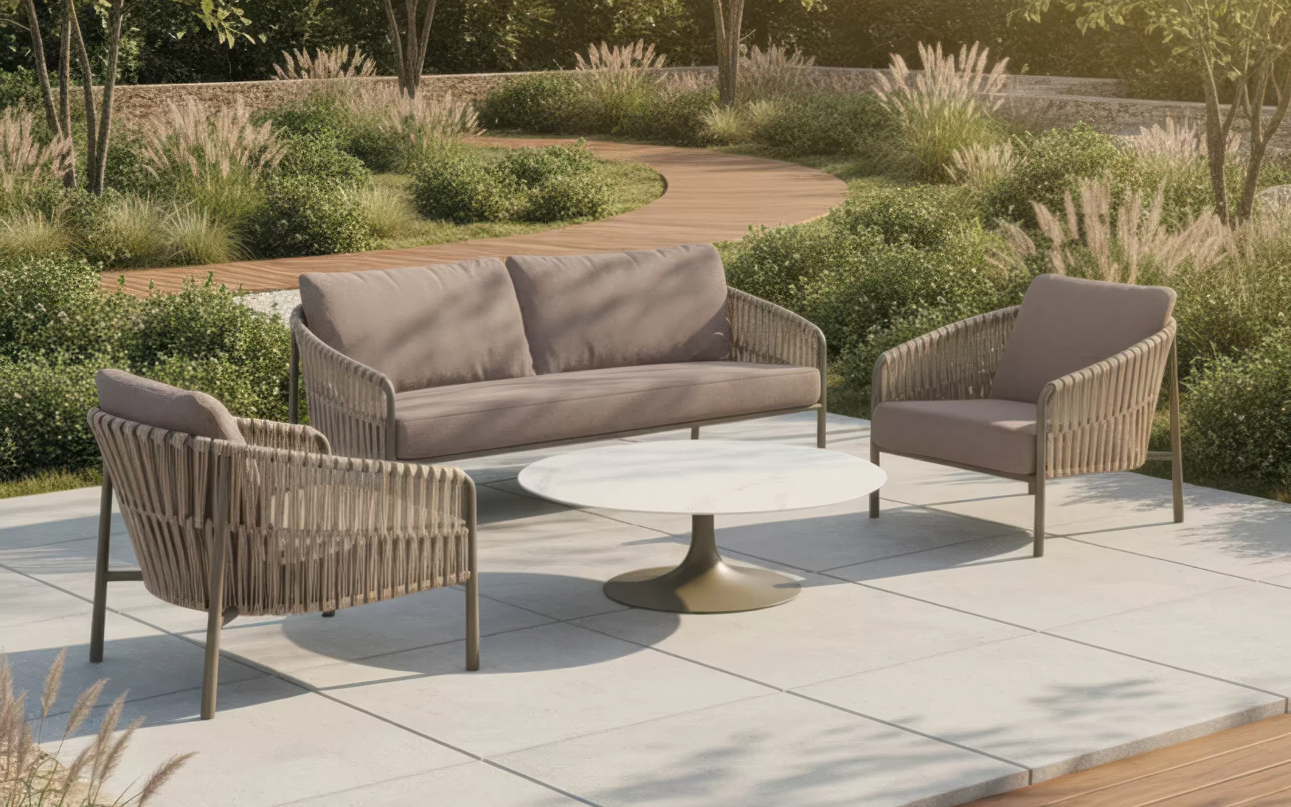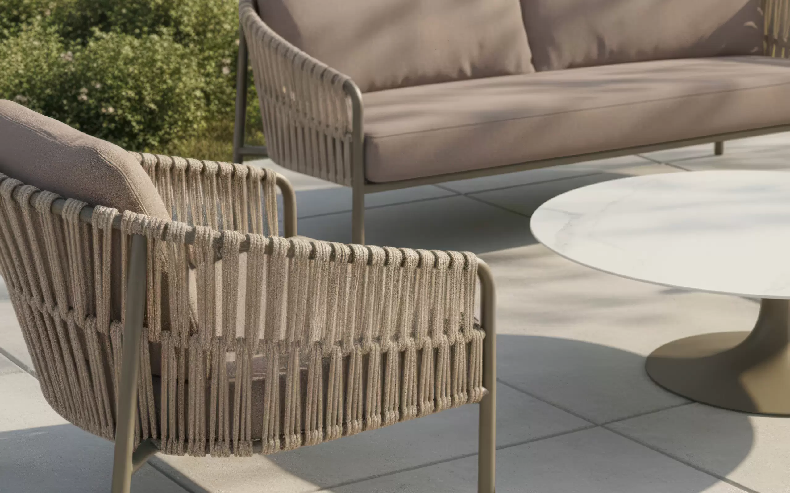 W skład kolekcji wchodzi komfortowa sofa 2,5-osobowa, dwa obszerne fotele oraz centralny punkt układu – okrągły stolik kawowy. Stelaż mebli wykonano z aluminium w modnym odcieniu taupe, co zapewnia konstrukcji "architektoniczną lekkość" przy zachowaniu maksymalnej odporności na czynniki zewnętrzne. Stolik wyposażono w ceramiczny blat w odcieniu oyster, którego jasna, perłowa tonacja stanowi subtelny kontrast dla beżowej ramy i nadaje całości biżuteryjnego wykończenia.