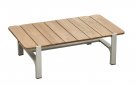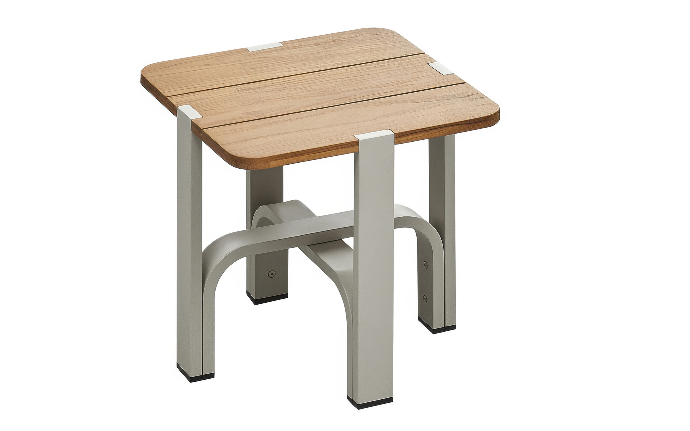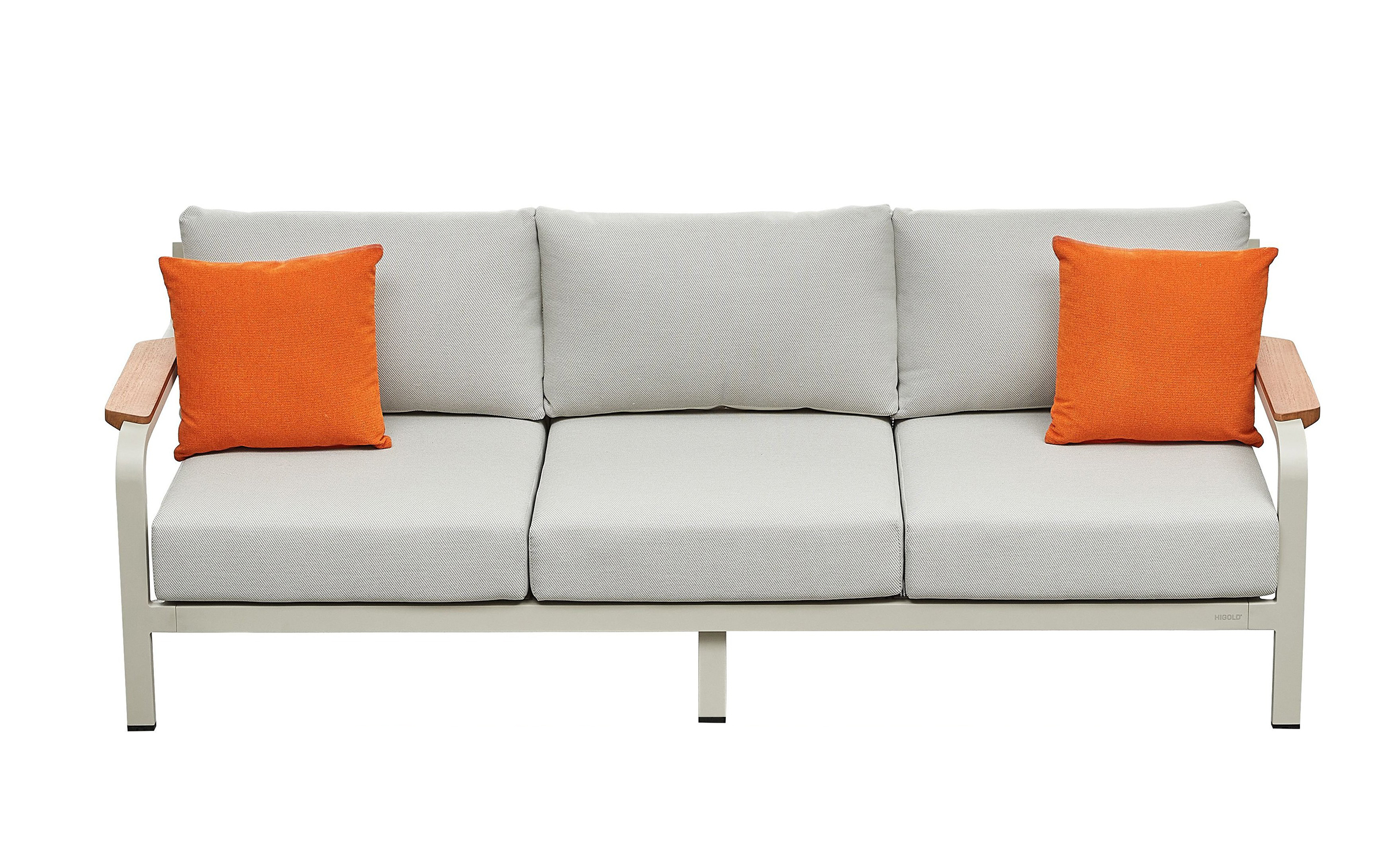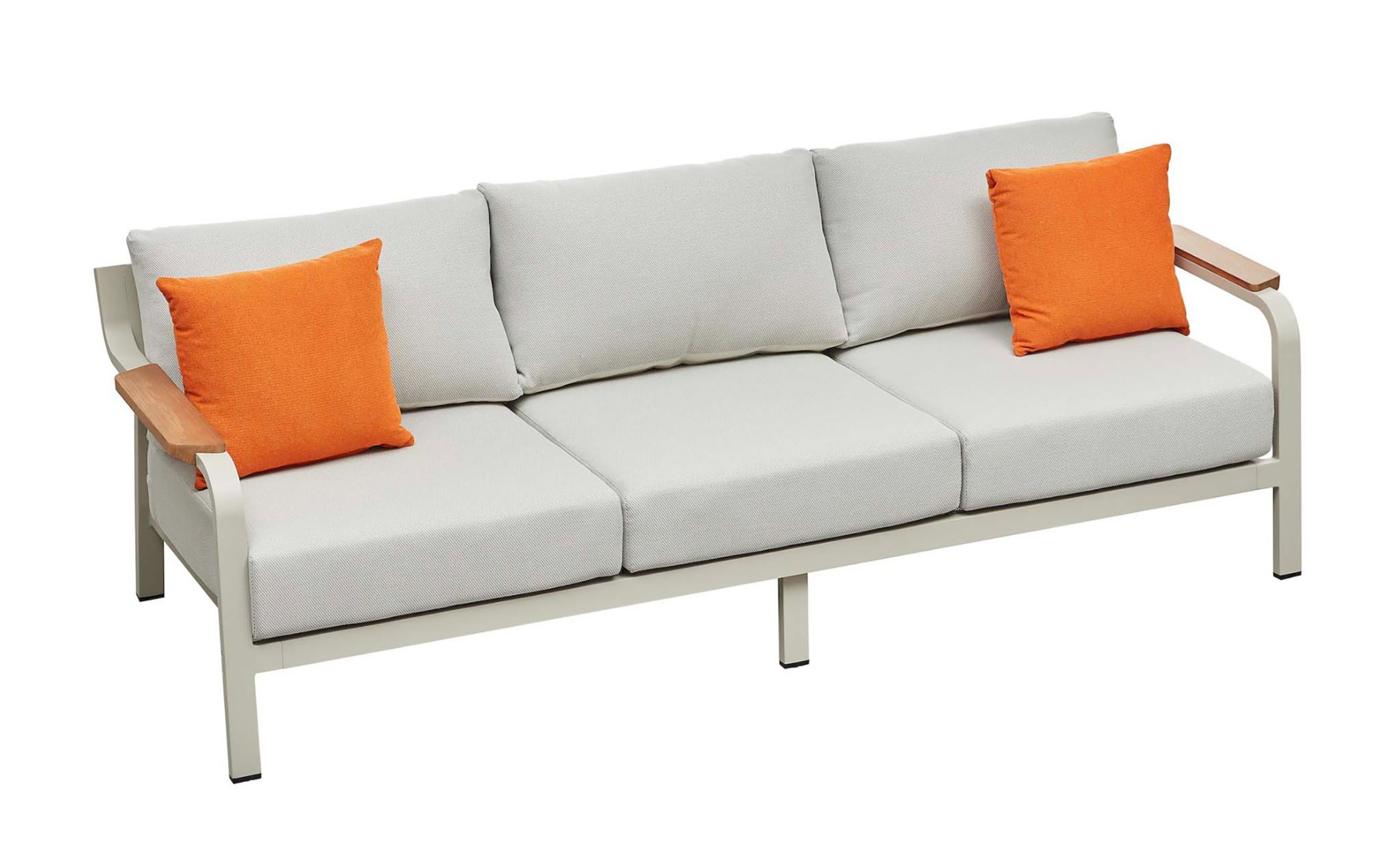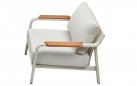 Rama aluminiowa malowana proszkowo, odporna na korozję. Siedziska i oparcia wykonane z siatki textilene UVprotect, zapewniającej trwałość i odporność na promieniowanie słoneczne. Poduszki tapicerowane tkaniną olefinową, wodoodporną i szybkoschnącą. Podłokietniki oraz blat stolika wykończone naturalnym drewnem teakowym, co nadaje zestawowi luksusowy charakter.
