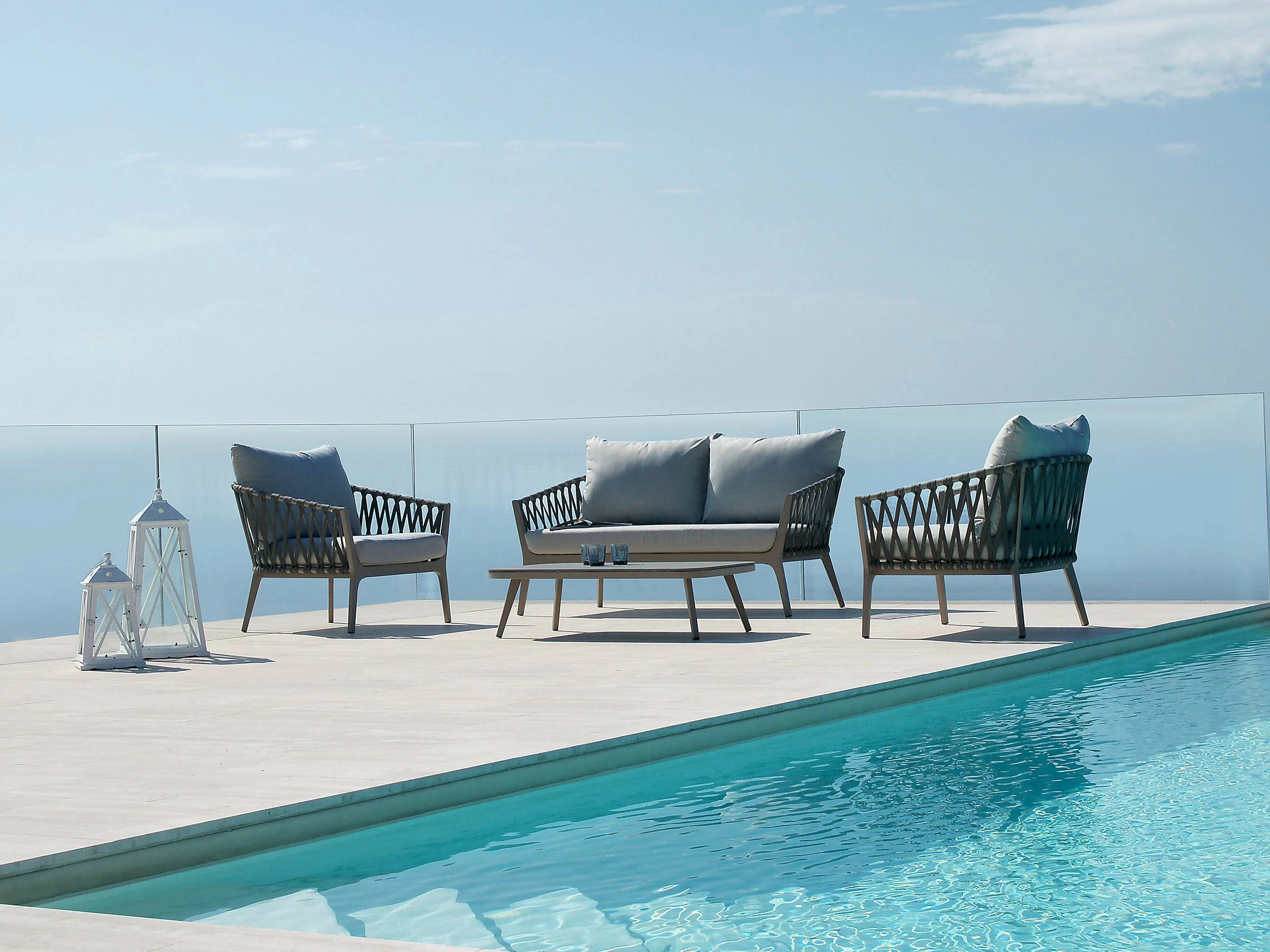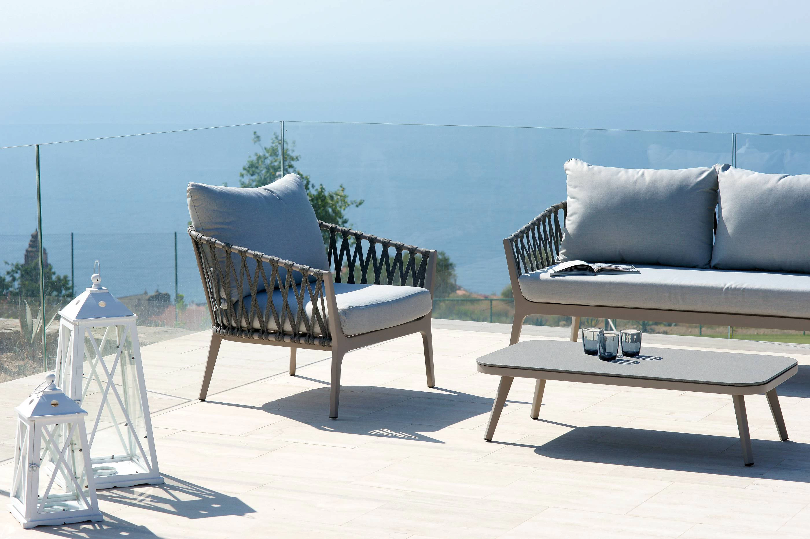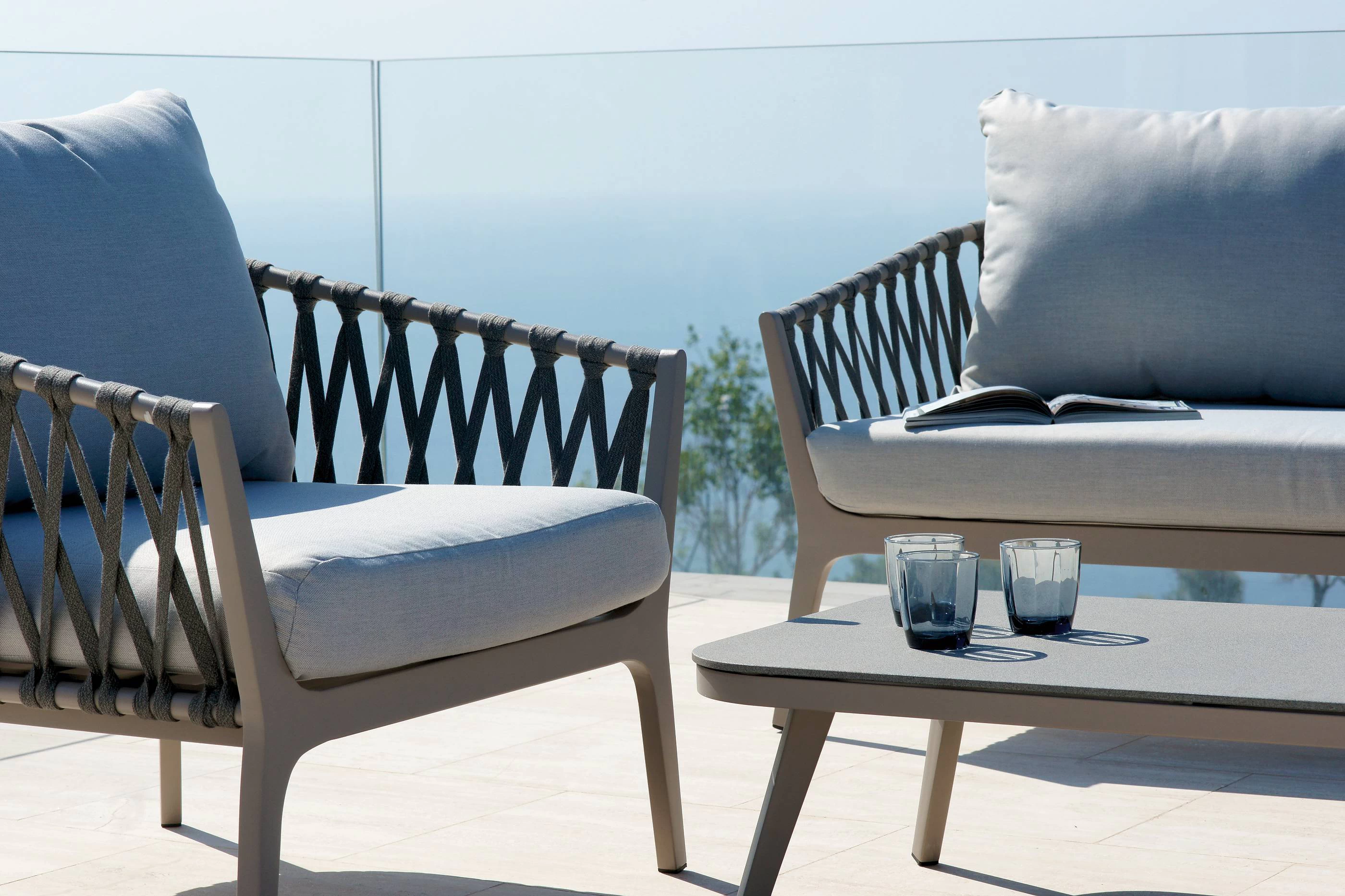 Zestaw Washington składa się z dwóch foteli, dwuosobowej sofy oraz stolika kawowego z kamiennym szklanym blatem. Aluminiowa konstrukcja w kolorze szarym gołębim z szarą syntetyczną liną. Poduszki ze zdejmowanymi poszewkami z poliestru 280 g, kolor jasnoszary. ruby ze stali nierdzewnej.