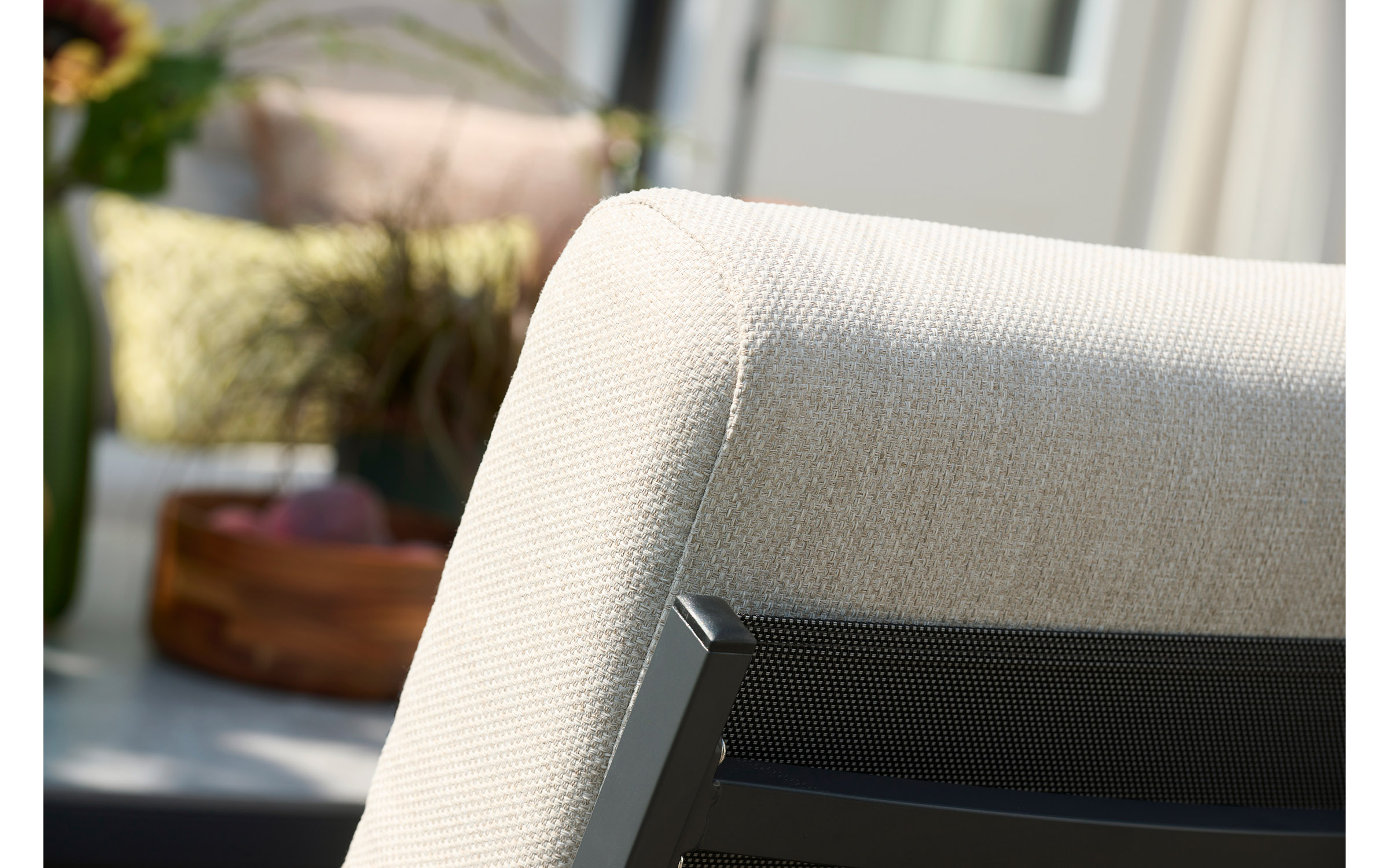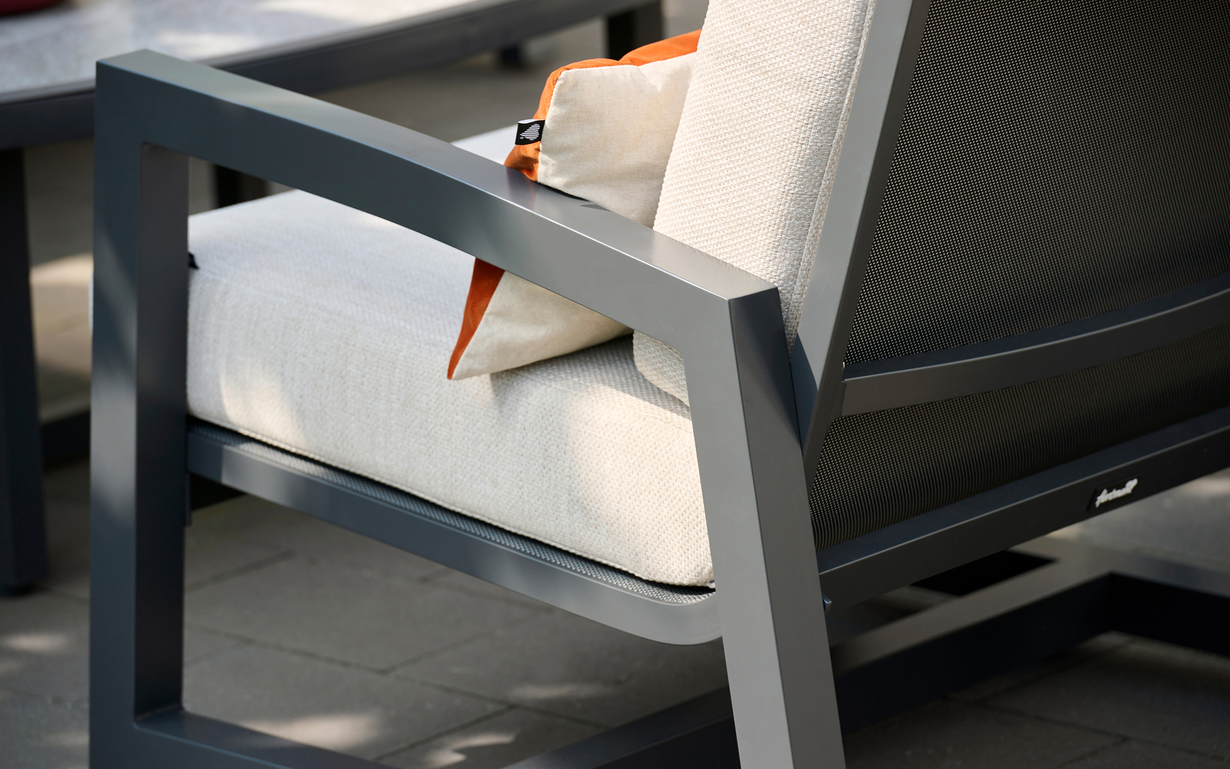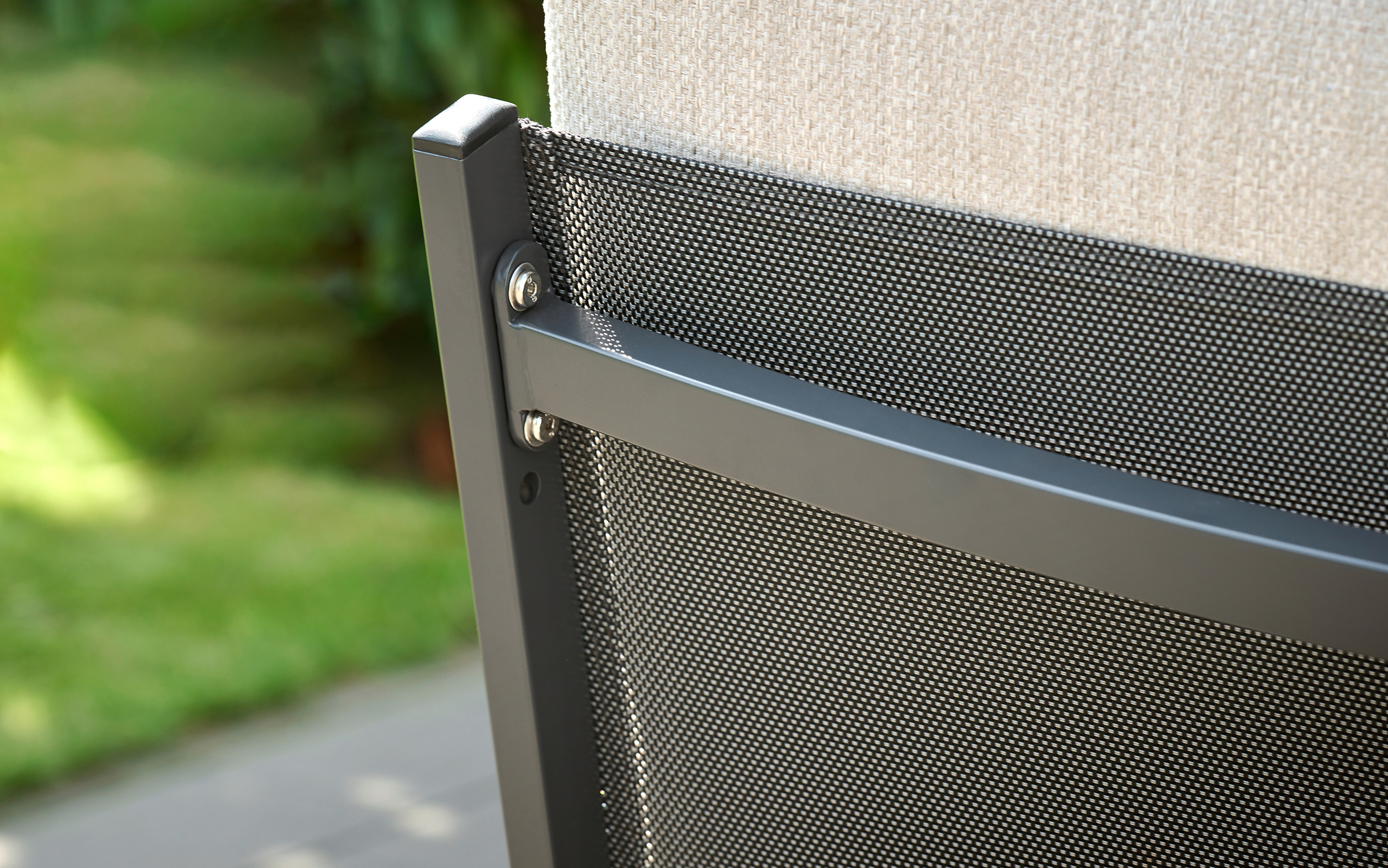 - Poduszki: tkanina olefin szarobeżowa – szybkoschnąca, odporna na wodę, promienie słoneczne i zabrudzenia