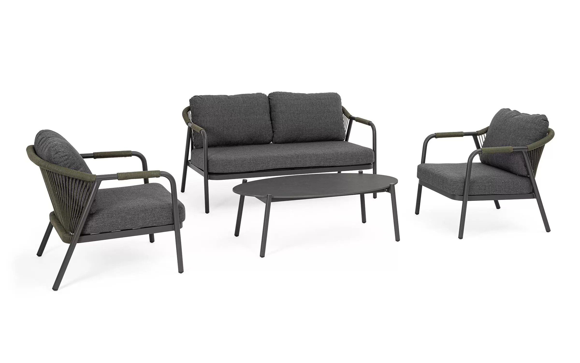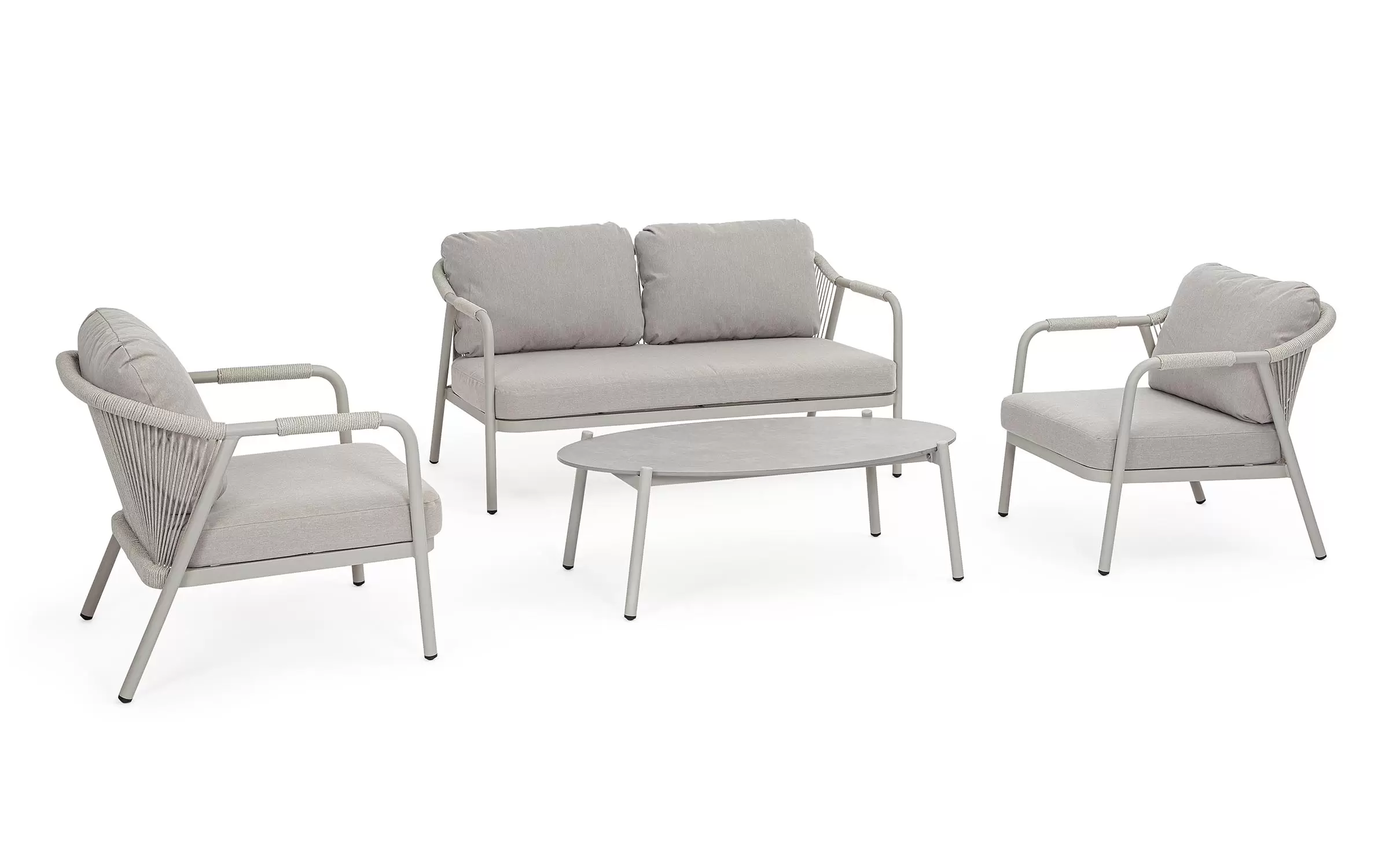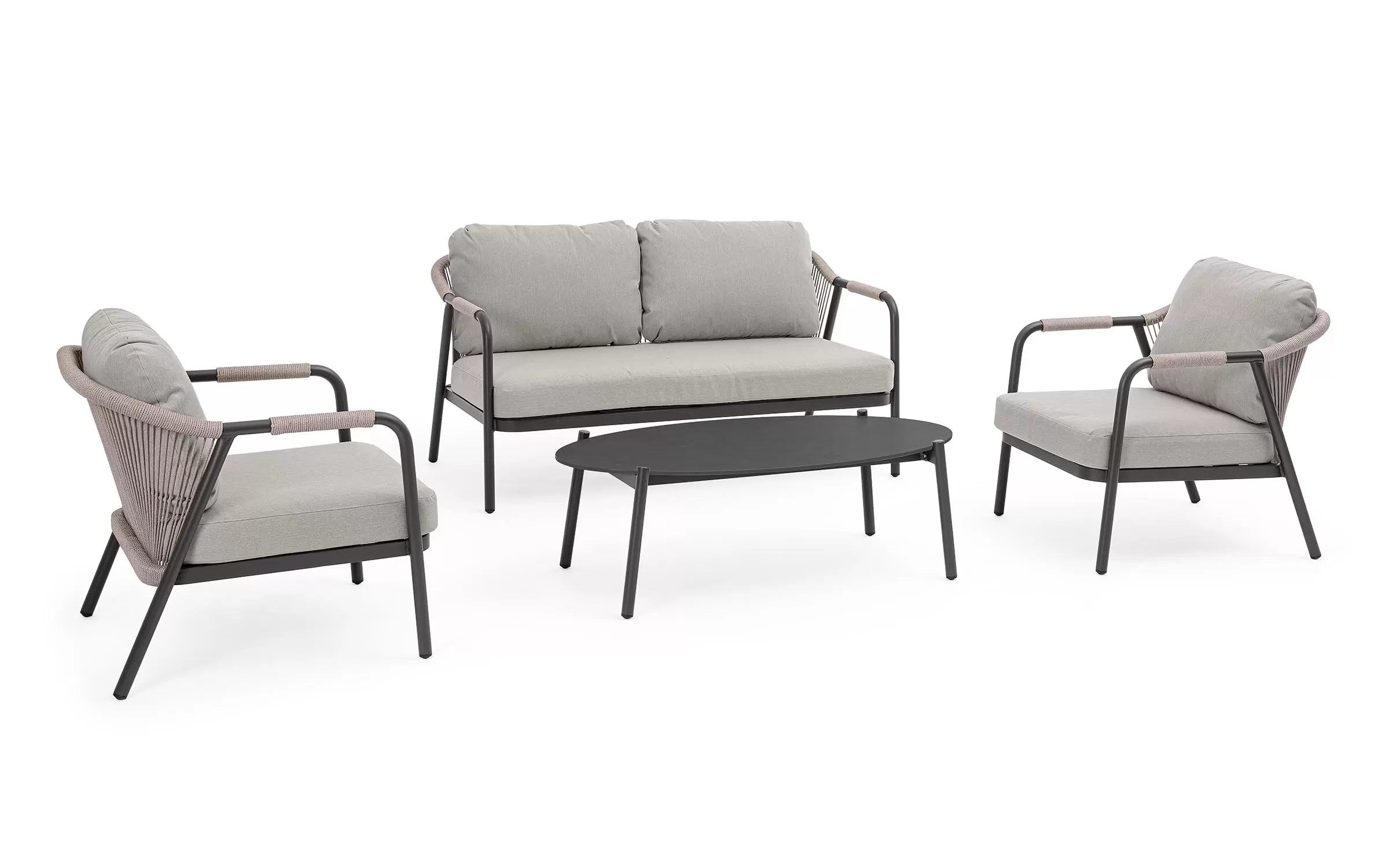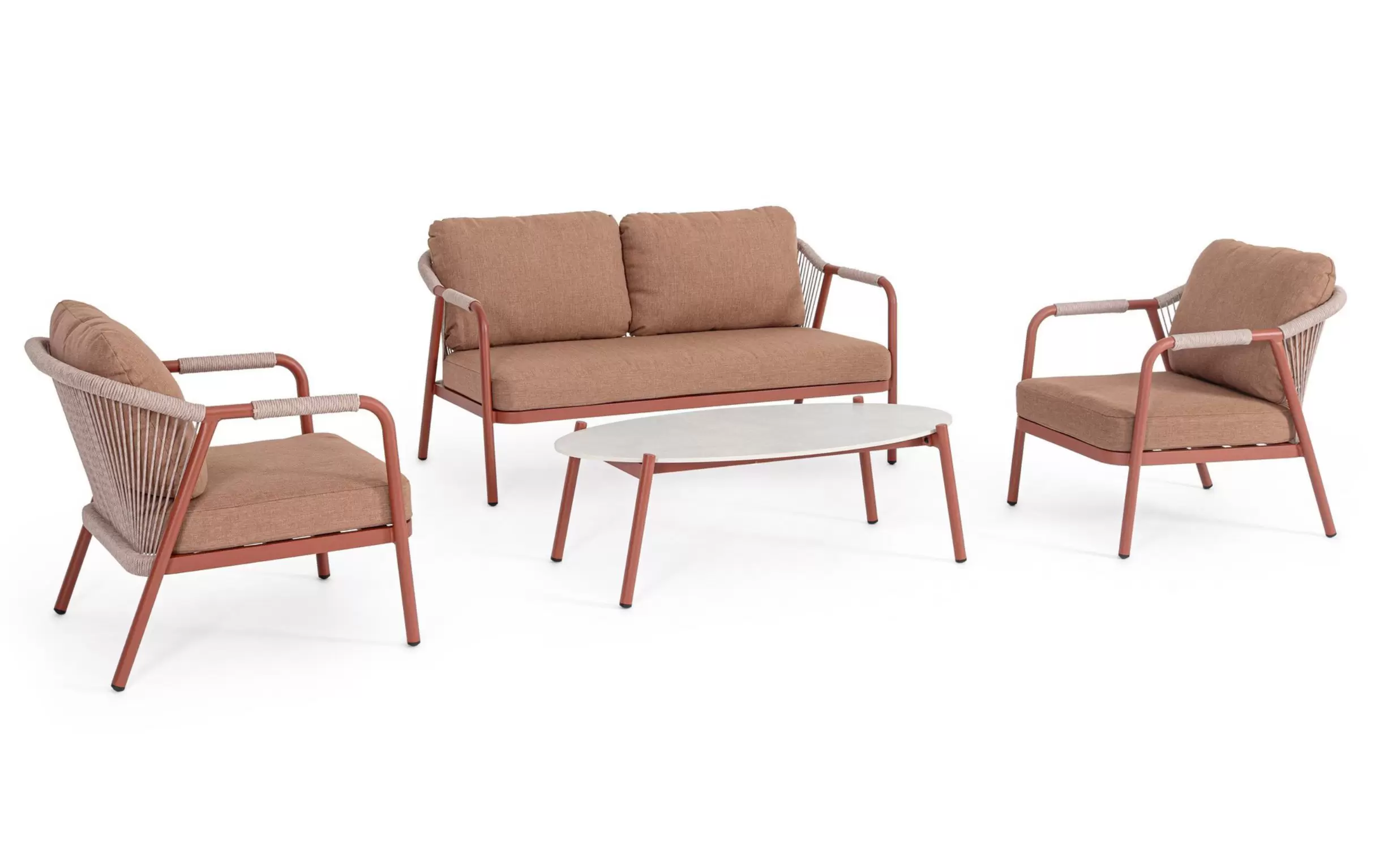 Meble ogrodowe dla 4 osób z 2-sobową sofą, 2 fotelami i owalnym stolikiem z blatem z kamienia spiekanego.