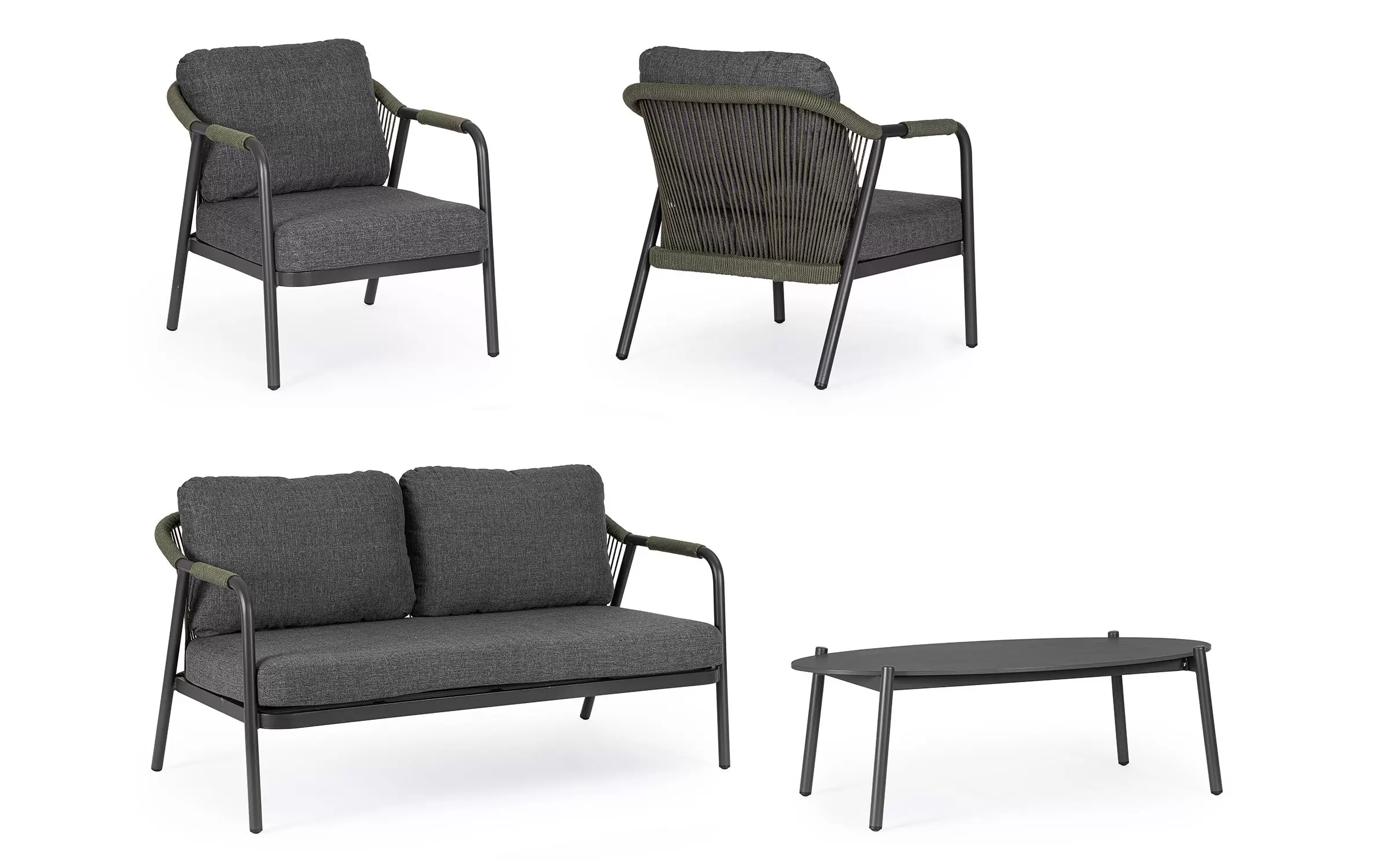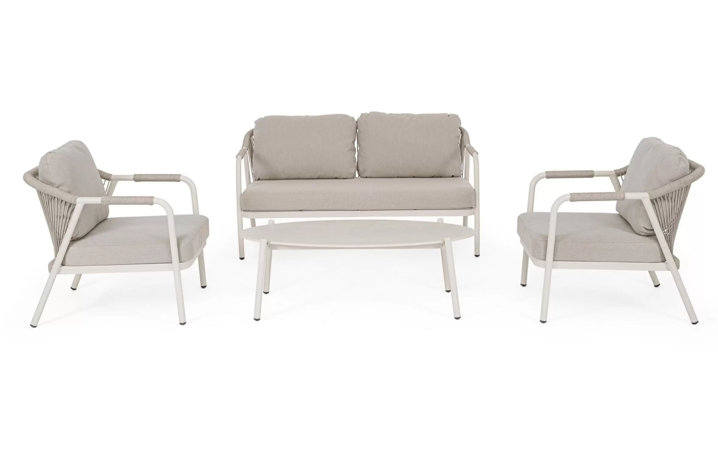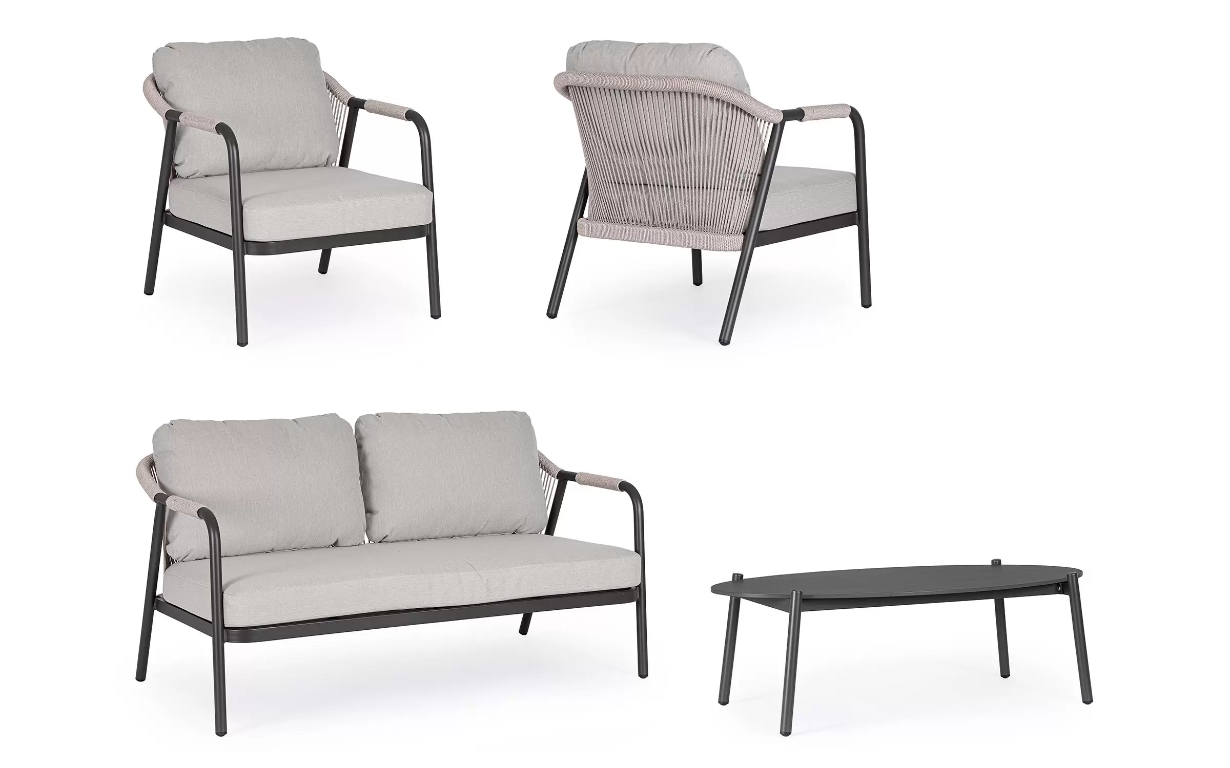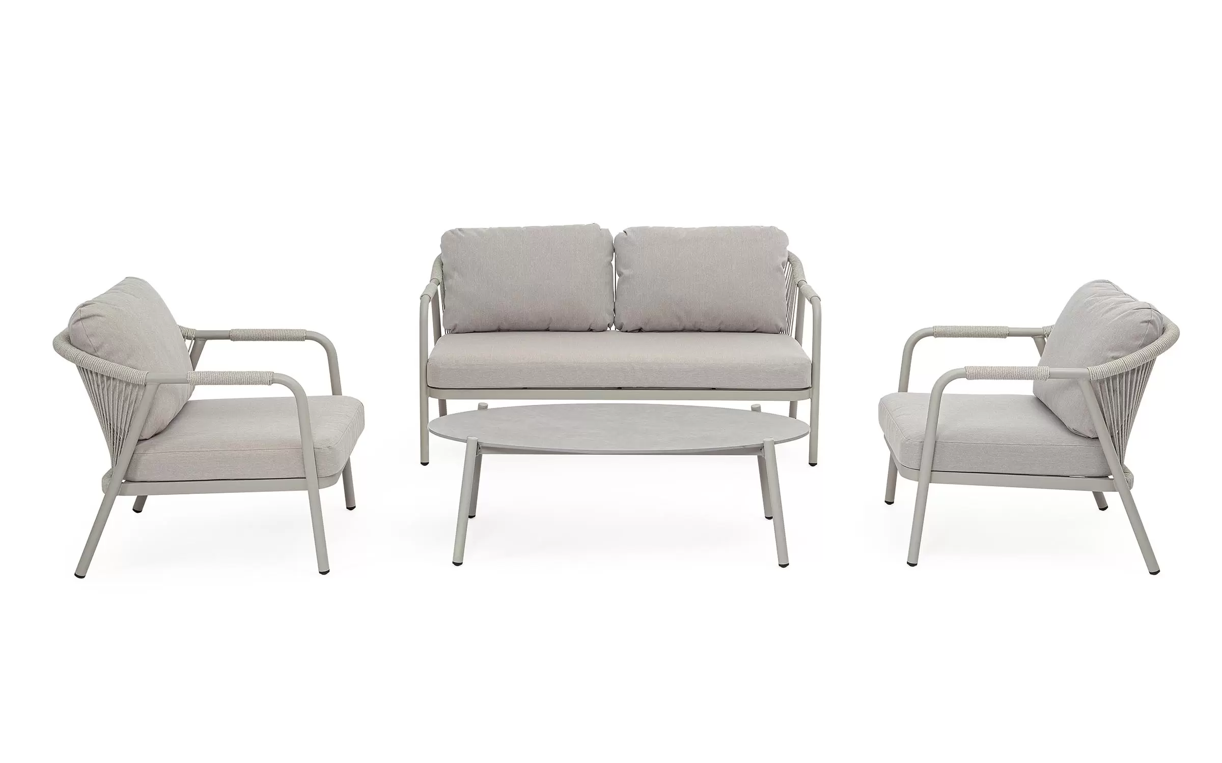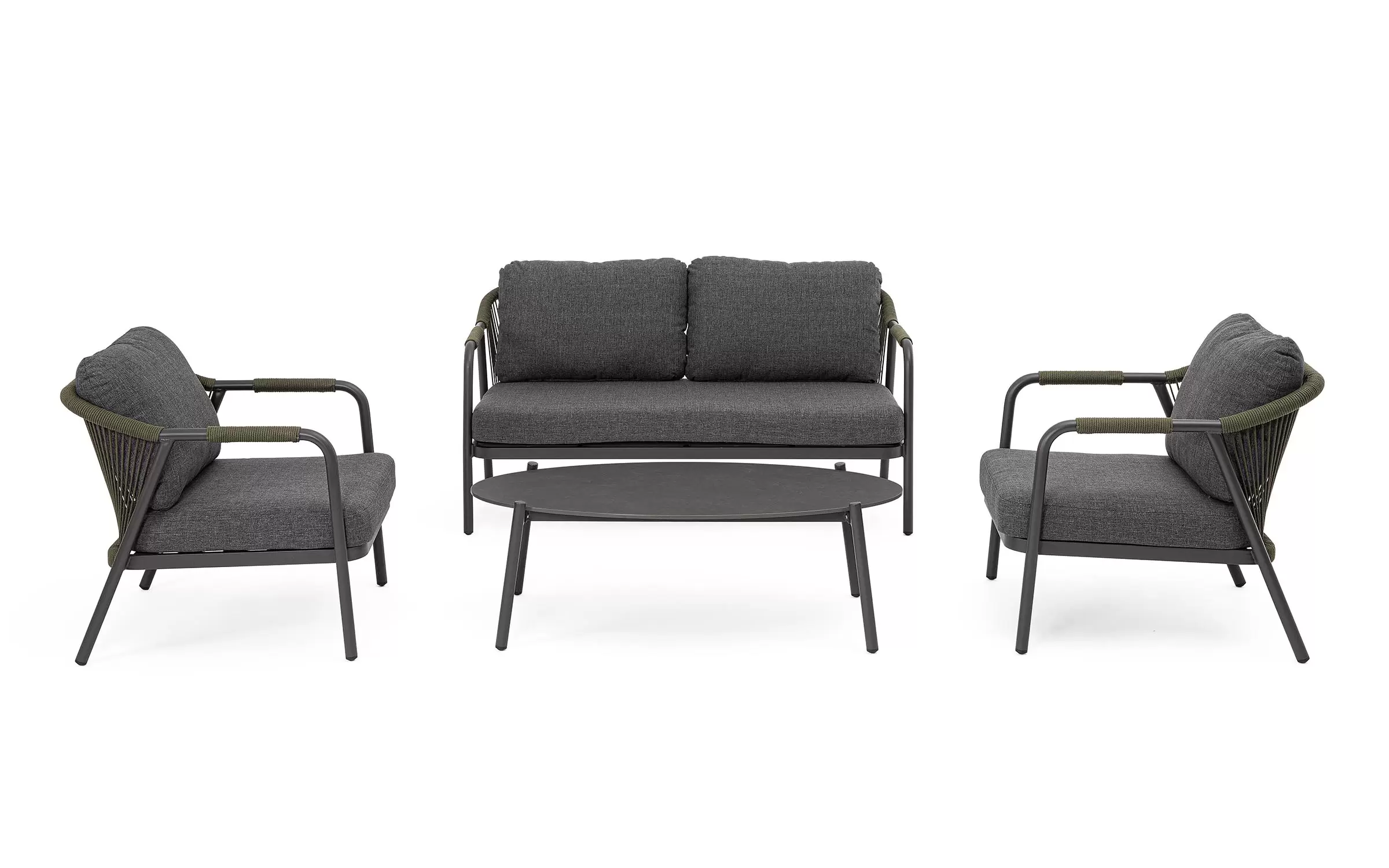 Meble ogrodowe dla 4 osób z 2-sobową sofą, 2 fotelami i owalnym stolikiem z blatem z kamienia spiekanego.