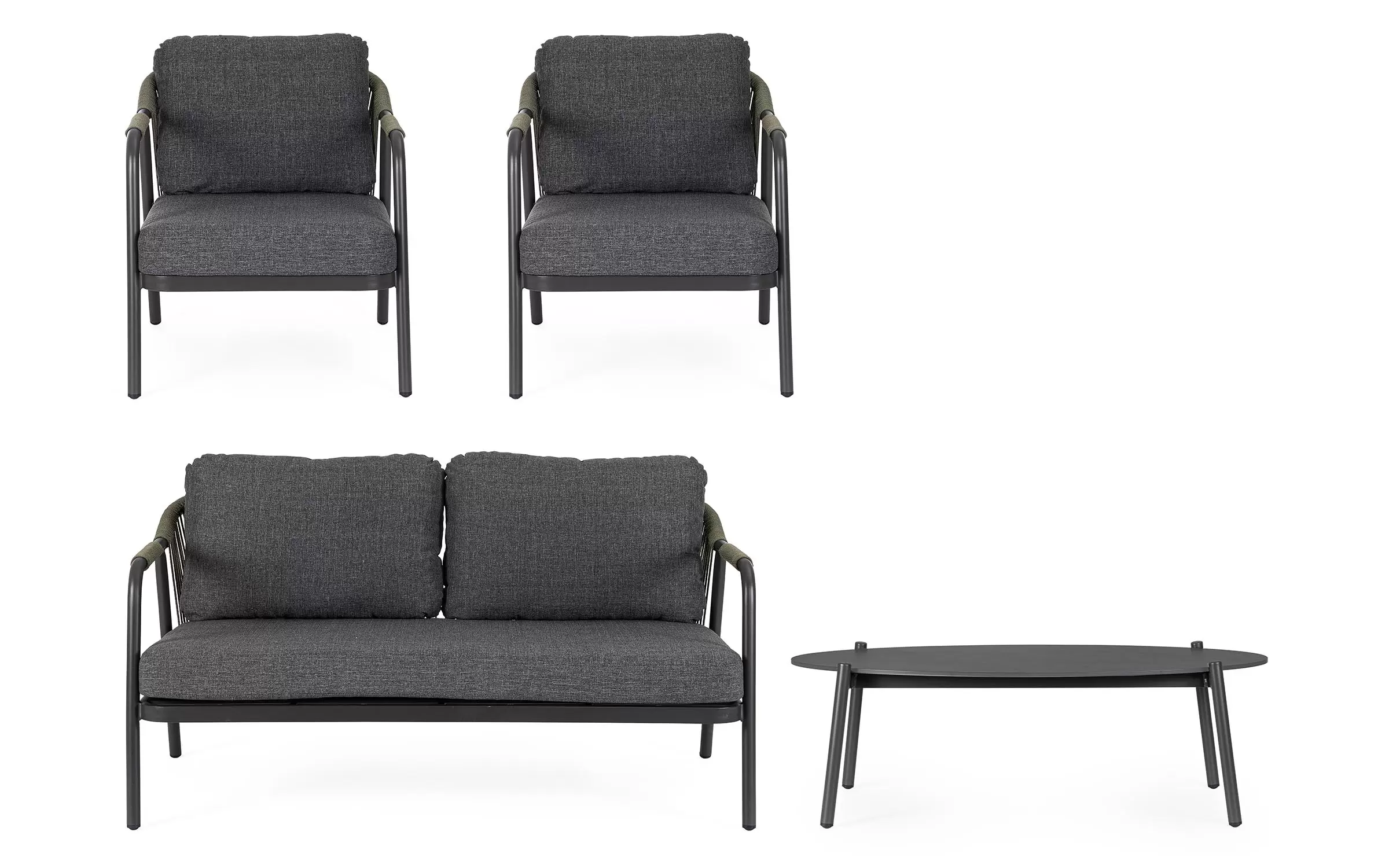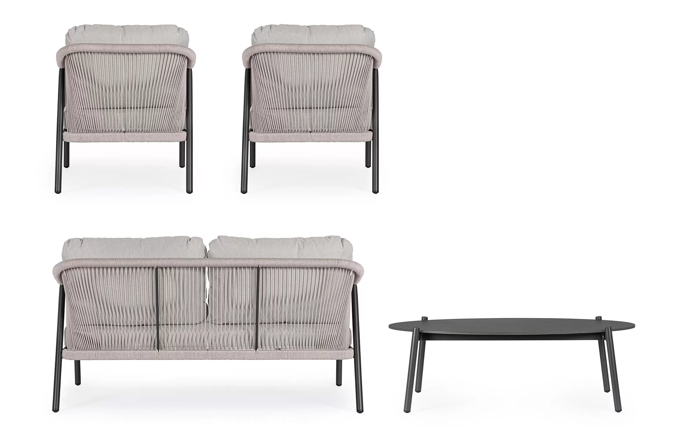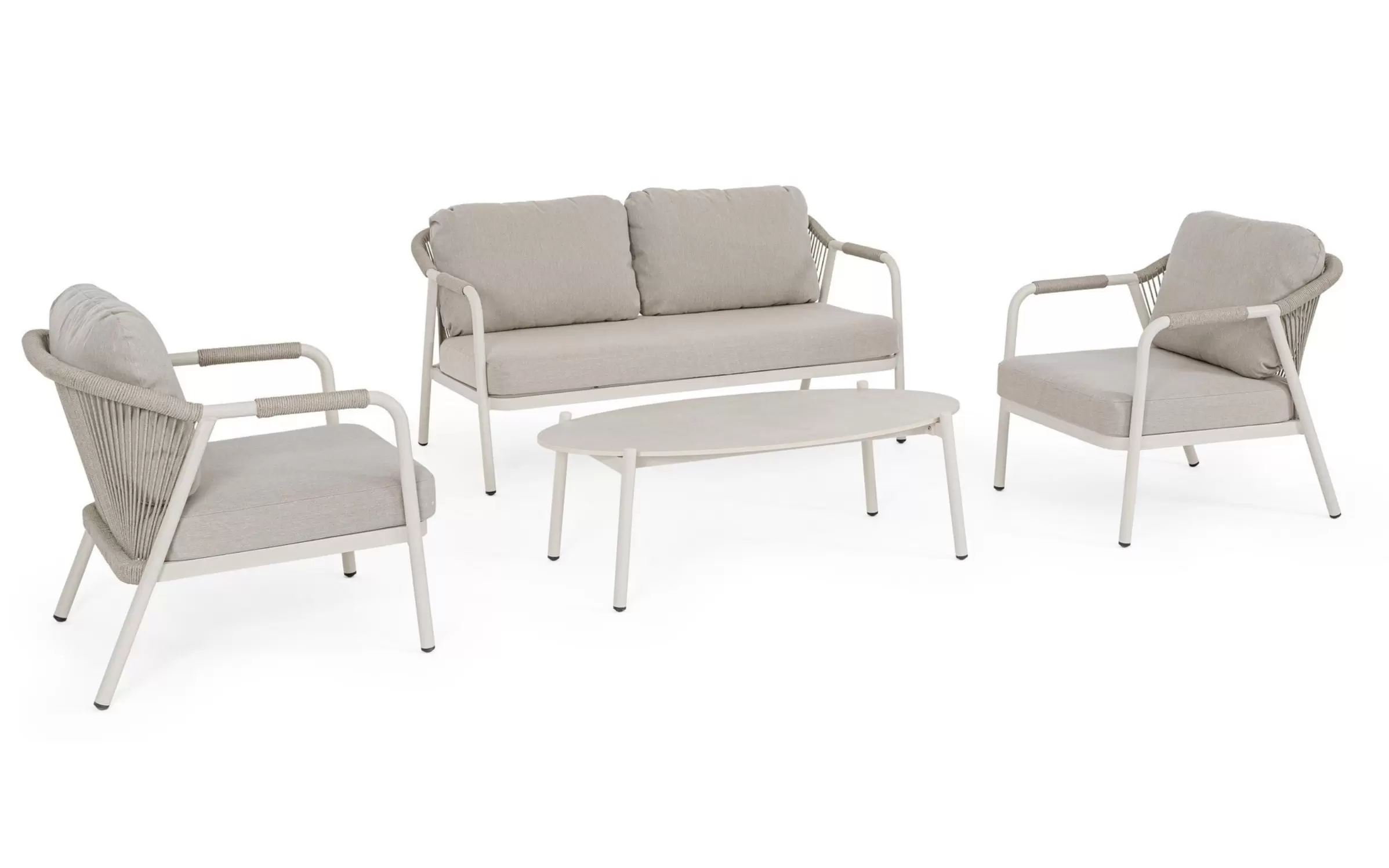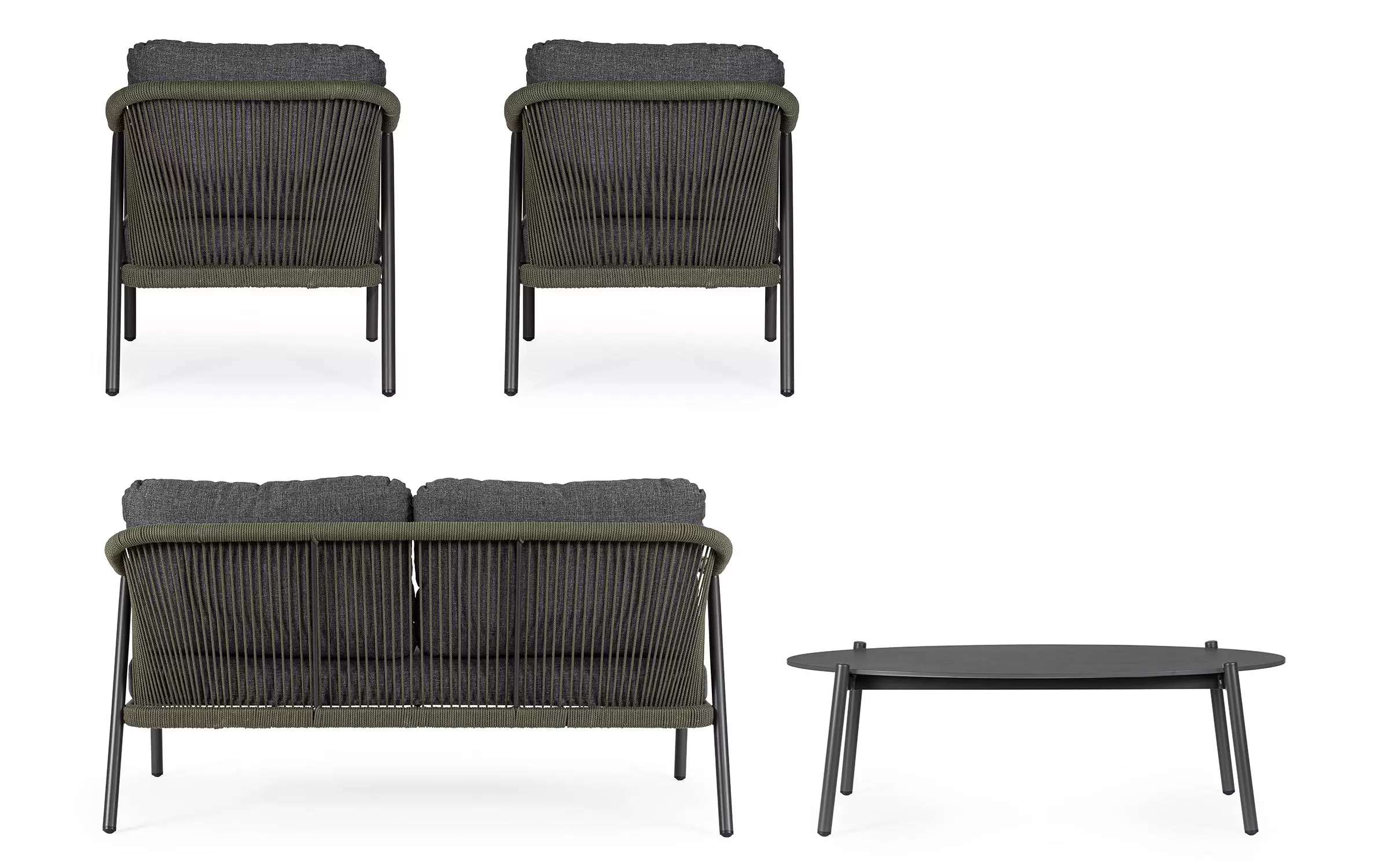 Meble ogrodowe dla 4 osób z 2-sobową sofą, 2 fotelami i owalnym stolikiem z blatem z kamienia spiekanego.