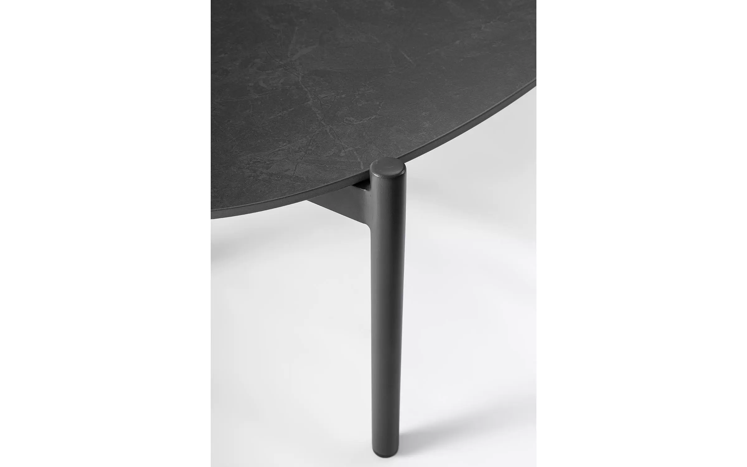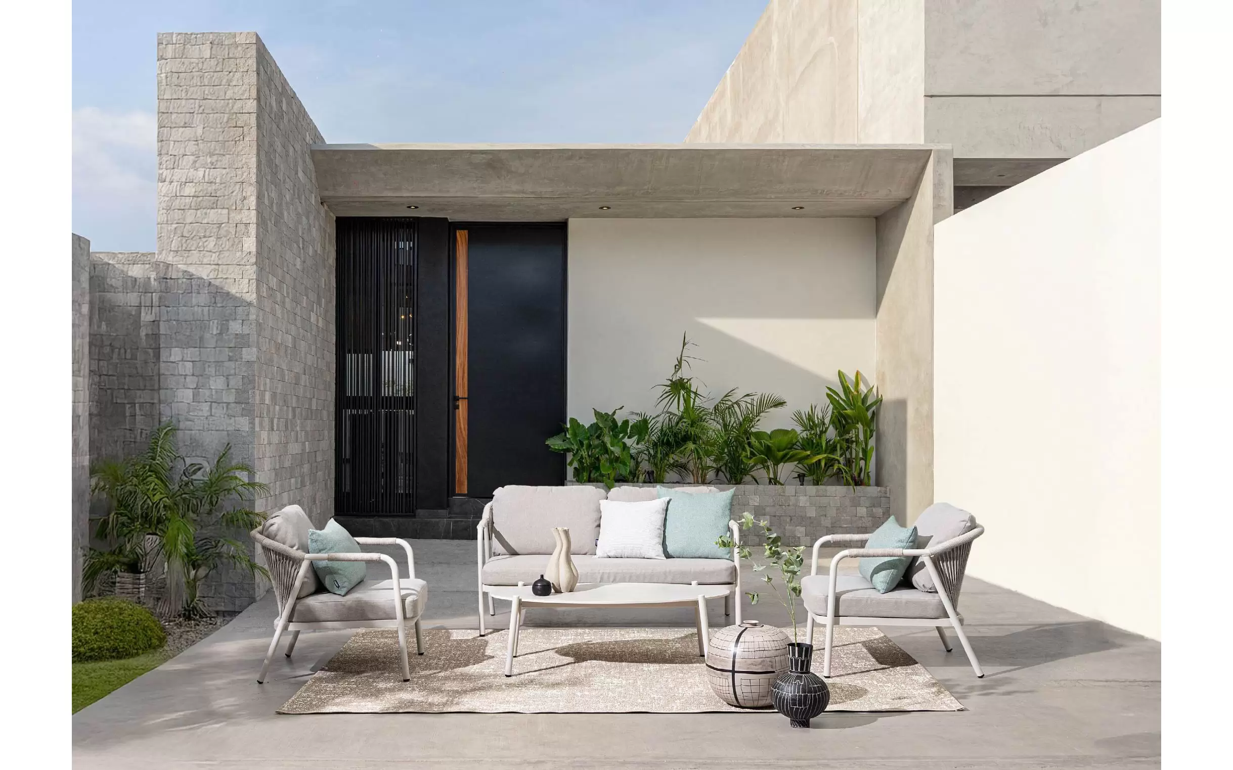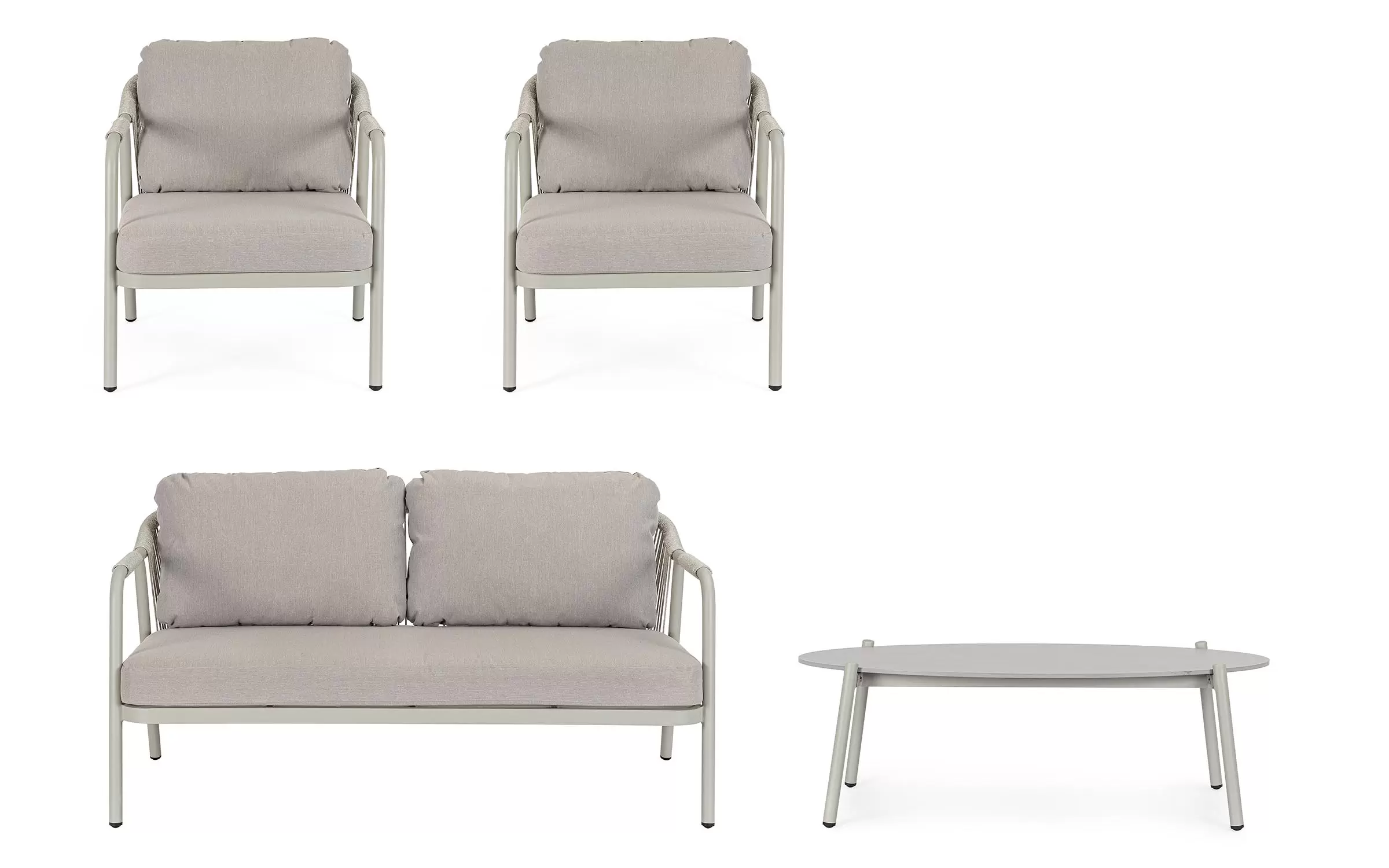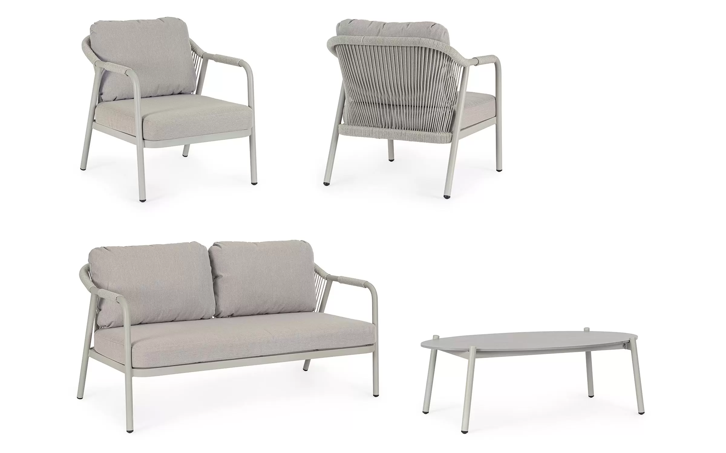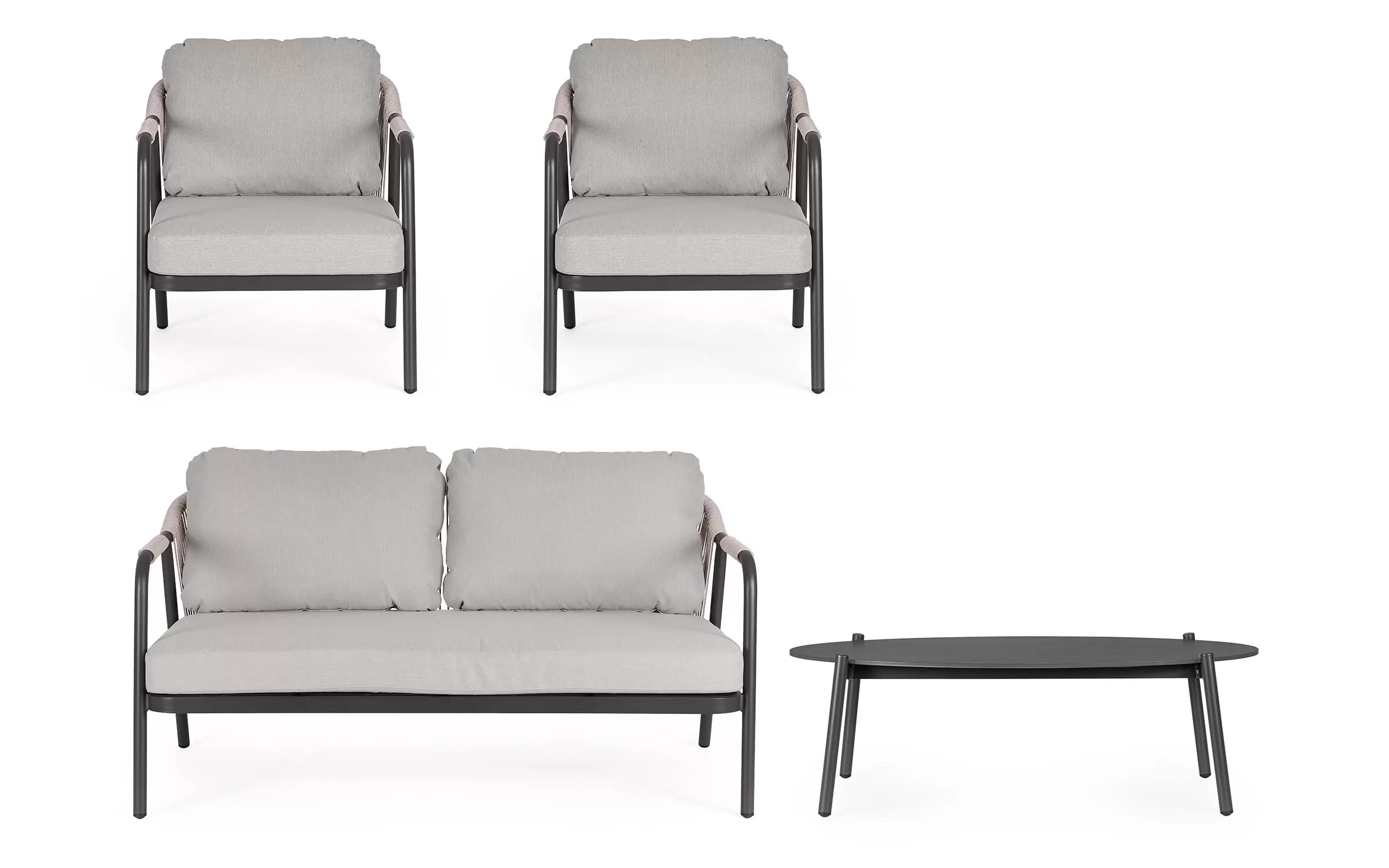 Meble ogrodowe dla 4 osób z 2-sobową sofą, 2 fotelami i owalnym stolikiem z blatem z kamienia spiekanego.