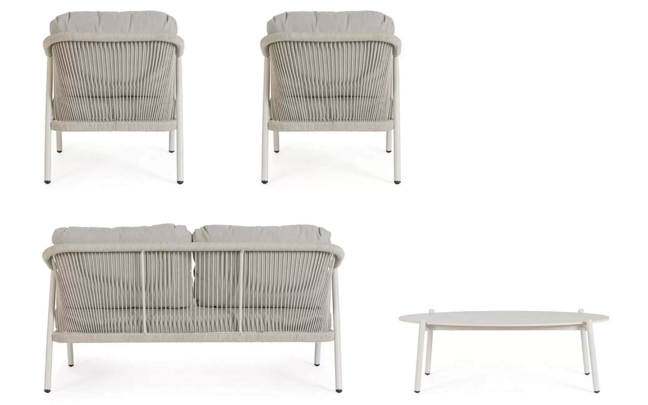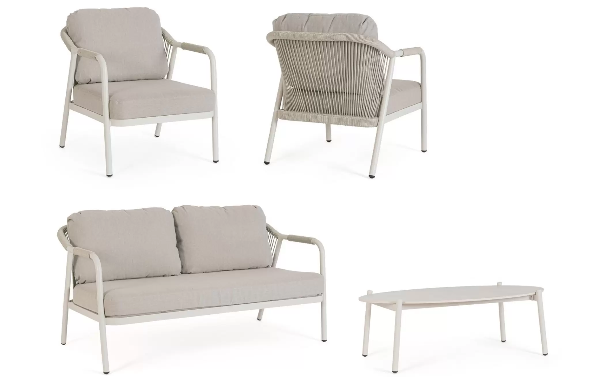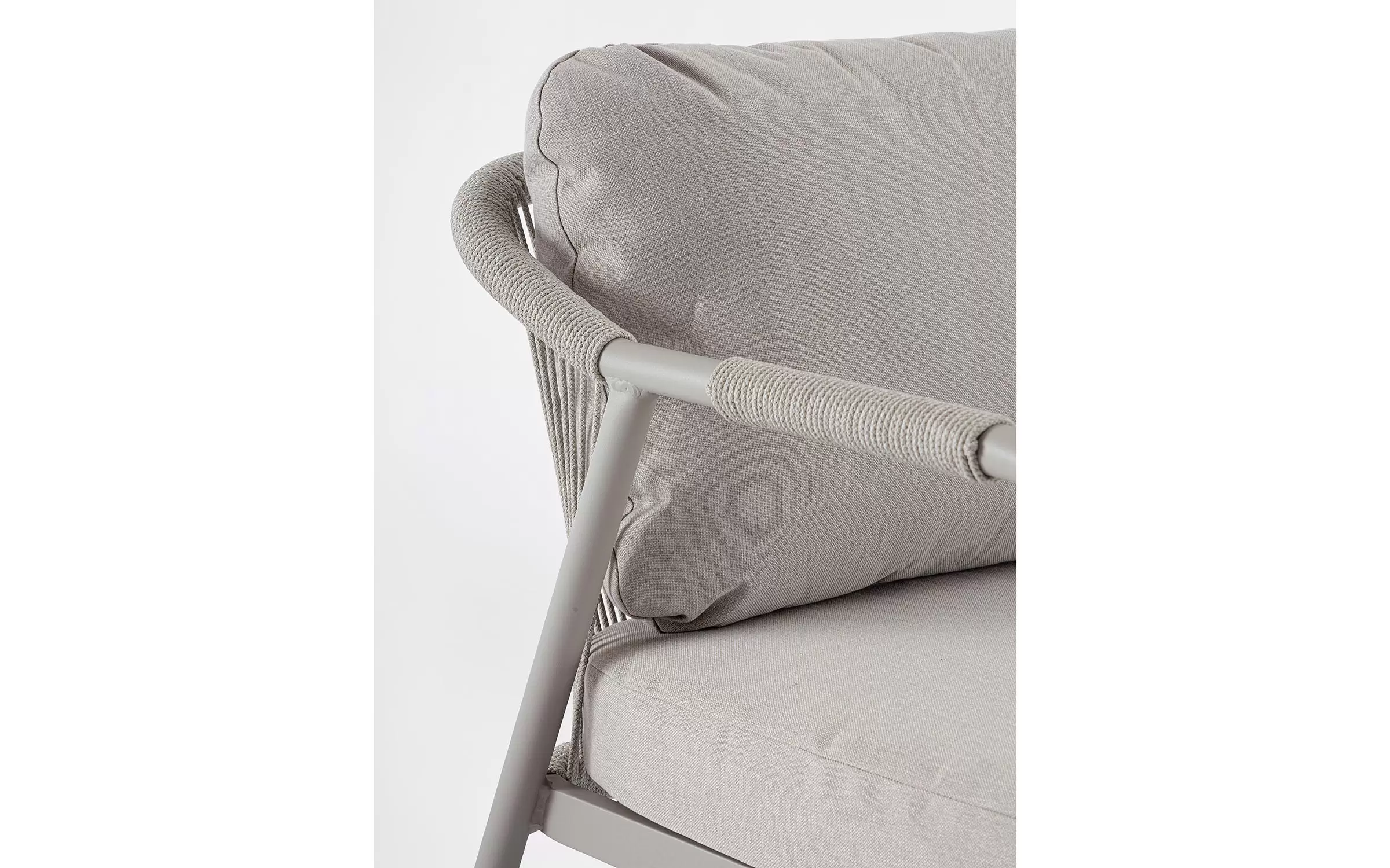 Ozdobą zestawu jest lina polipropylenowa zastosowana do podłokietników i oparć sofy i foteli. Wygodne poduszki ze zdejmowanymi polipropylenowymi poszewkami.