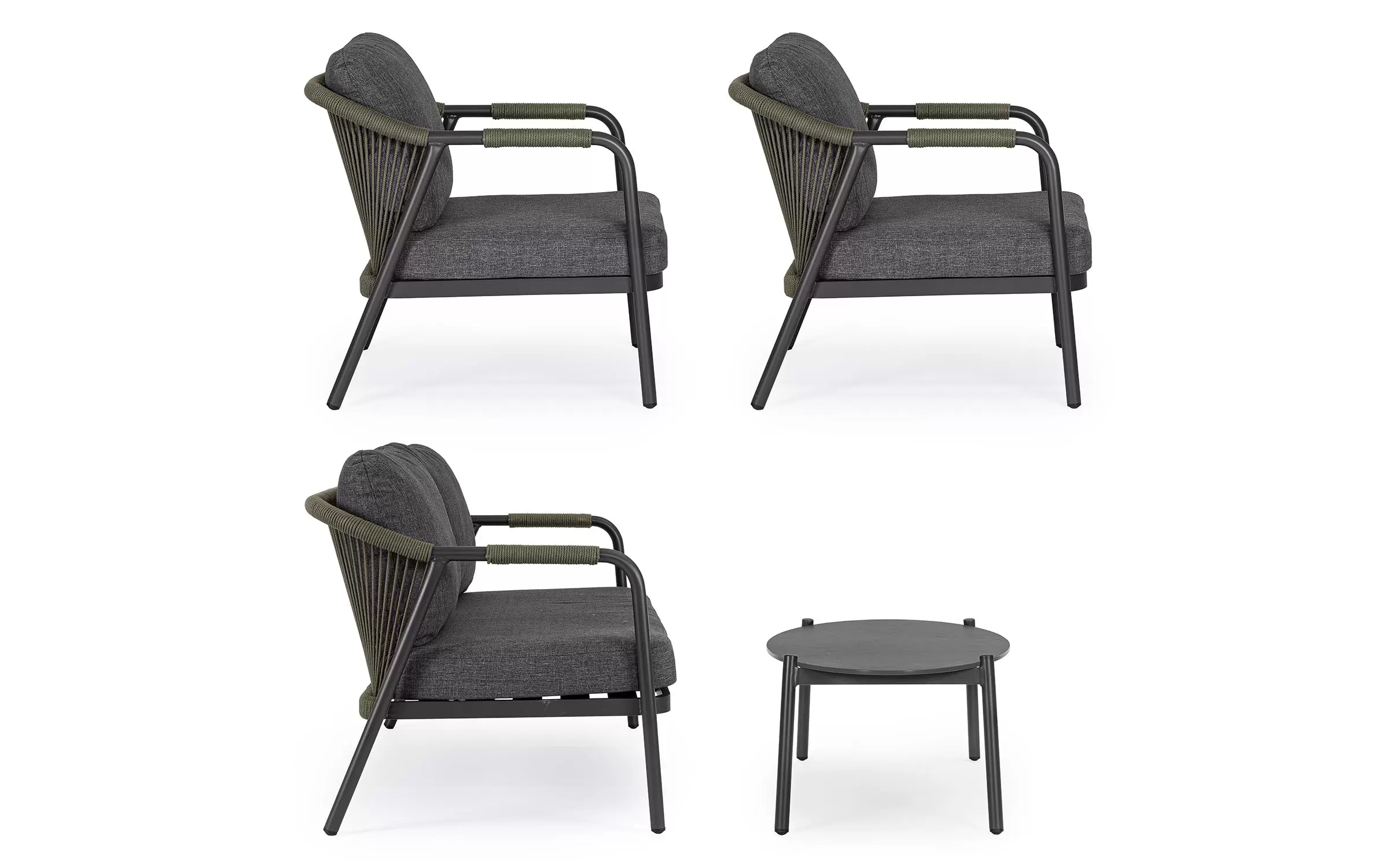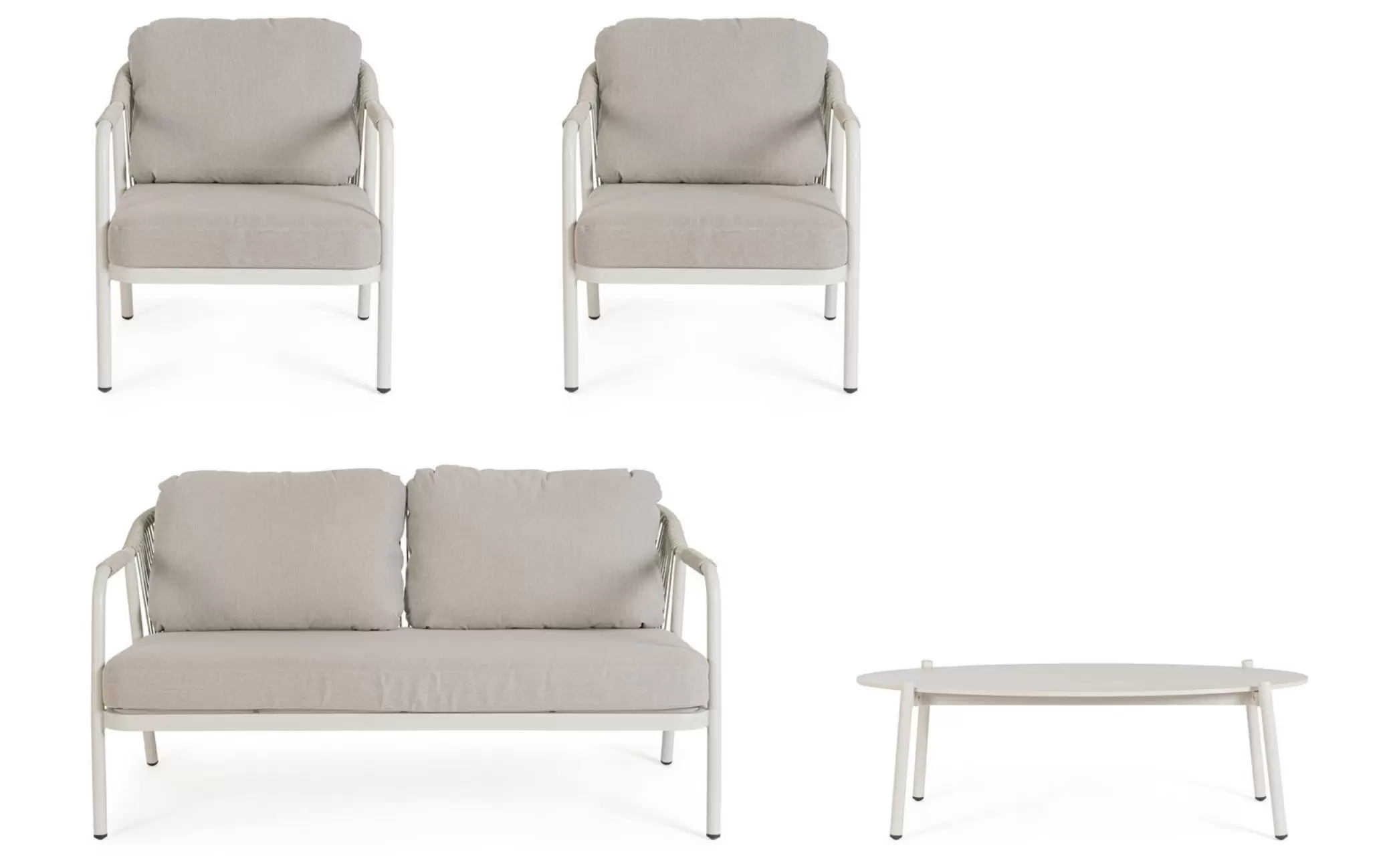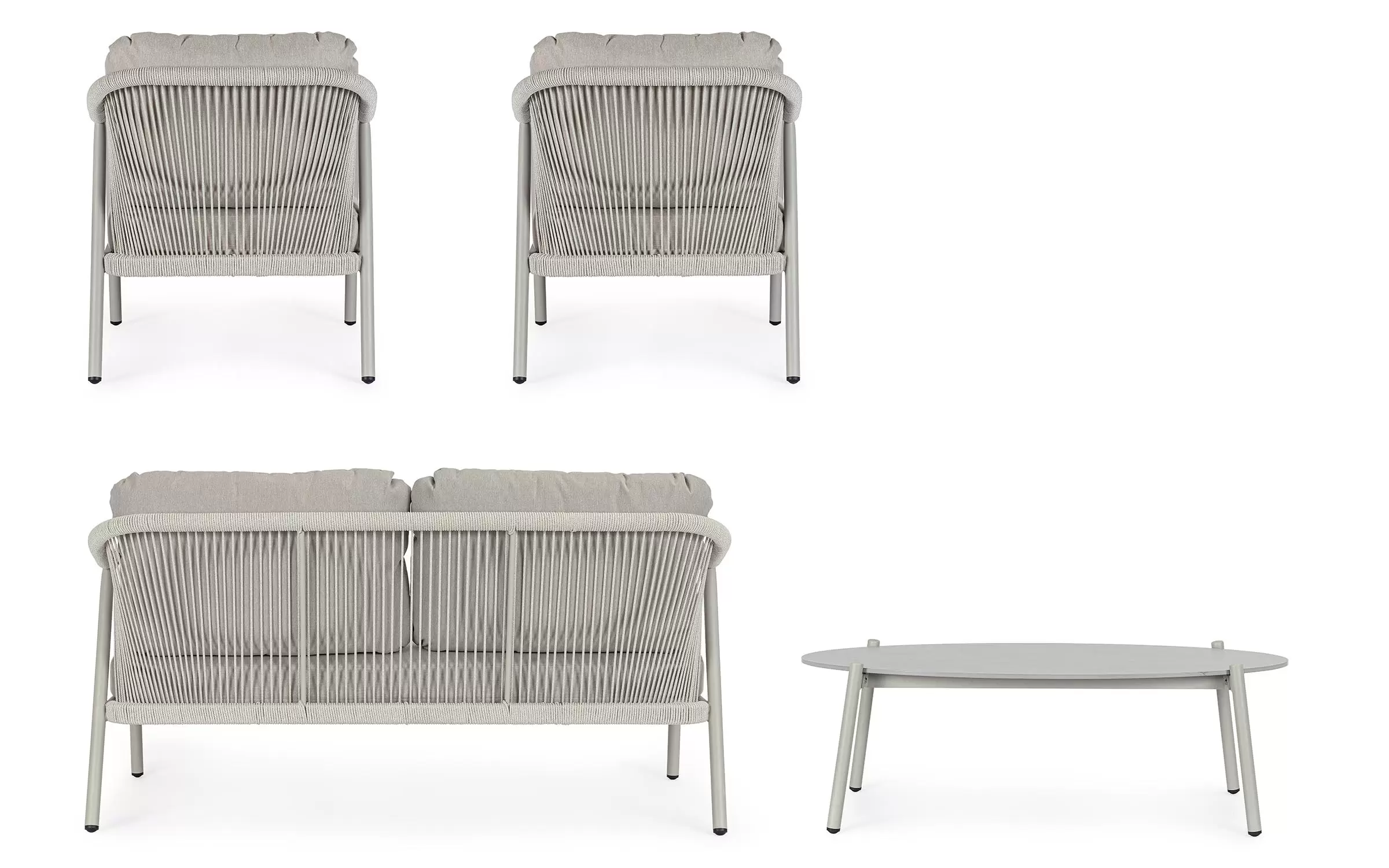 Ozdobą zestawu jest lina polipropylenowa zastosowana do podłokietników i oparć sofy i foteli. Wygodne poduszki ze zdejmowanymi polipropylenowymi poszewkami.