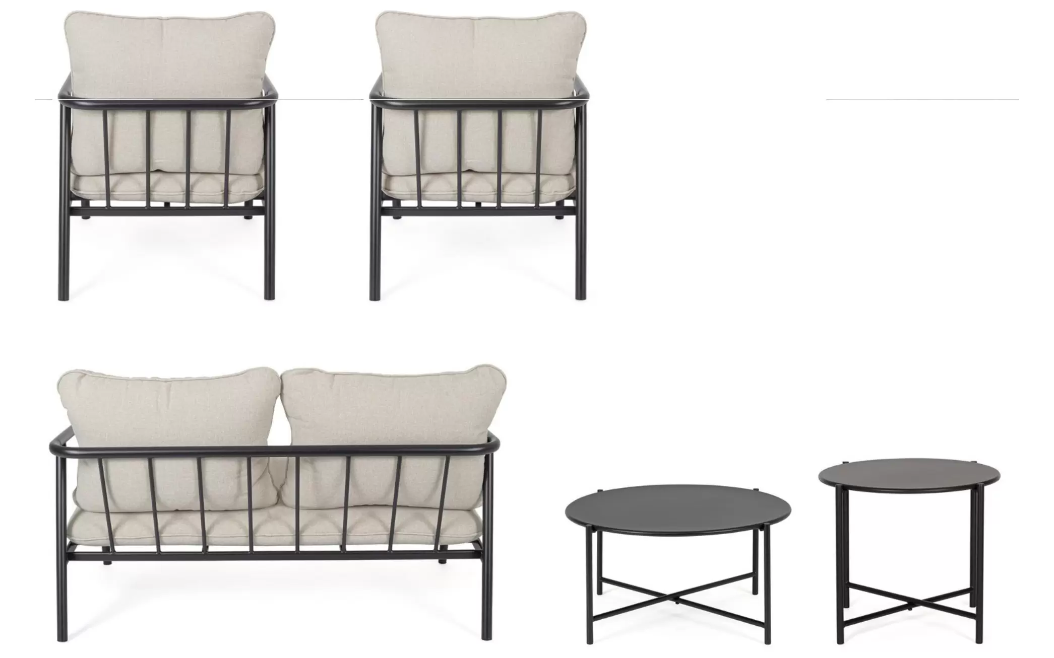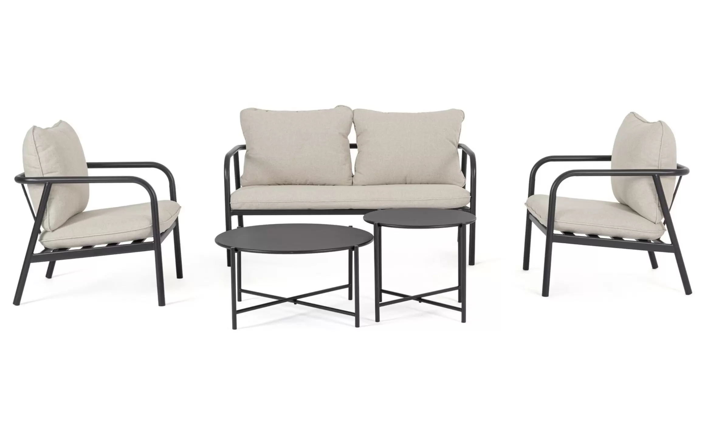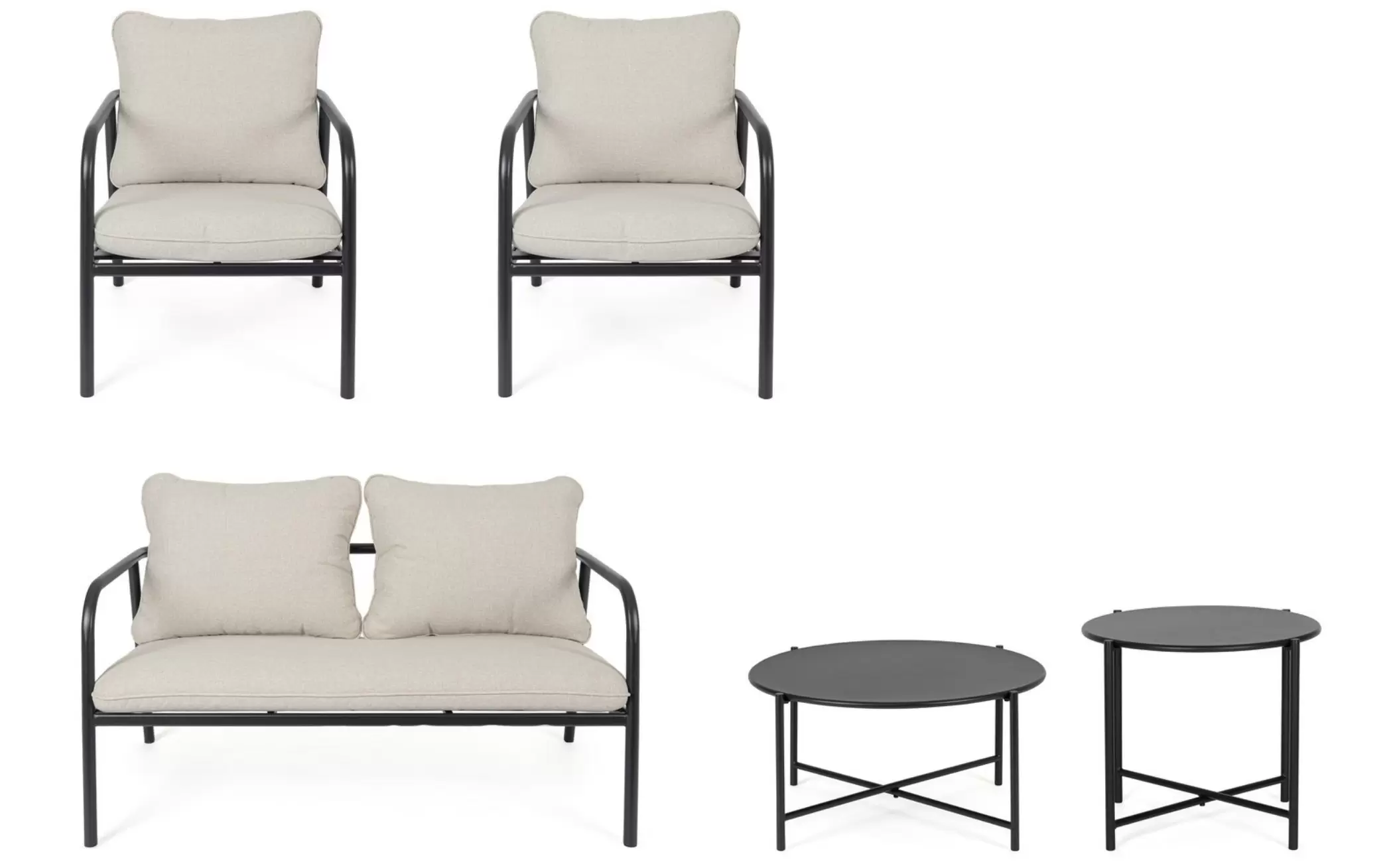 OSTUNI to kompletny zestaw wypoczynkowy przeznaczony do ogrodów, tarasów i przestrzeni komercyjnych. W skład kompletu wchodzi sofa dwuosobowa, dwa fotele oraz dwa stoliki kawowe o różnych wysokościach. Konstrukcja wszystkich elementów została wykonana ze stali fosforanowanej i malowanej proszkowo, co zapewnia odporność na korozję i stabilność użytkową.