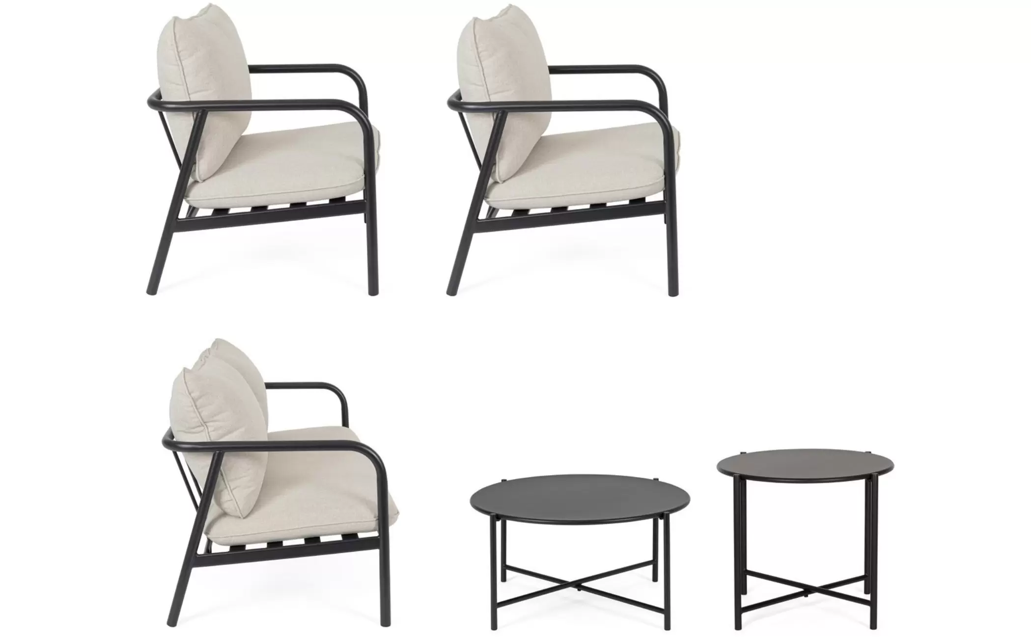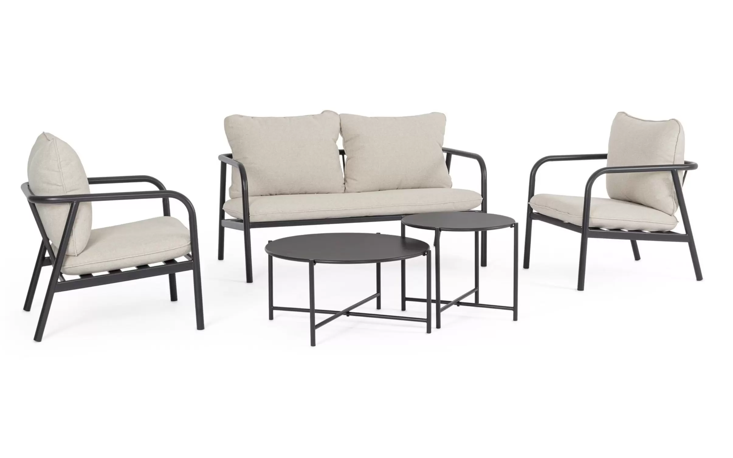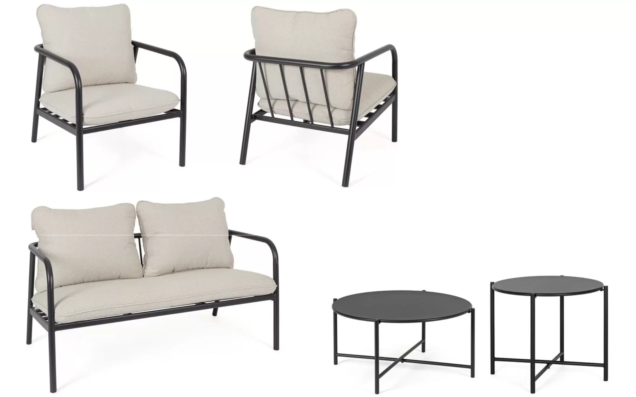 OSTUNI to kompletny zestaw wypoczynkowy przeznaczony do ogrodów, tarasów i przestrzeni komercyjnych. W skład kompletu wchodzi sofa dwuosobowa, dwa fotele oraz dwa stoliki kawowe o różnych wysokościach. Konstrukcja wszystkich elementów została wykonana ze stali fosforanowanej i malowanej proszkowo, co zapewnia odporność na korozję i stabilność użytkową.