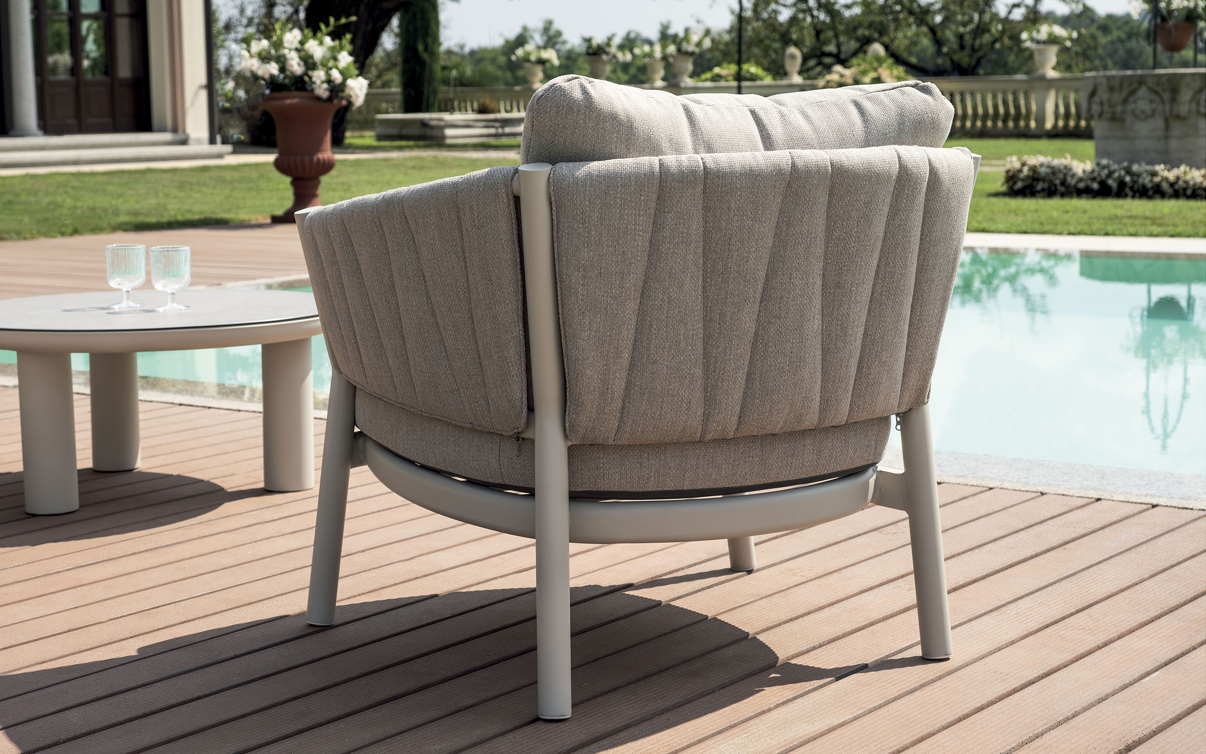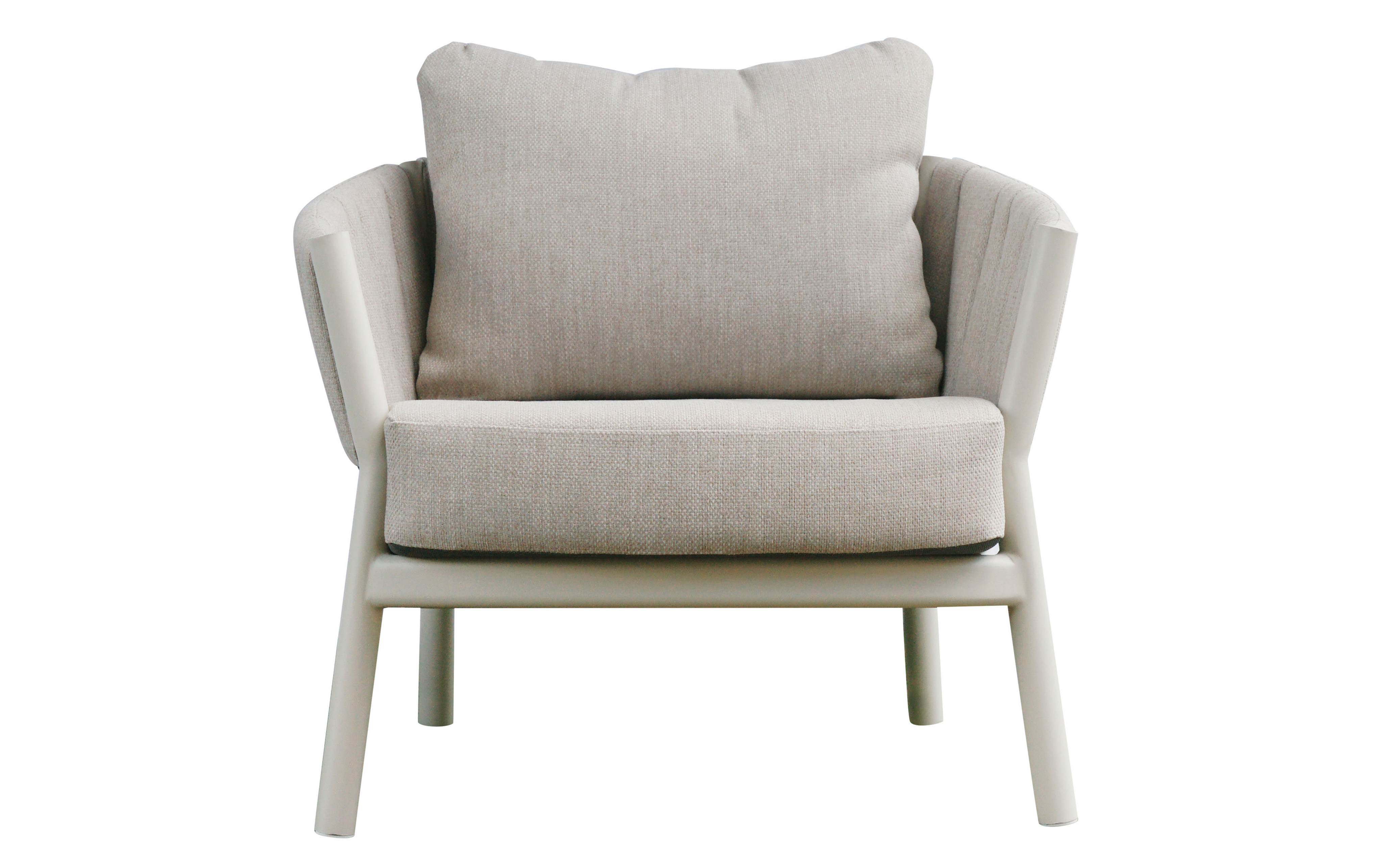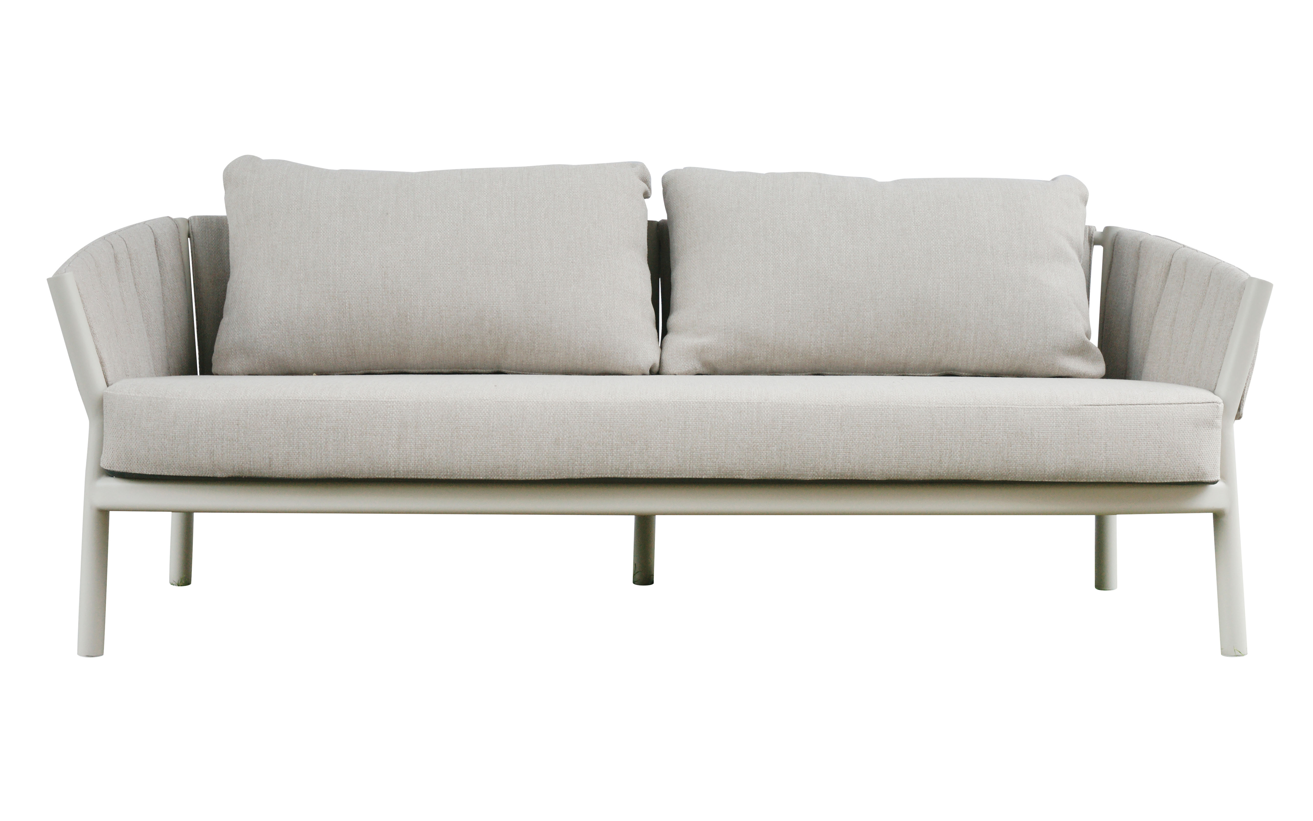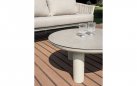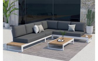 Konstrukcja z aluminium malowanego proszkowo w kolorze białym. Blaty stolików ze szkła natryskowego SprayStone. Poduszki zdejmowane w kolorze jasnoszarym, wykonane z tkaniny odpornej na warunki atmosferyczne.