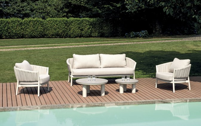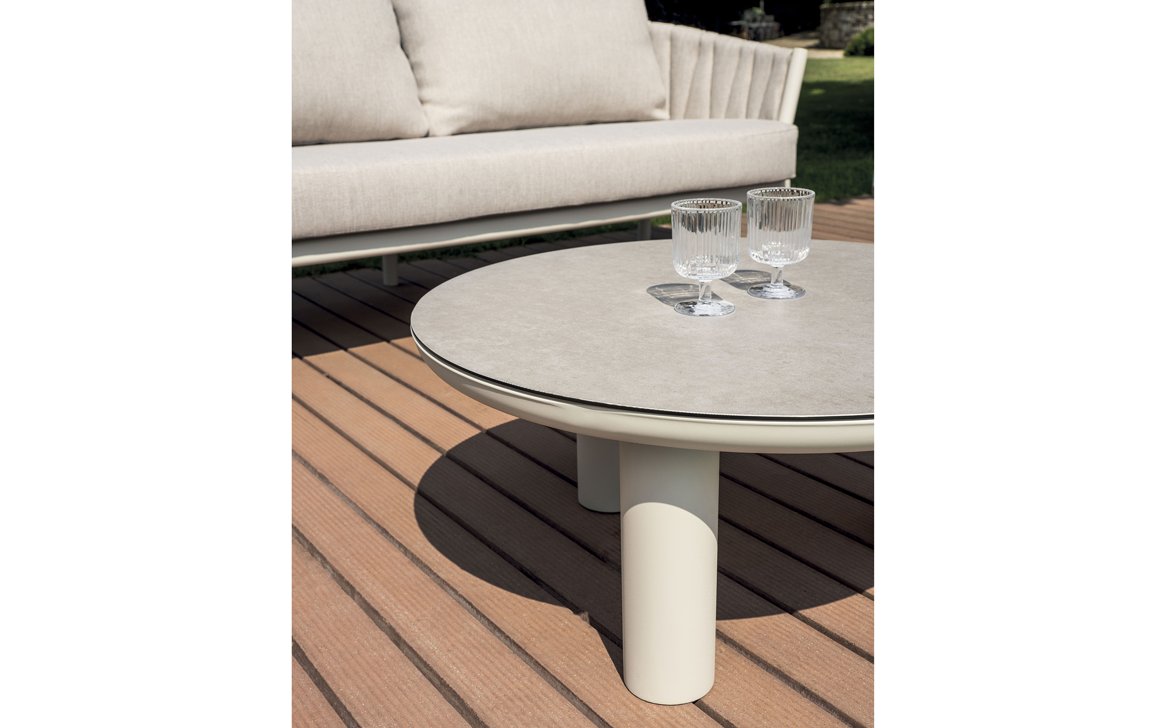 Zestaw wypoczynkowy PORT GRIMAUD to elegancka i funkcjonalna propozycja do aranżacji przestrzeni ogrodowej, tarasu lub balkonu. Wykonany z aluminiowej konstrukcji malowanej proszkowo w kolorze białym, zapewnia trwałość i odporność na warunki atmosferyczne. W zestawie znajdują się dwa stoliki kawowe o różnych średnicach, z blatem ze szkła natryskowego SprayStone.