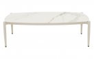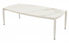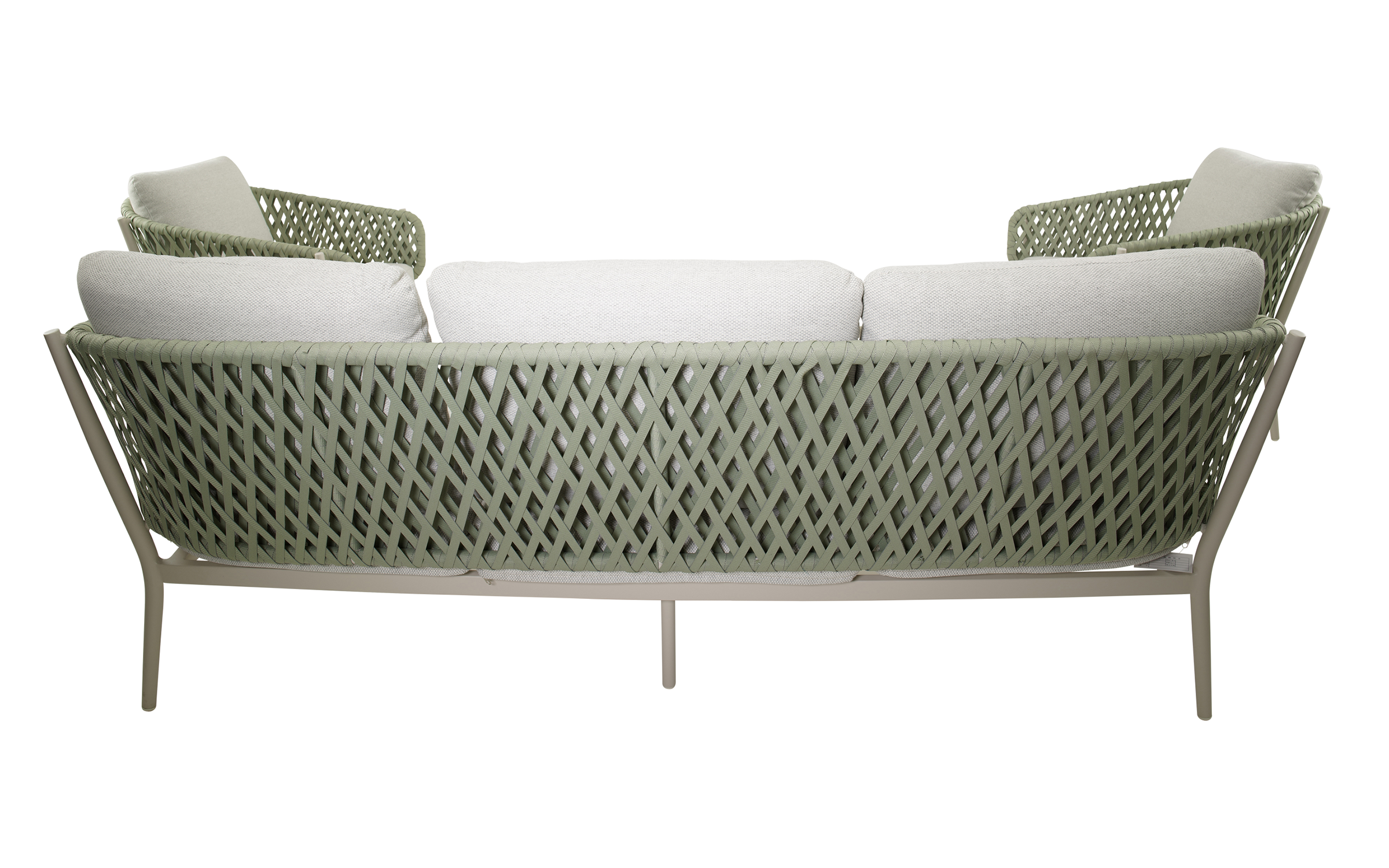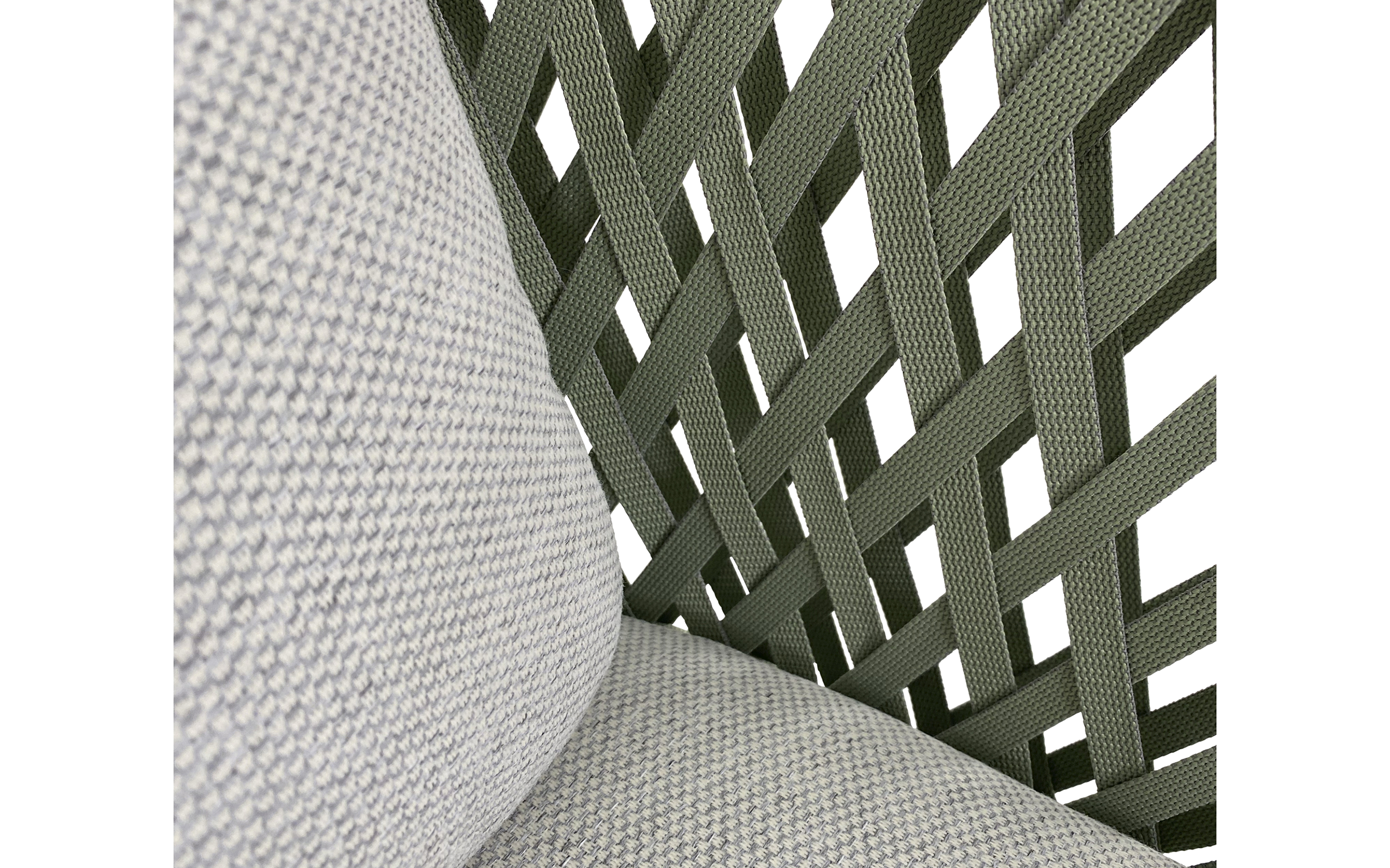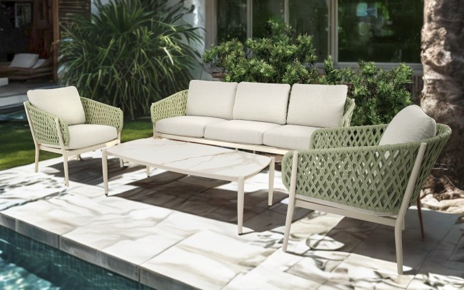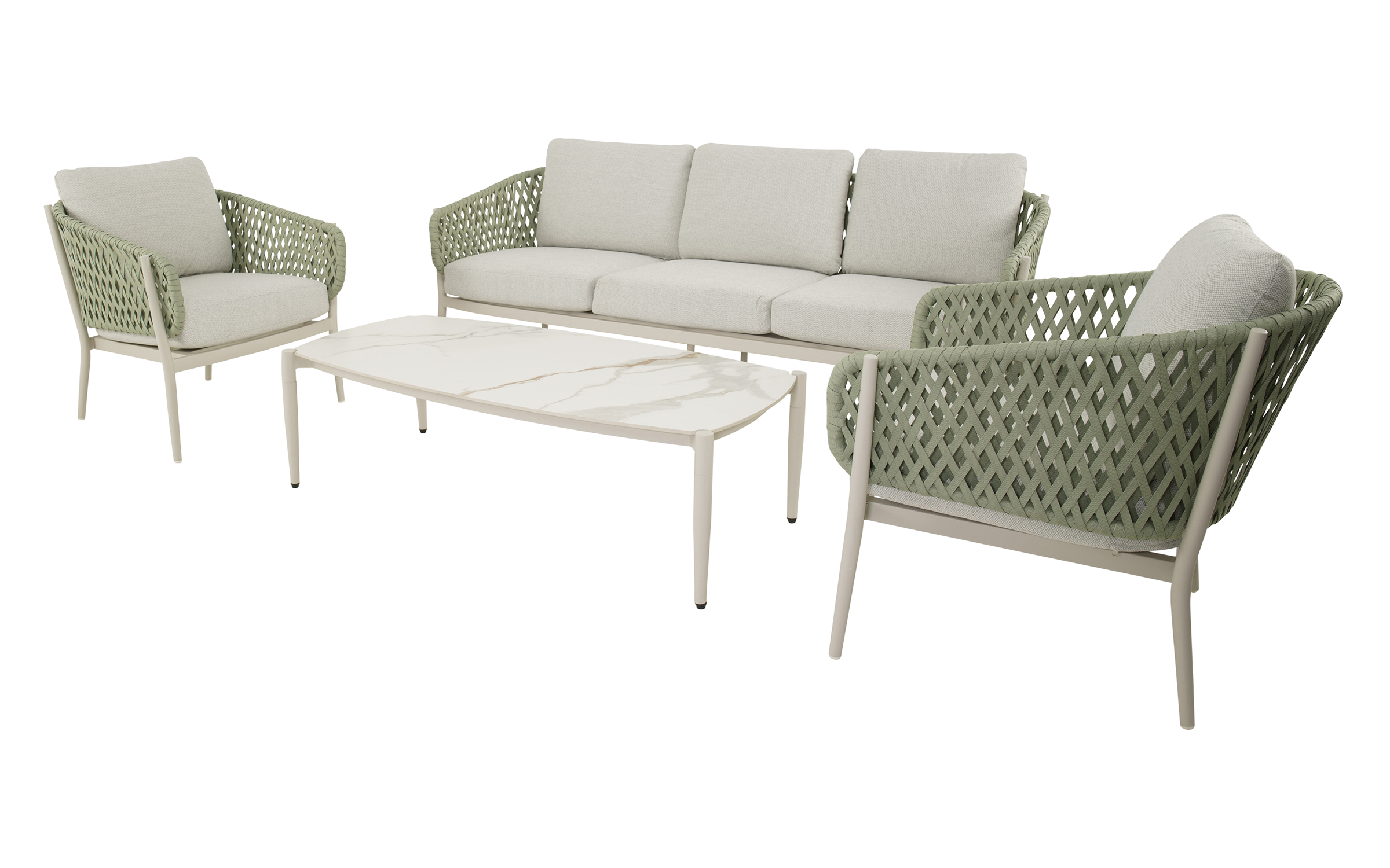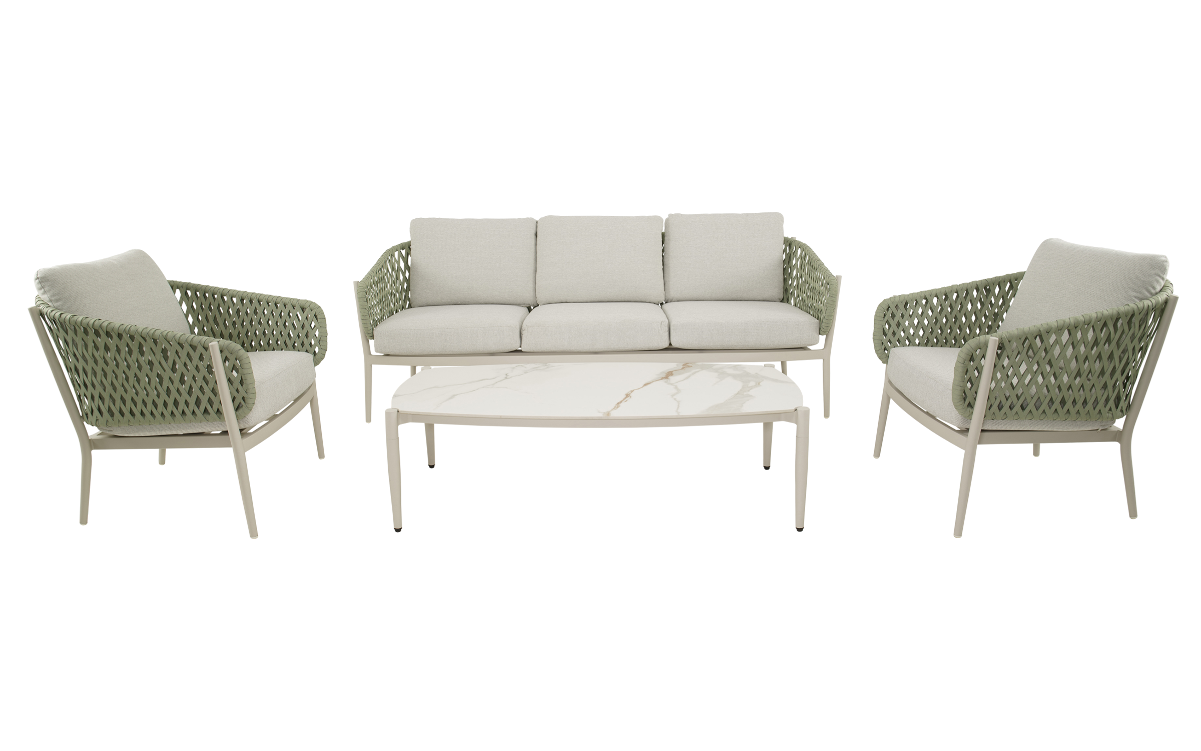 Zestaw wypoczynkowy ZAYA to połączenie nowoczesnego designu z naturalną elegancją. Składa się z przestronnej sofy 3‑osobowej, dwóch wygodnych foteli oraz stolika kawowego z kamiennym blatem. Konstrukcja z aluminium malowanego proszkowo w kolorze matowy beż jest odporna na korozję i warunki atmosferyczne. Boki i oparcia wykończone są plecionką płaską 15 mm w kolorze szarozielonym. Poduszki w kolorze beżowym wykonane są z tkaniny Olefin 235 g/m², zapewniającej komfort i trwałość.