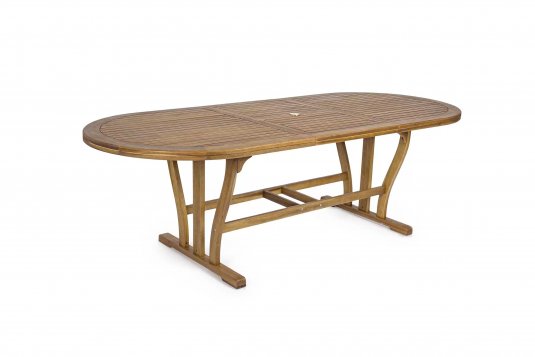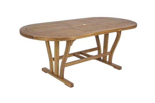 Rozkładany stół ogrodowy z drewna akacji 180-240 cm / system rozkładnia motylkowy / podstawa z poprzeczką przy podłodze / zaokrąglone końce blatu
