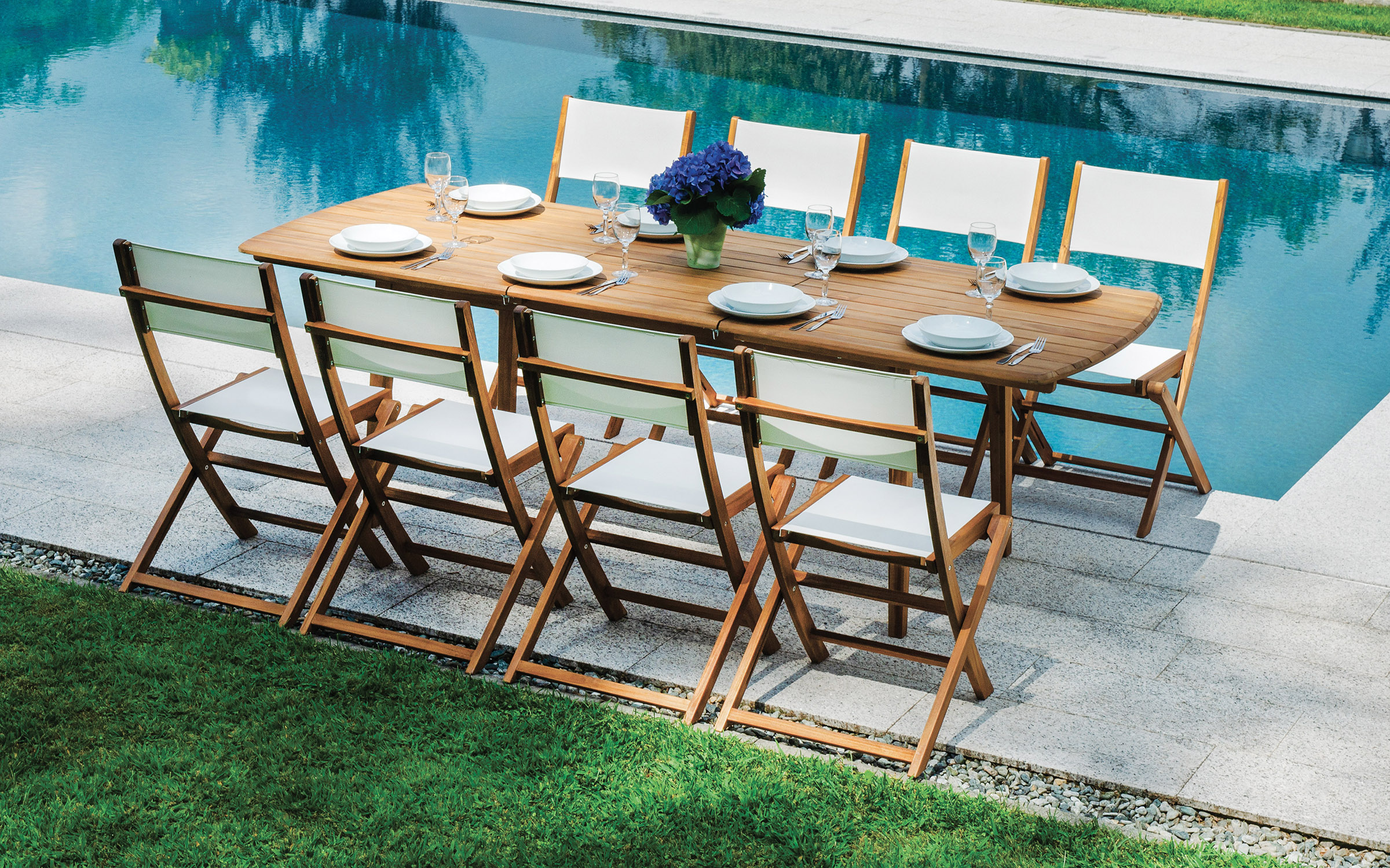 Konstrukcja z drewna akacjowego, siedzisko i oparcie z tekstyliny – materiału odpornego na wilgoć, promieniowanie UV i zabrudzenia. Zalecana regularna konserwacja drewna olejem akacjowym.