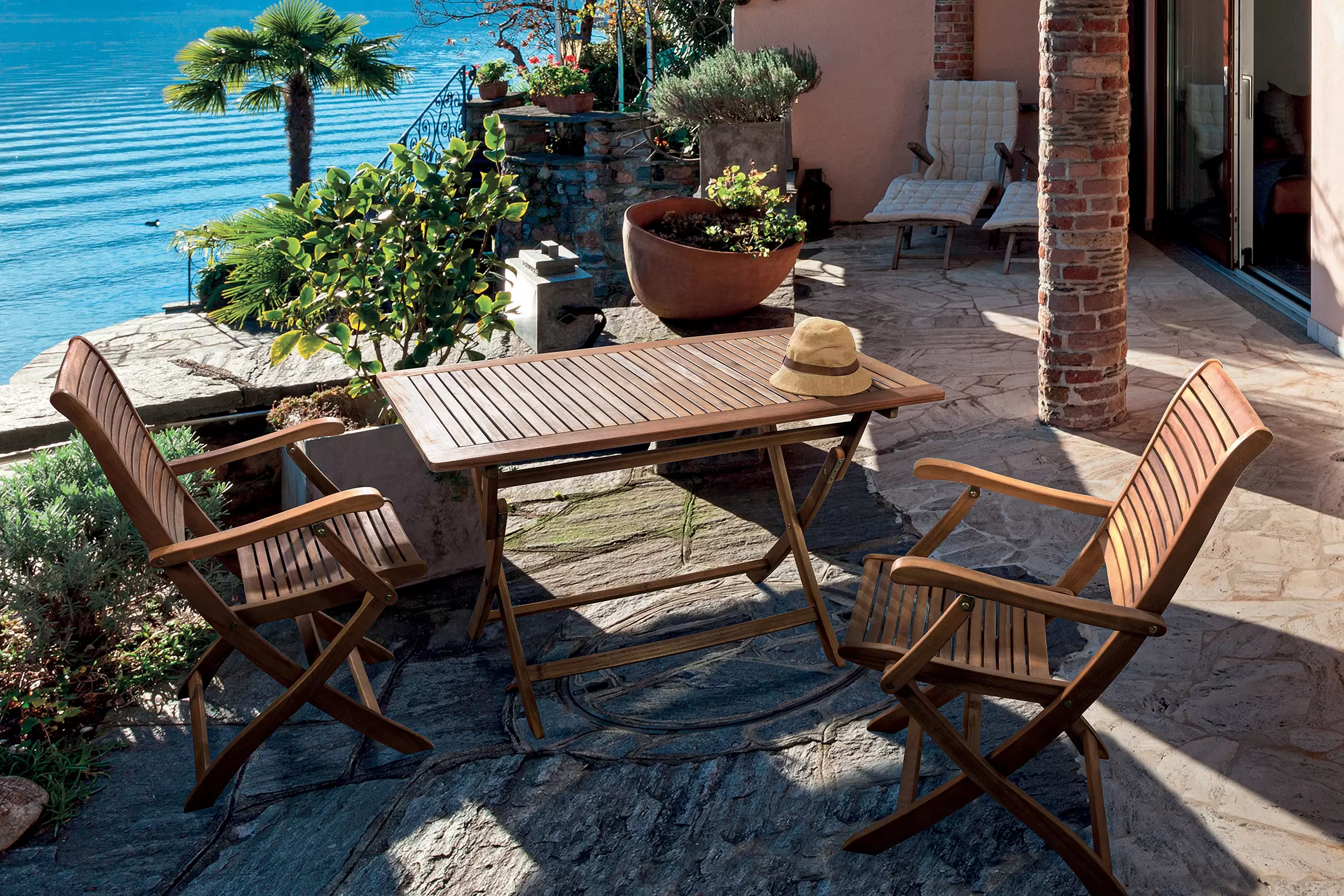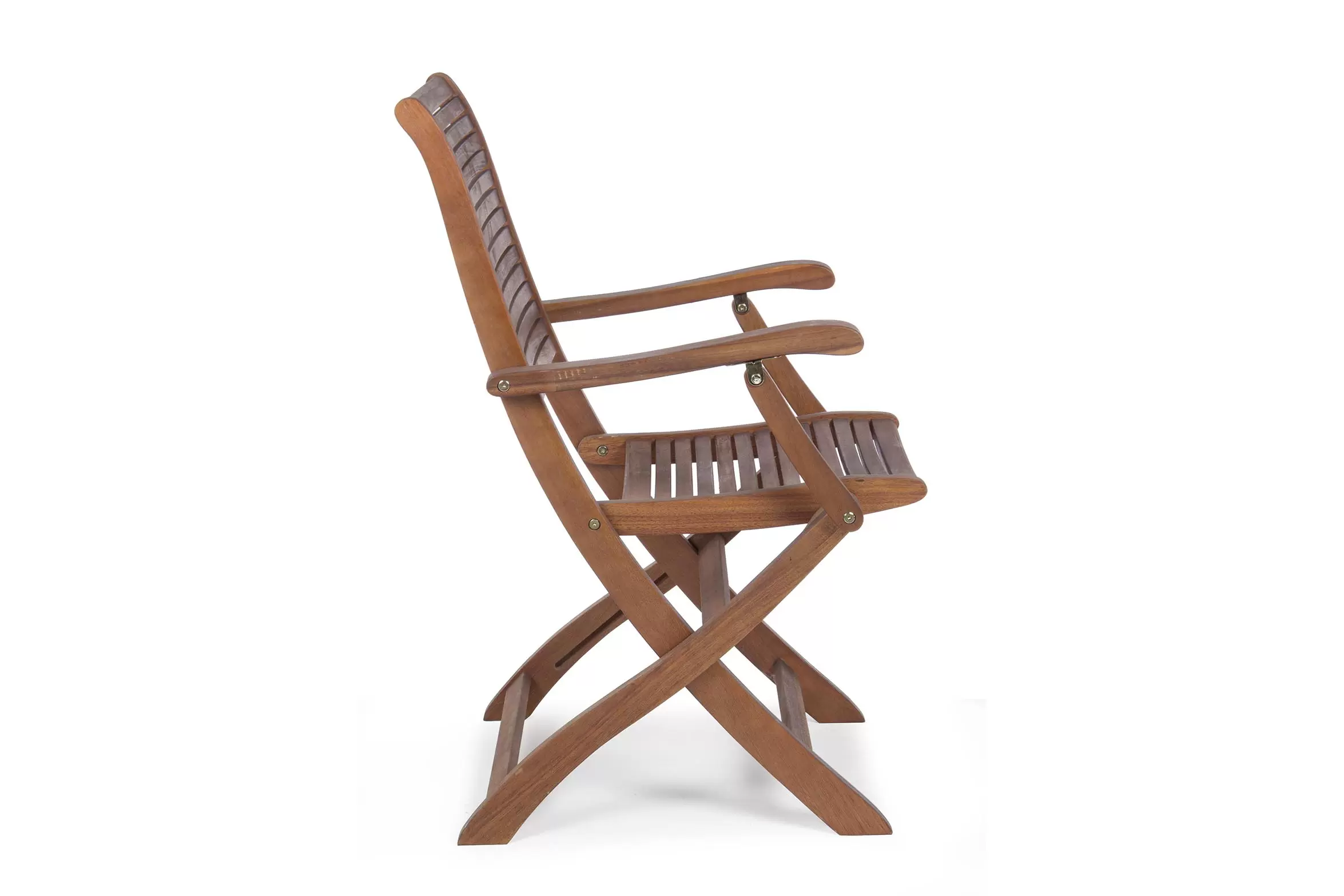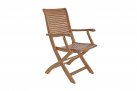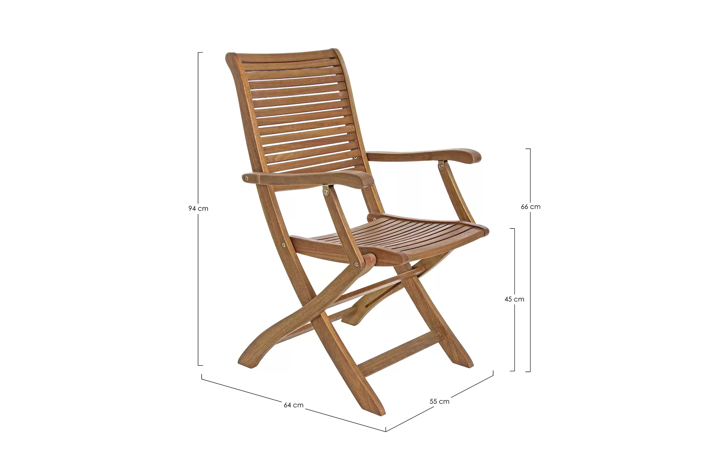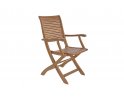 Składany fotel z drewna akacji z profilowanym oparciem z podłokietnikami. Producent zaleca stosowanie na zadaszonych tarasach lub do wnętrz.