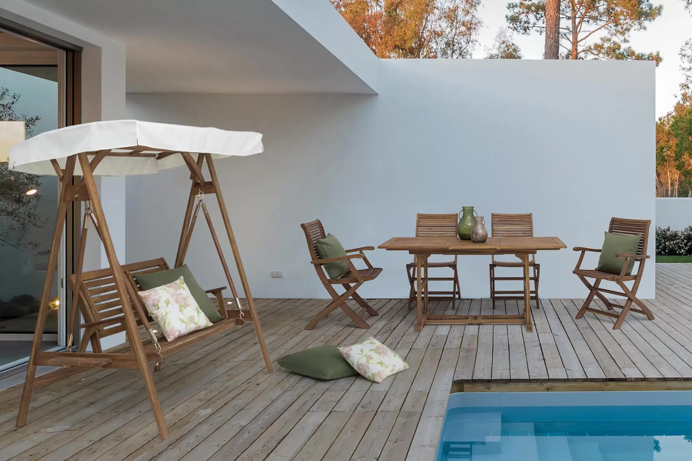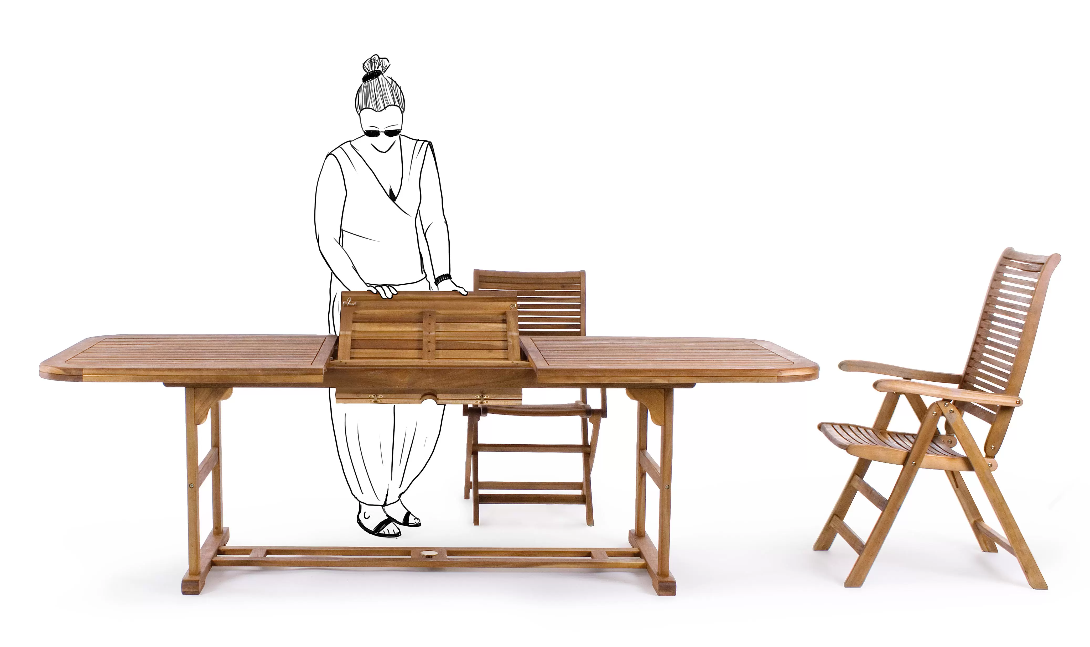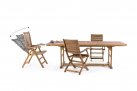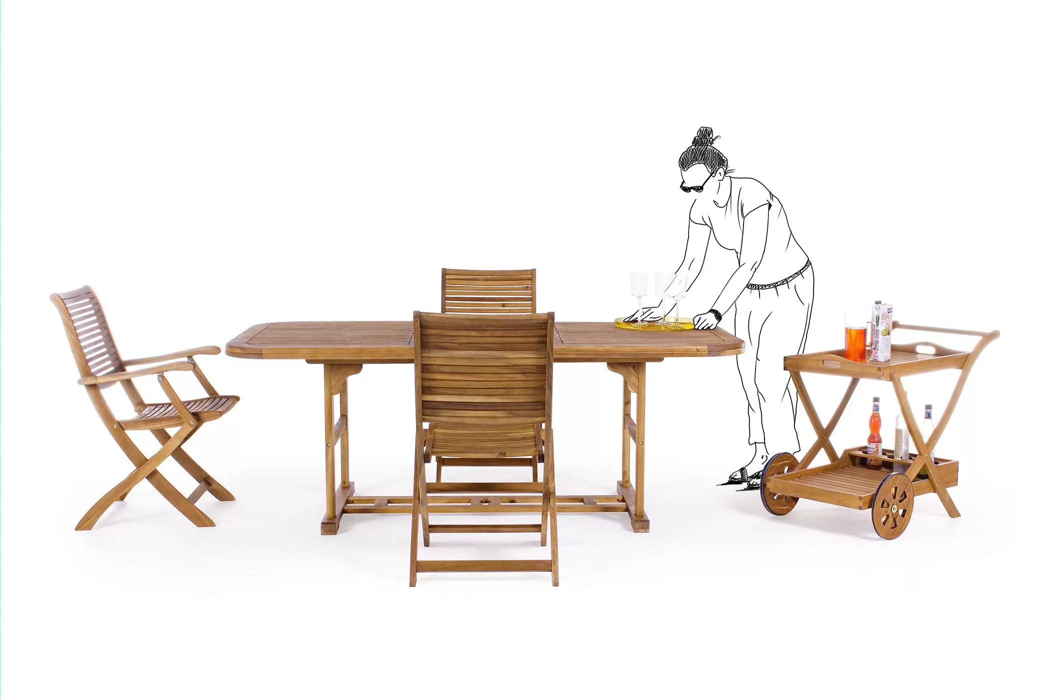 Składany fotel z drewna akacji z profilowanym oparciem z podłokietnikami. Producent zaleca stosowanie na zadaszonych tarasach lub do wnętrz.