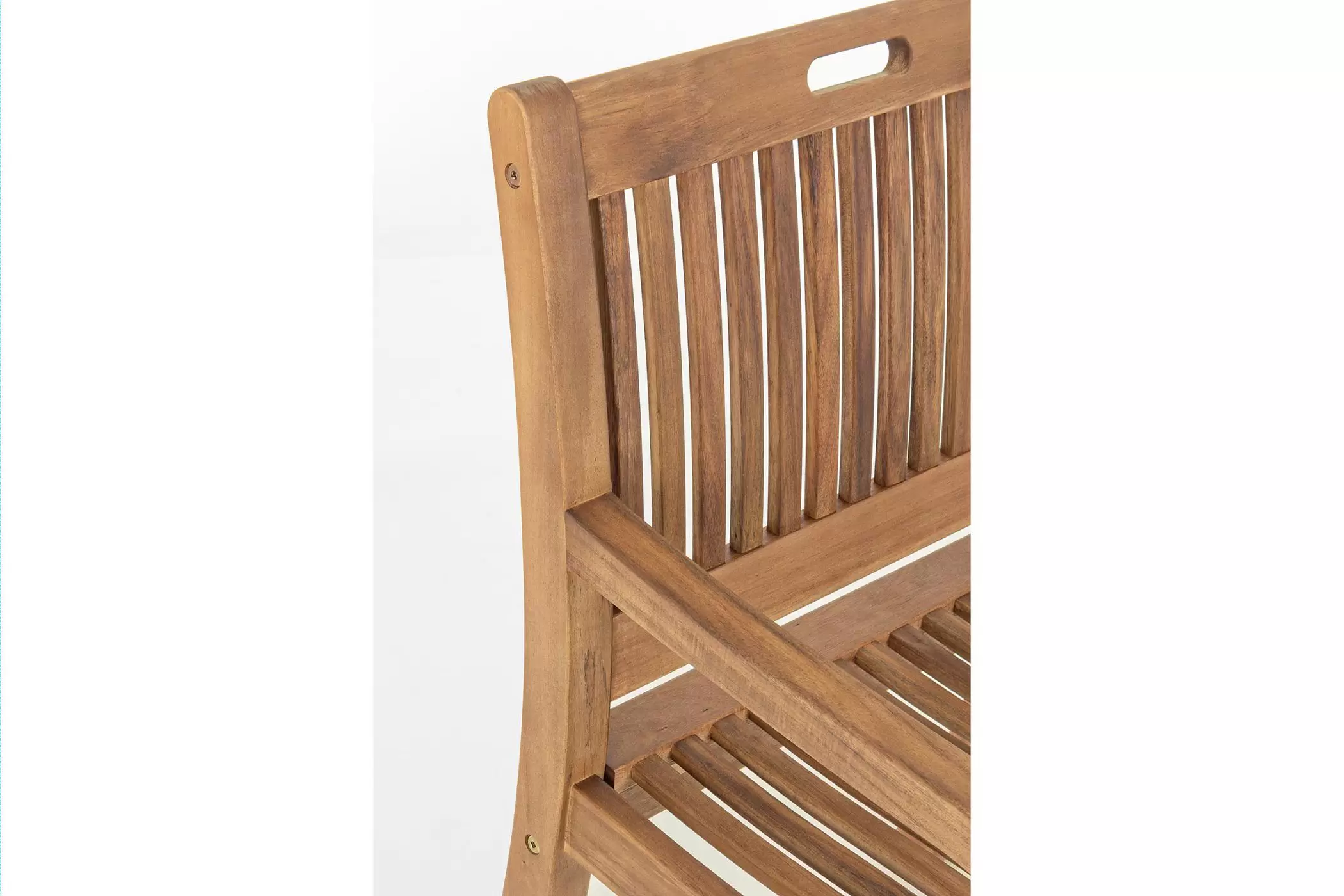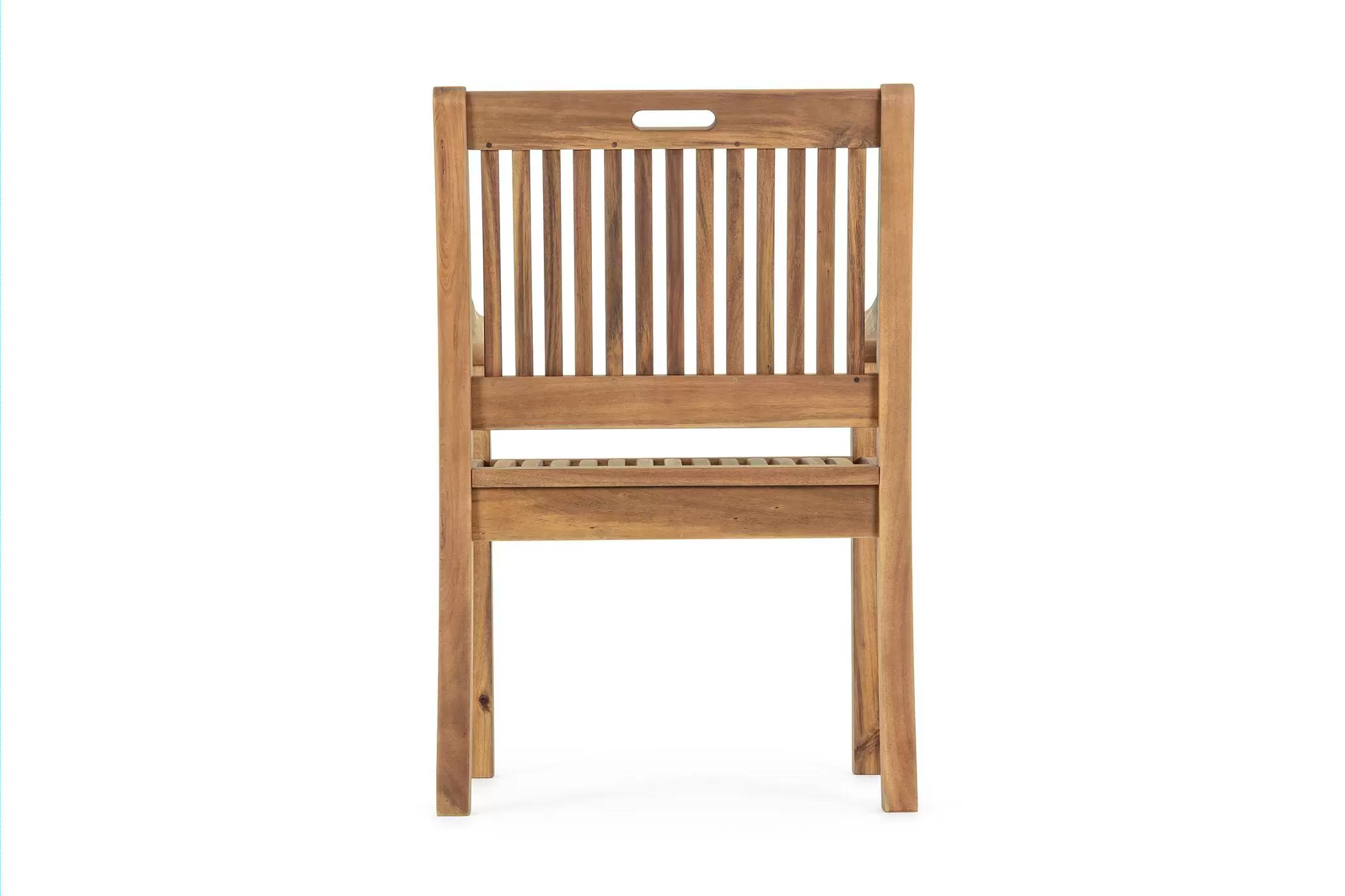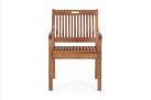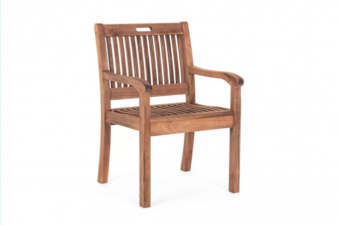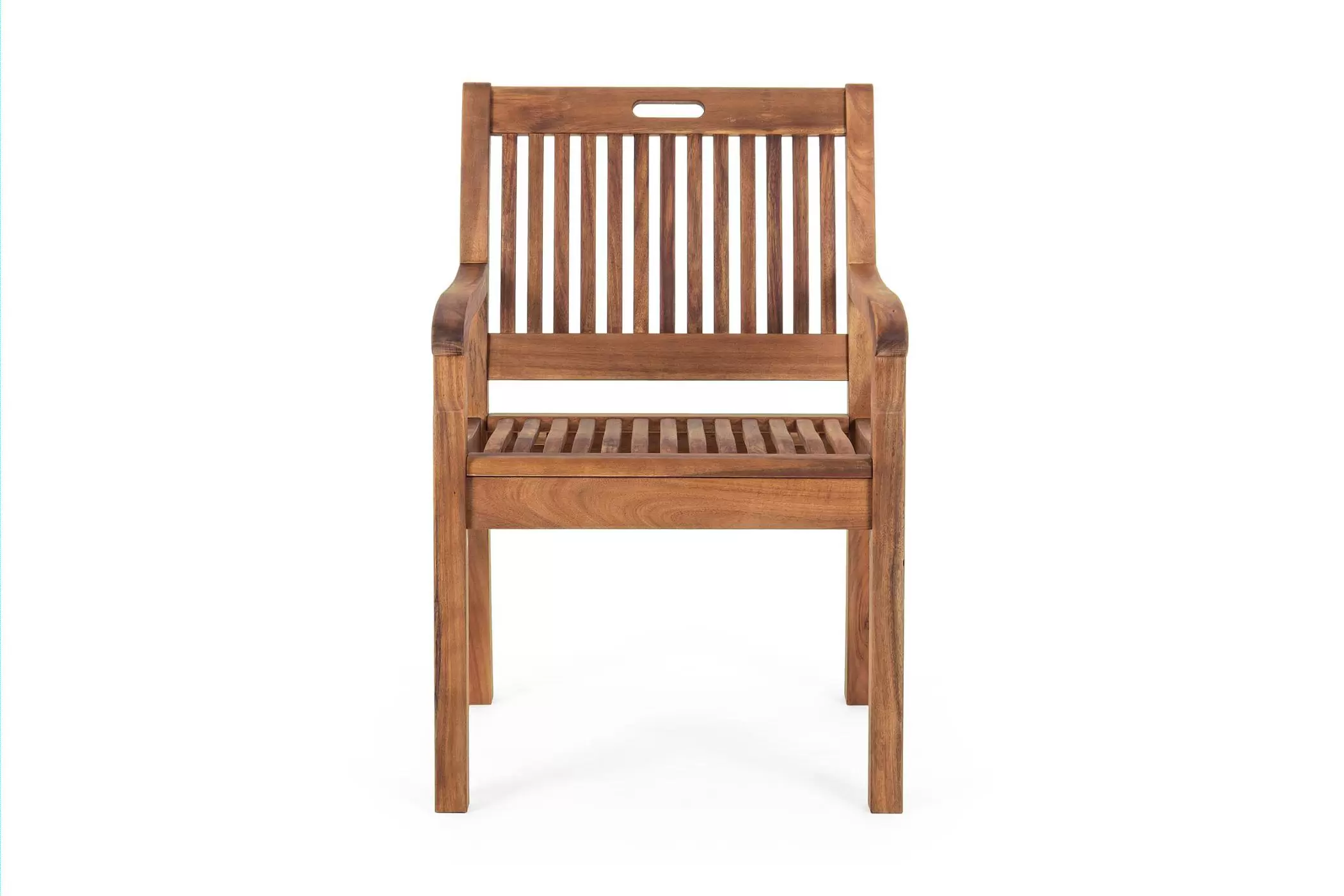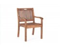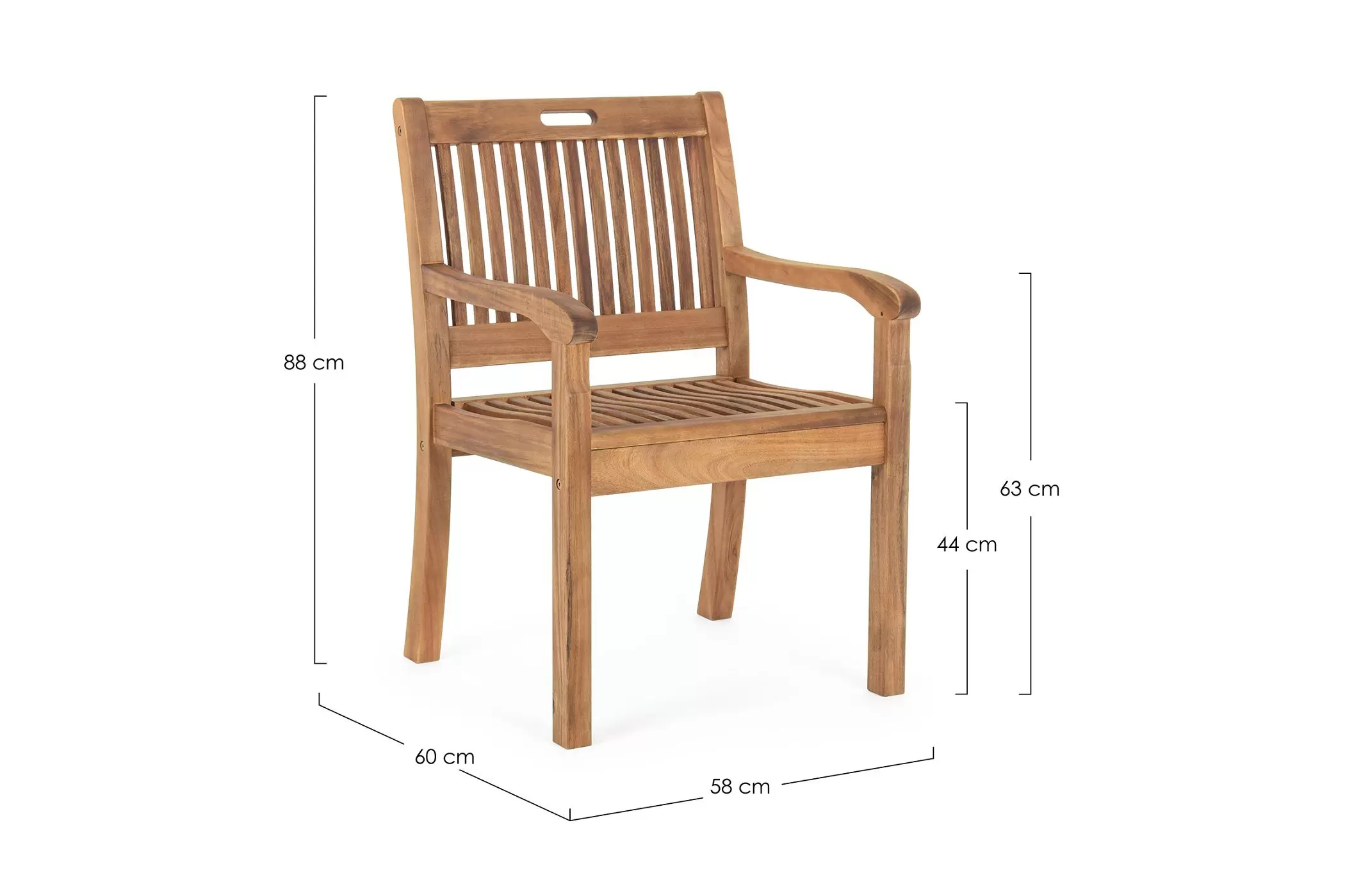 Fotel obiadowy z drewna akacji z podłokietnikami. Producent zaleca stosowanie na zadaszonych tarasach lub do wnętrz.