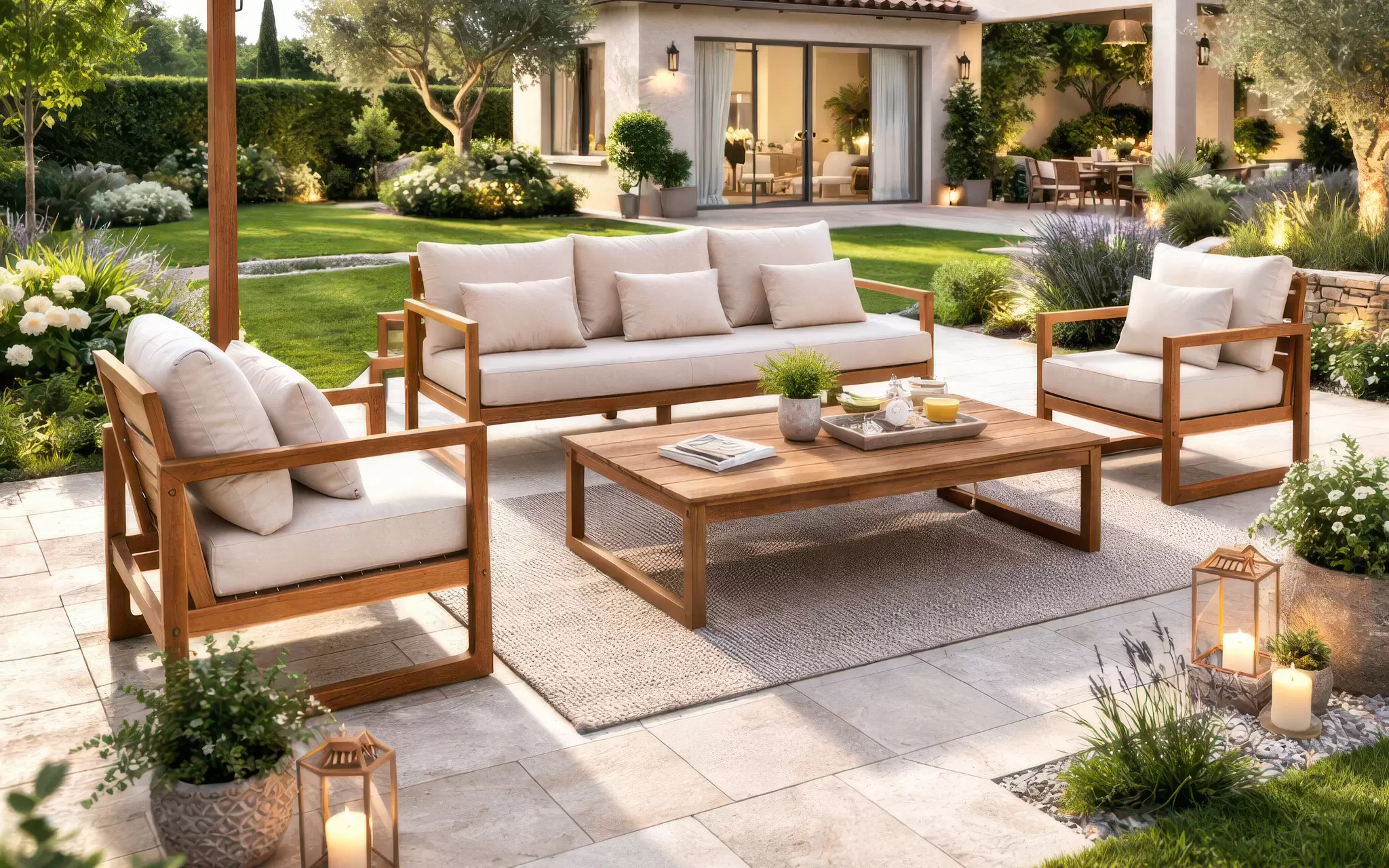 ADRIAN to kompletny zestaw wypoczynkowy wykonany z litego drewna akacji FSC 100%, wykończonego olejem w eleganckim efekcie teaku. Naturalna struktura drewna, solidna konstrukcja oraz miękkie poduszki tworzą komfortową i stylową przestrzeń relaksu na tarasie, patio lub w ogrodzie.