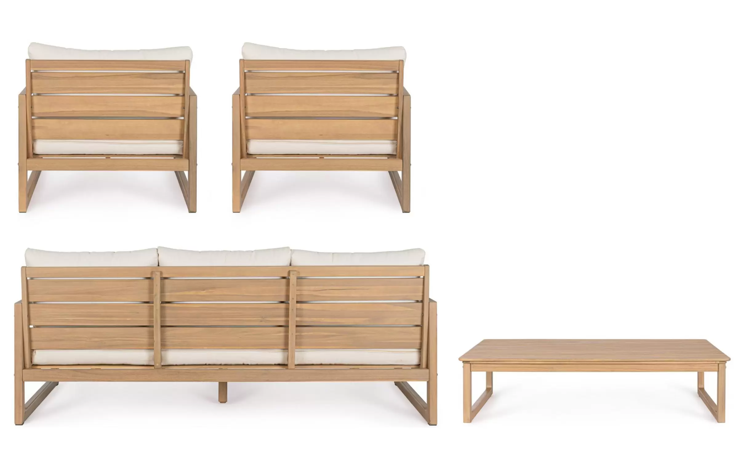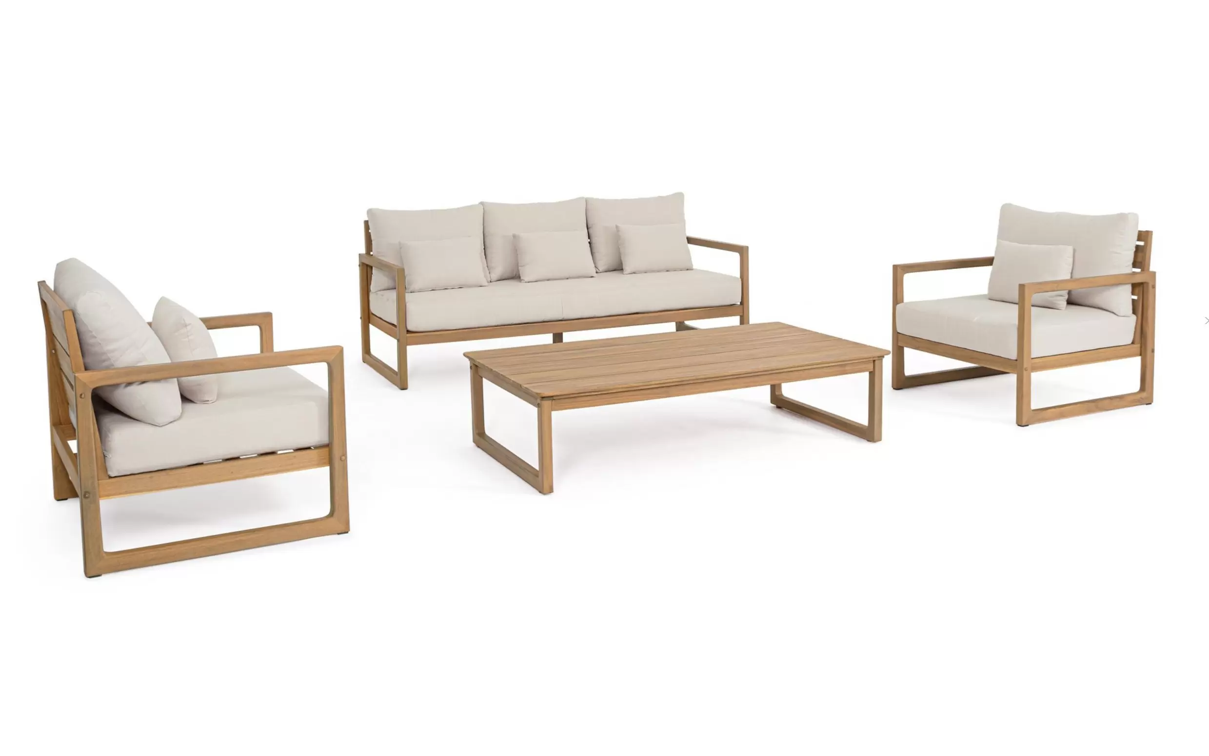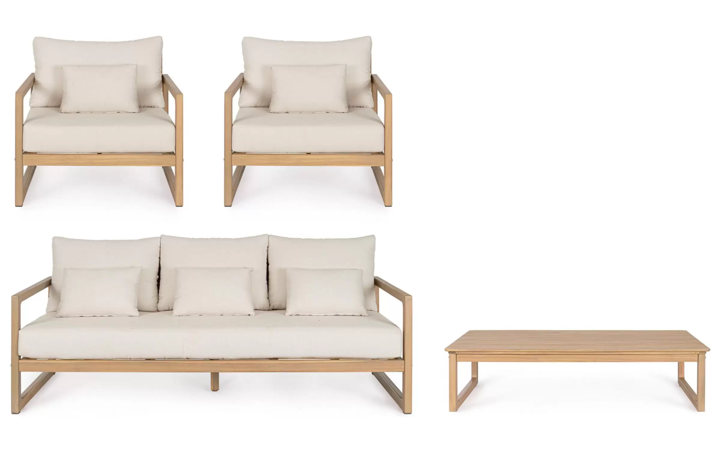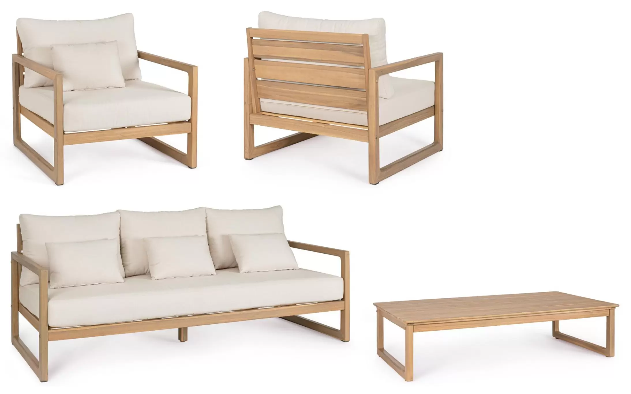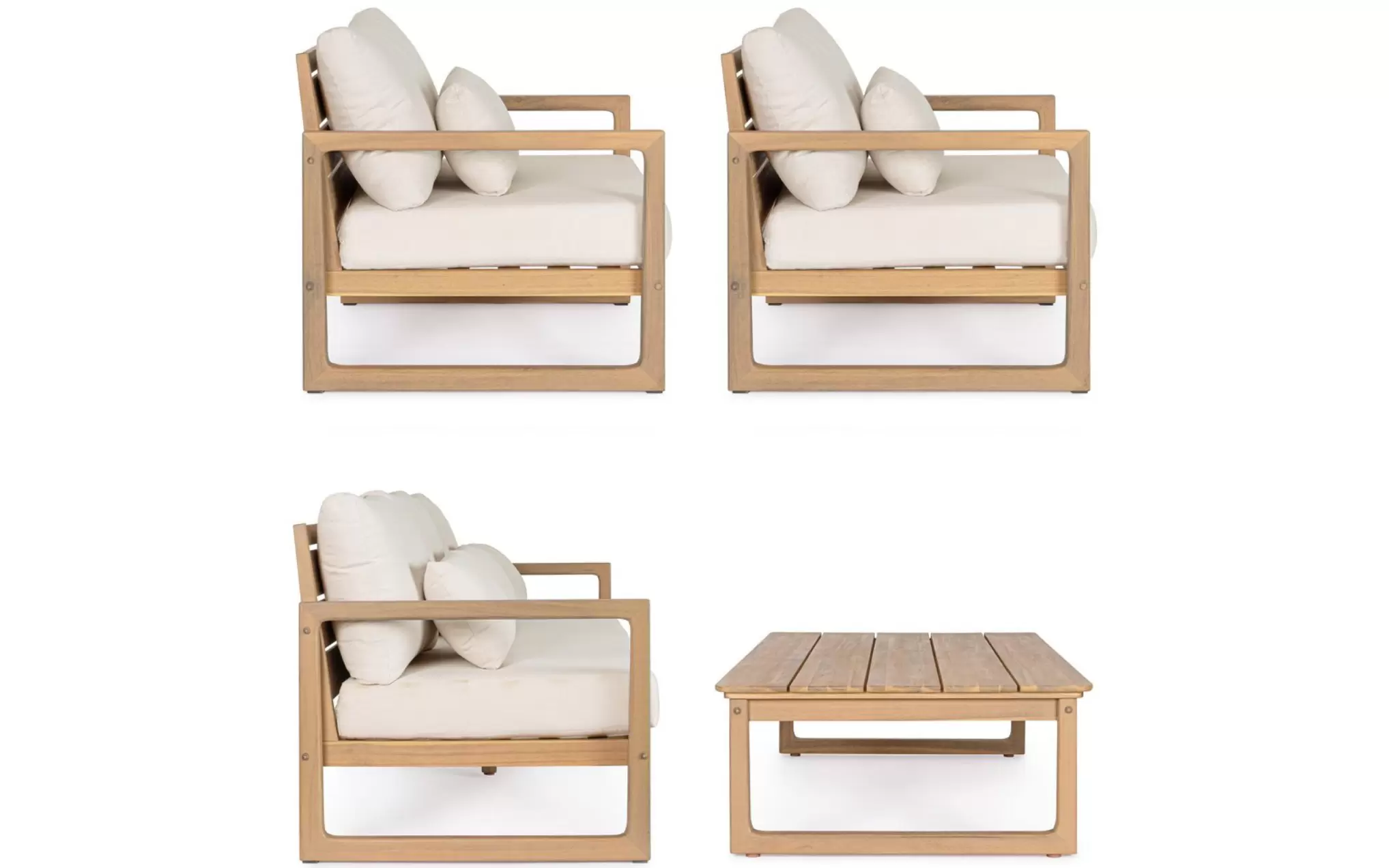 W skład zestawu wchodzi sofa 3‑osobowa, dwa fotele oraz stolik kawowy. Wszystkie elementy wykonano z dbałością o detale, a ich design łączy nowoczesną prostotę z ciepłem naturalnego drewna.