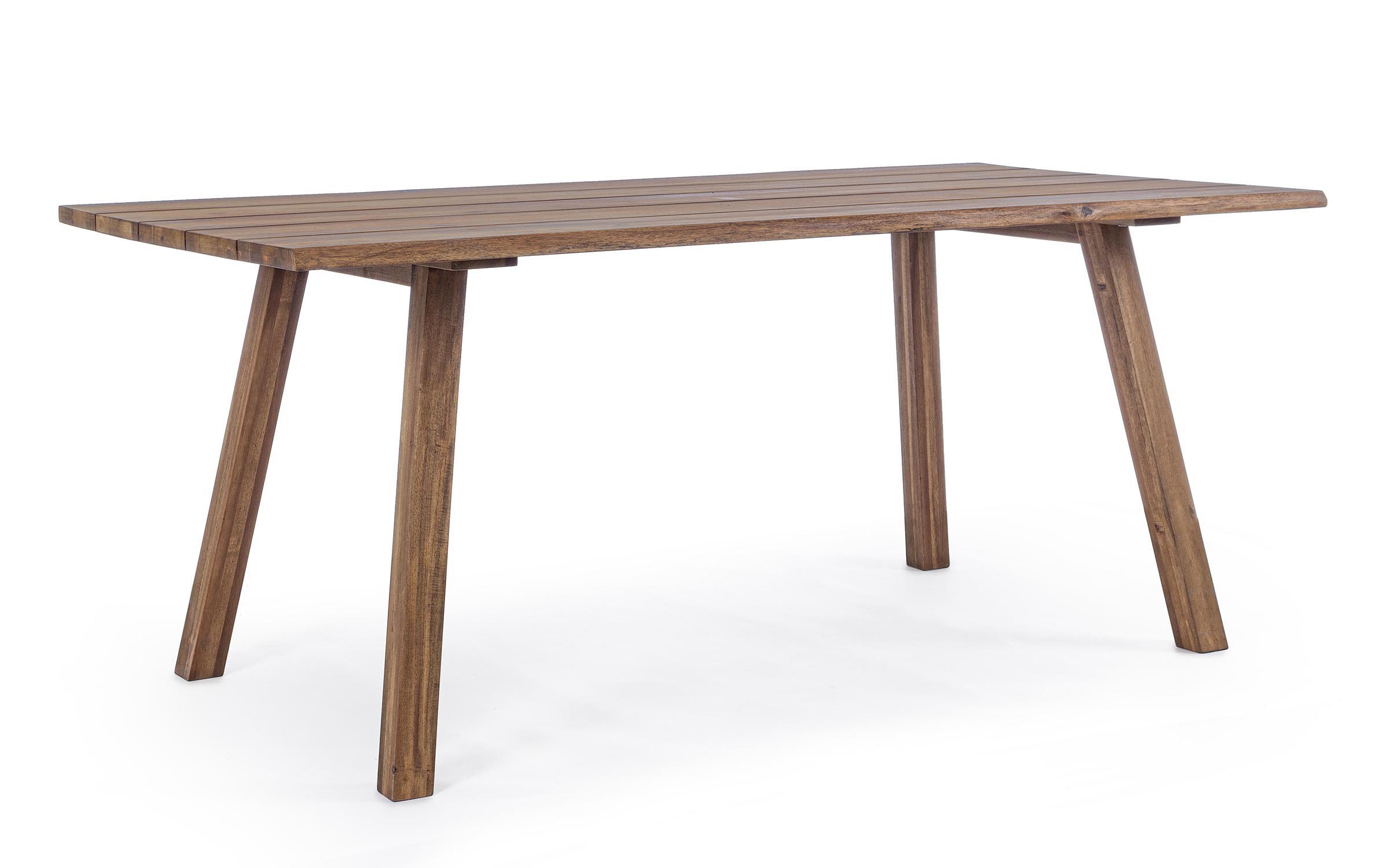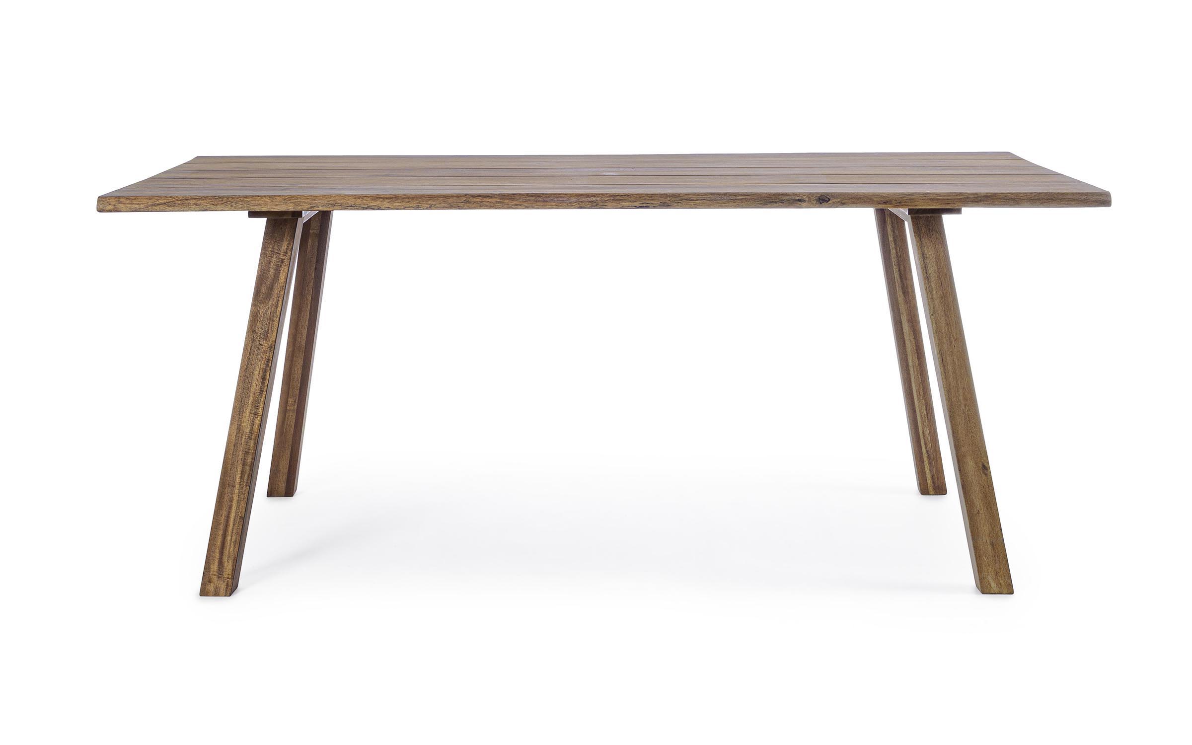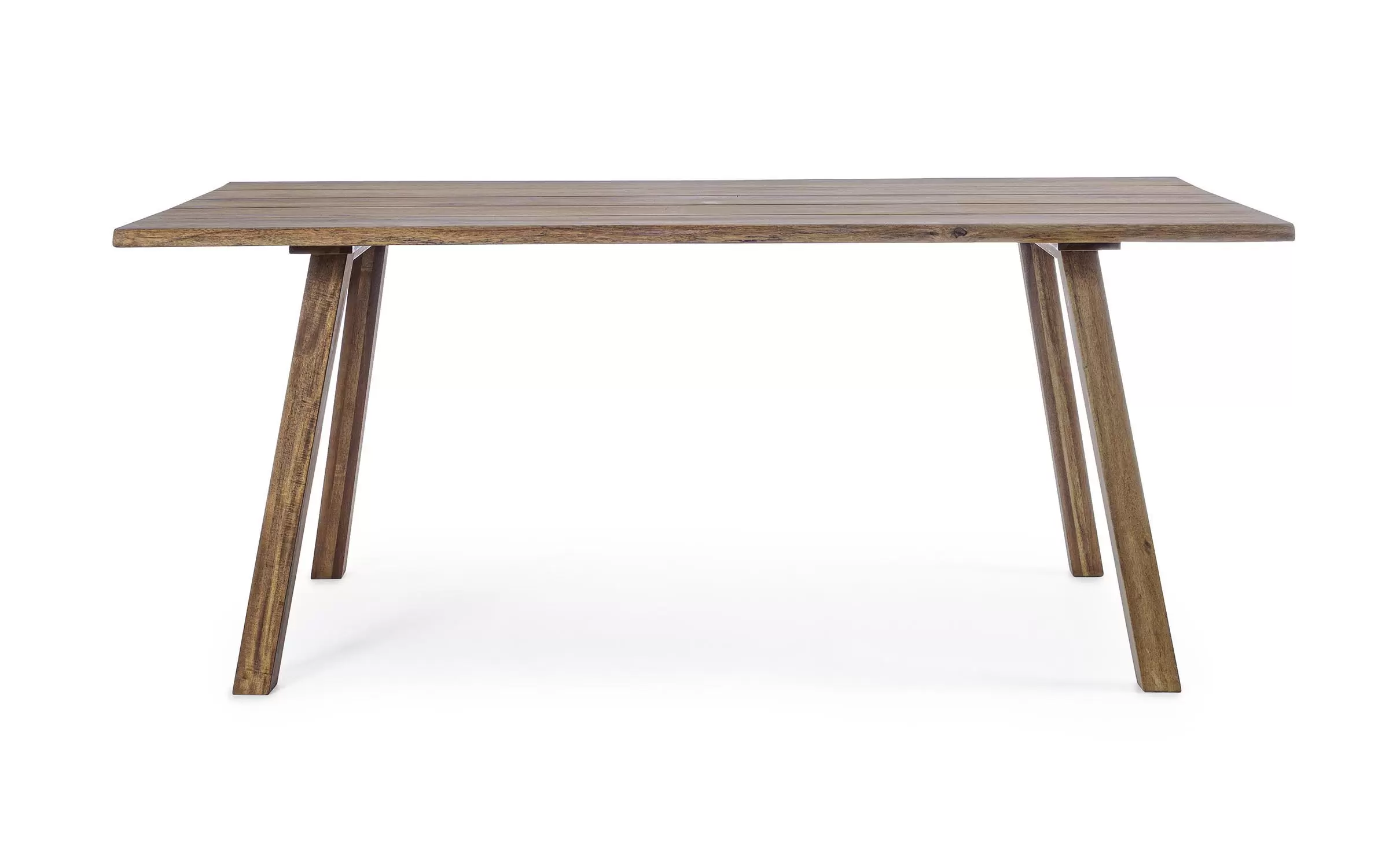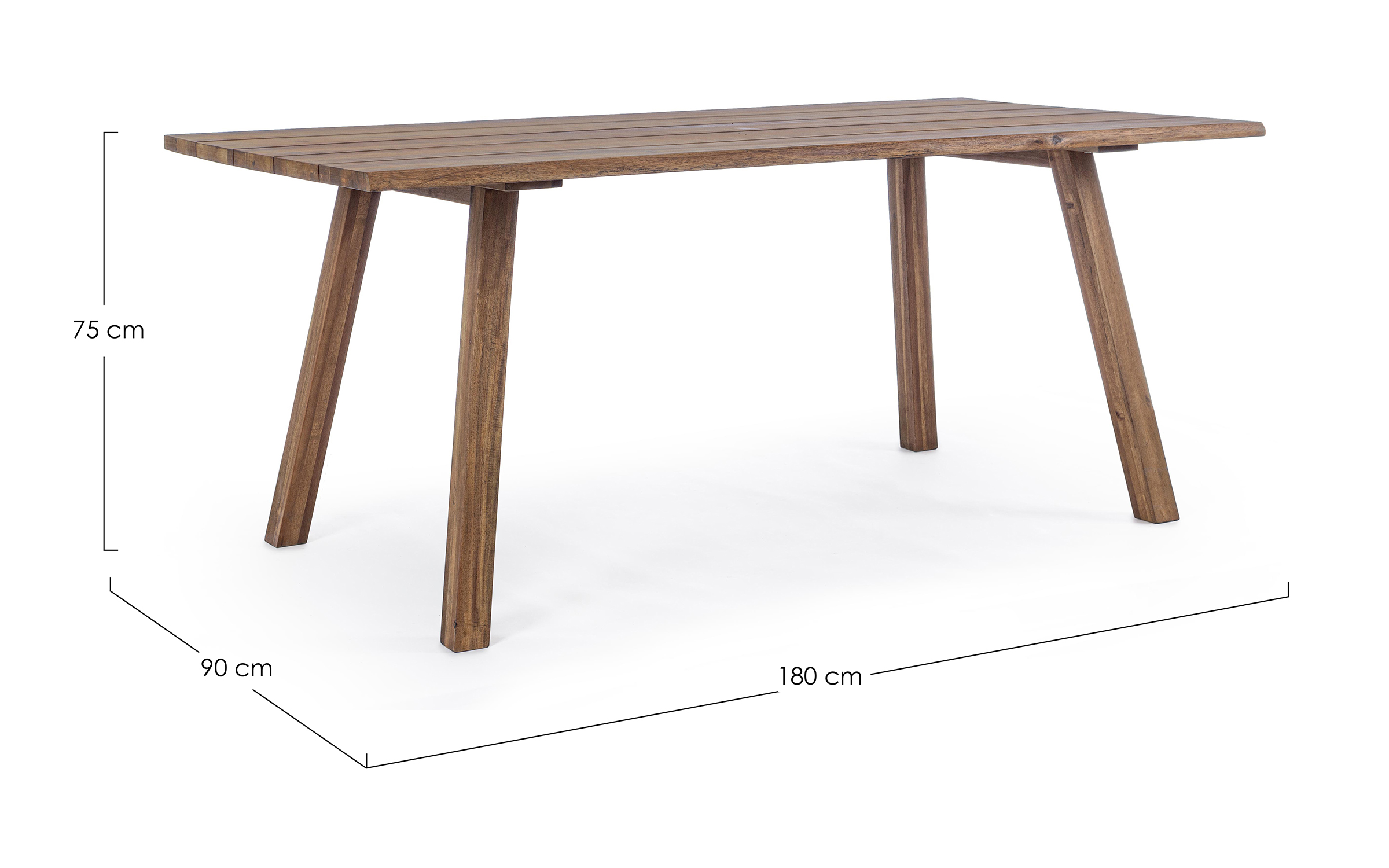 Stół prostokątny z drewna akacjowego do wnętrz, ogrodu zimowego i na zadaszony taras z blatem z podłużnymi deskami. Podstaw 4 nogi lekko pochylone.