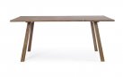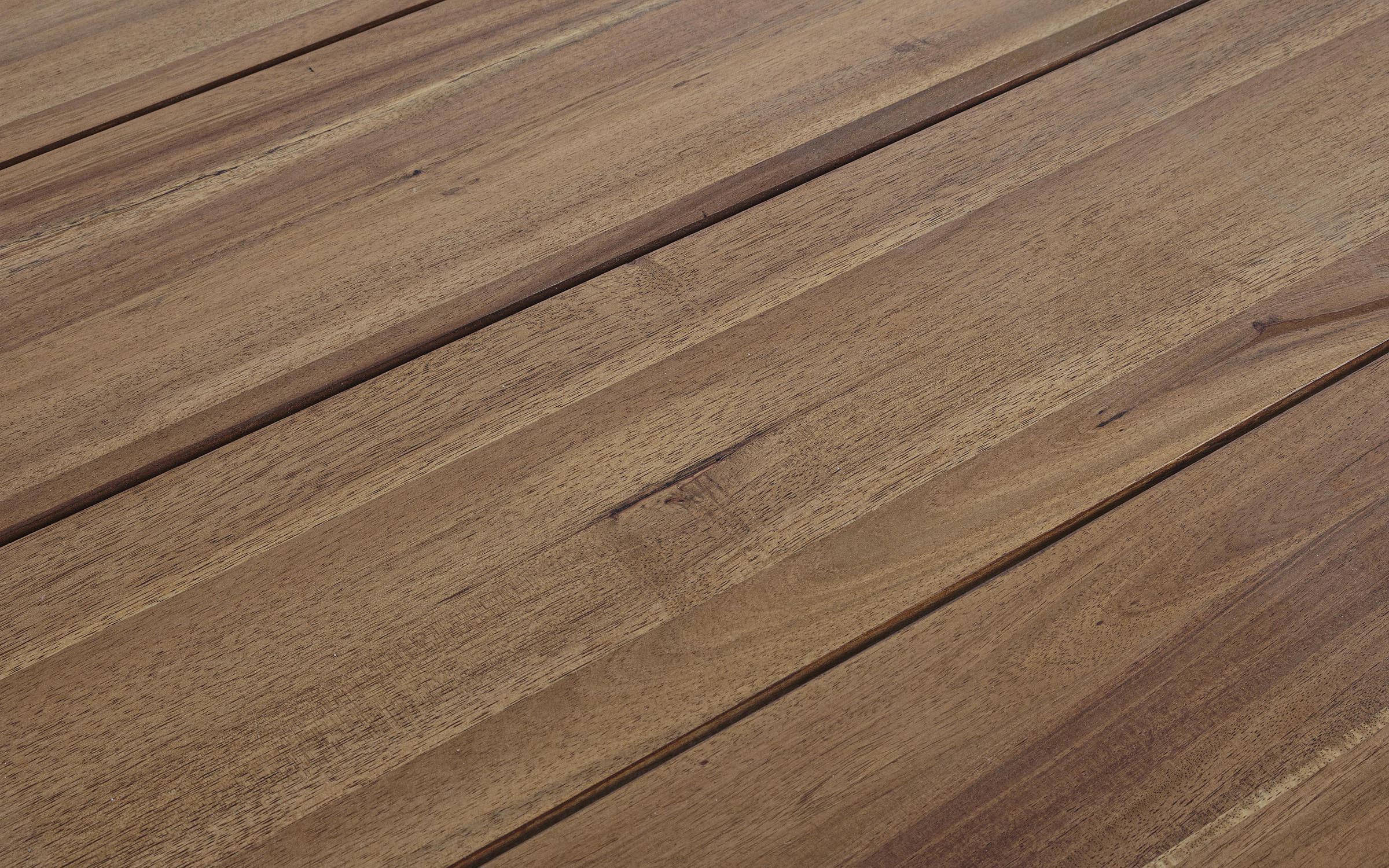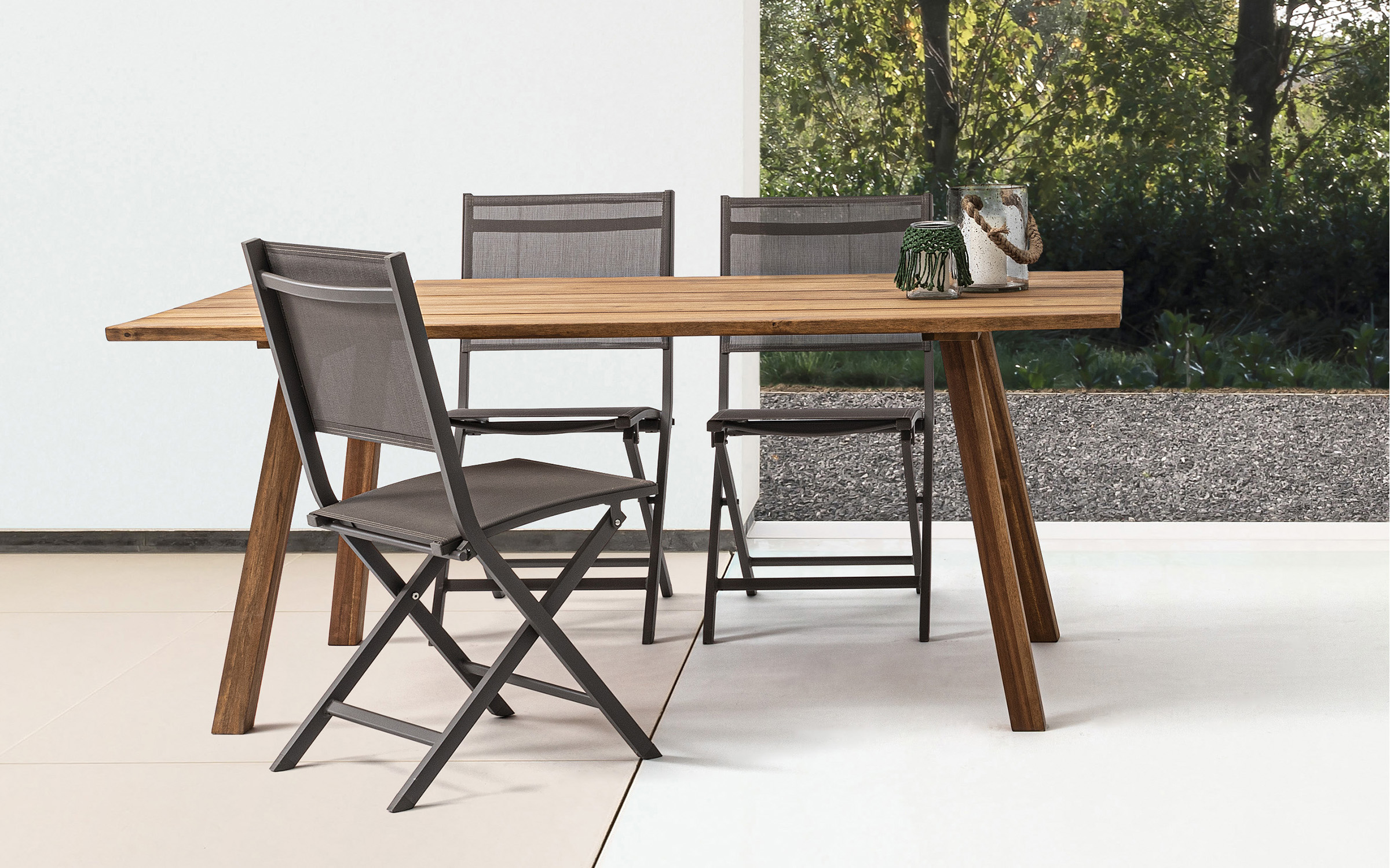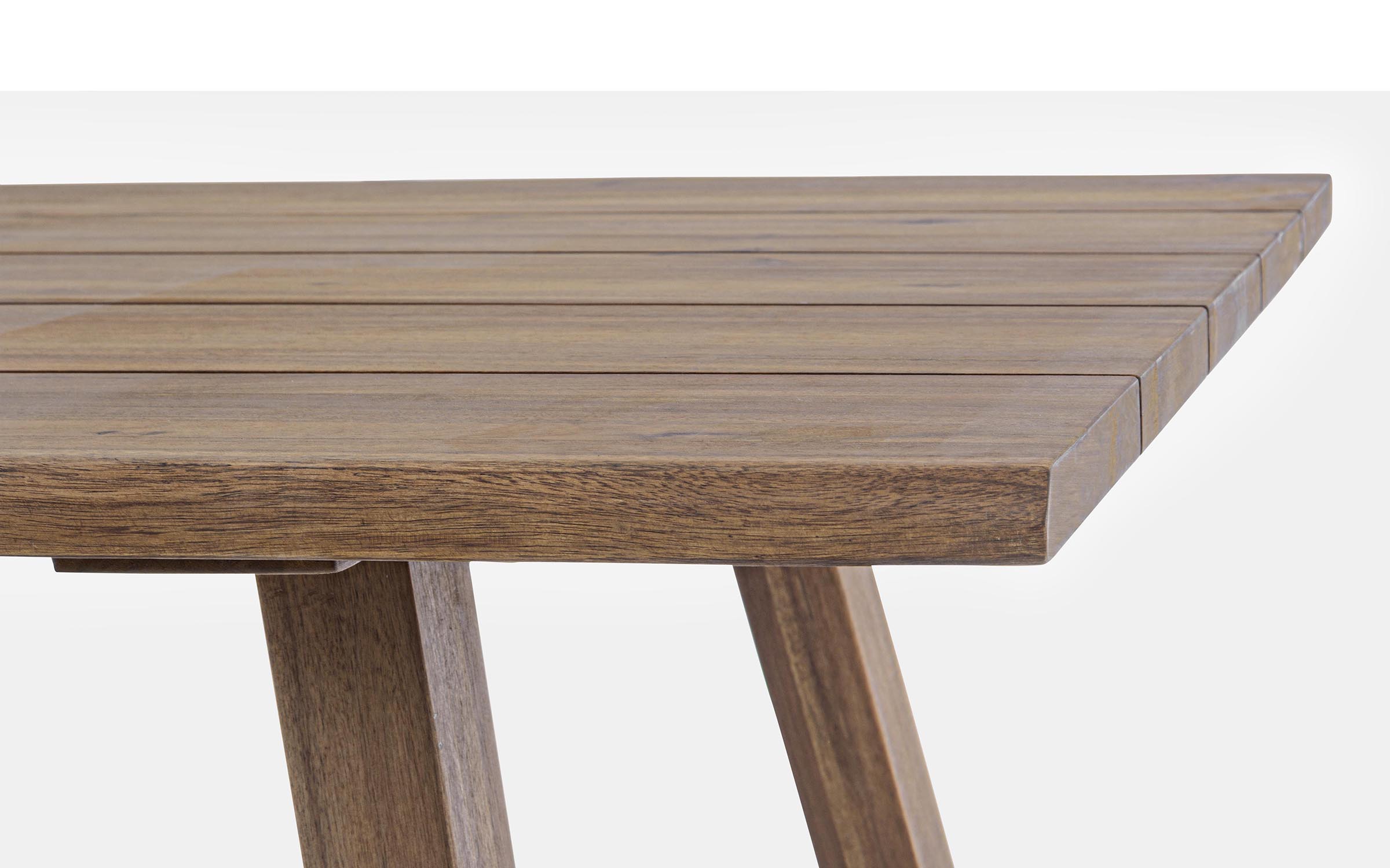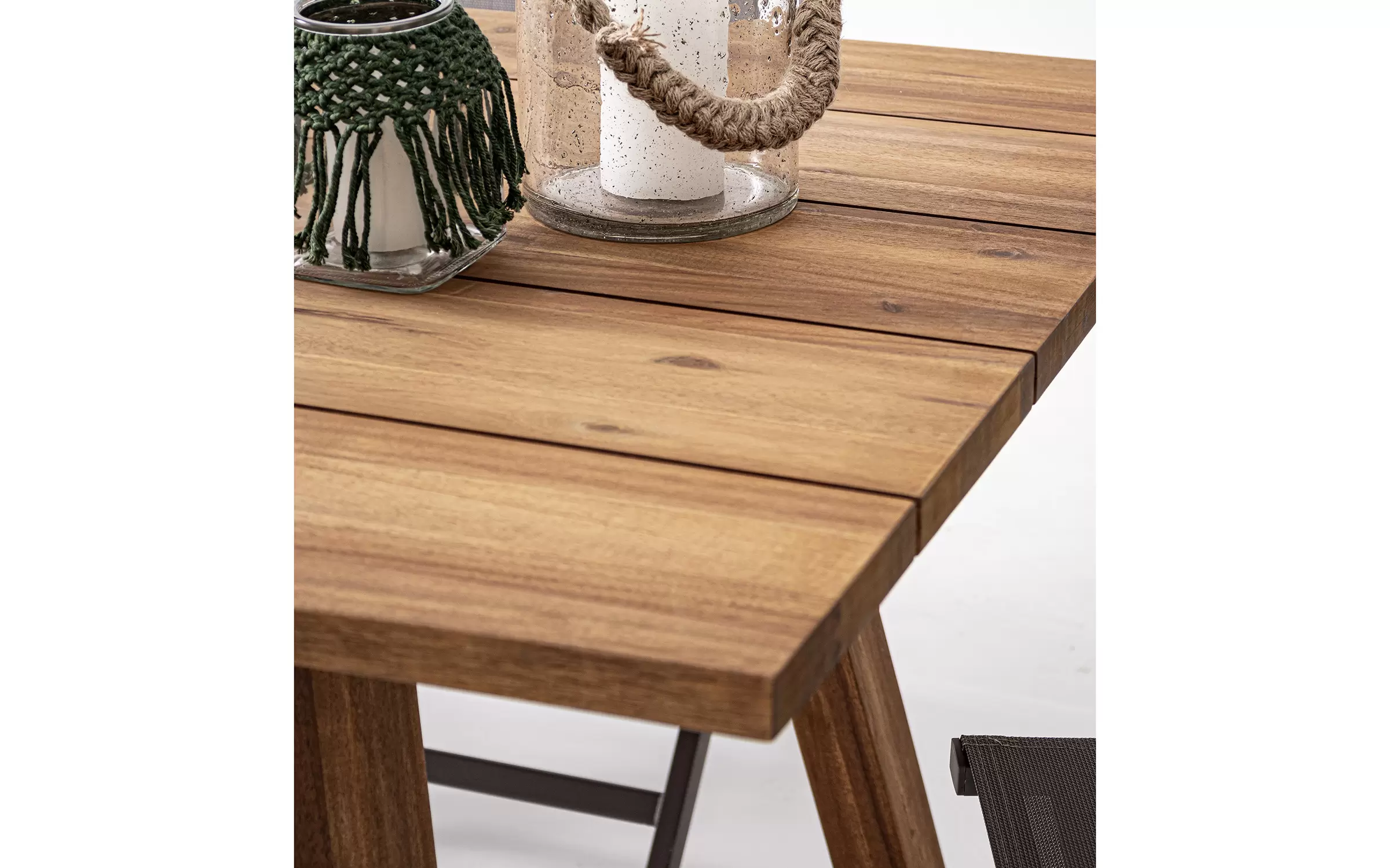 Stół prostokątny z drewna akacjowego do wnętrz, ogrodu zimowego i na zadaszony taras z blatem z podłużnymi deskami. Podstaw 4 nogi lekko pochylone.