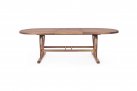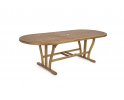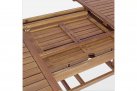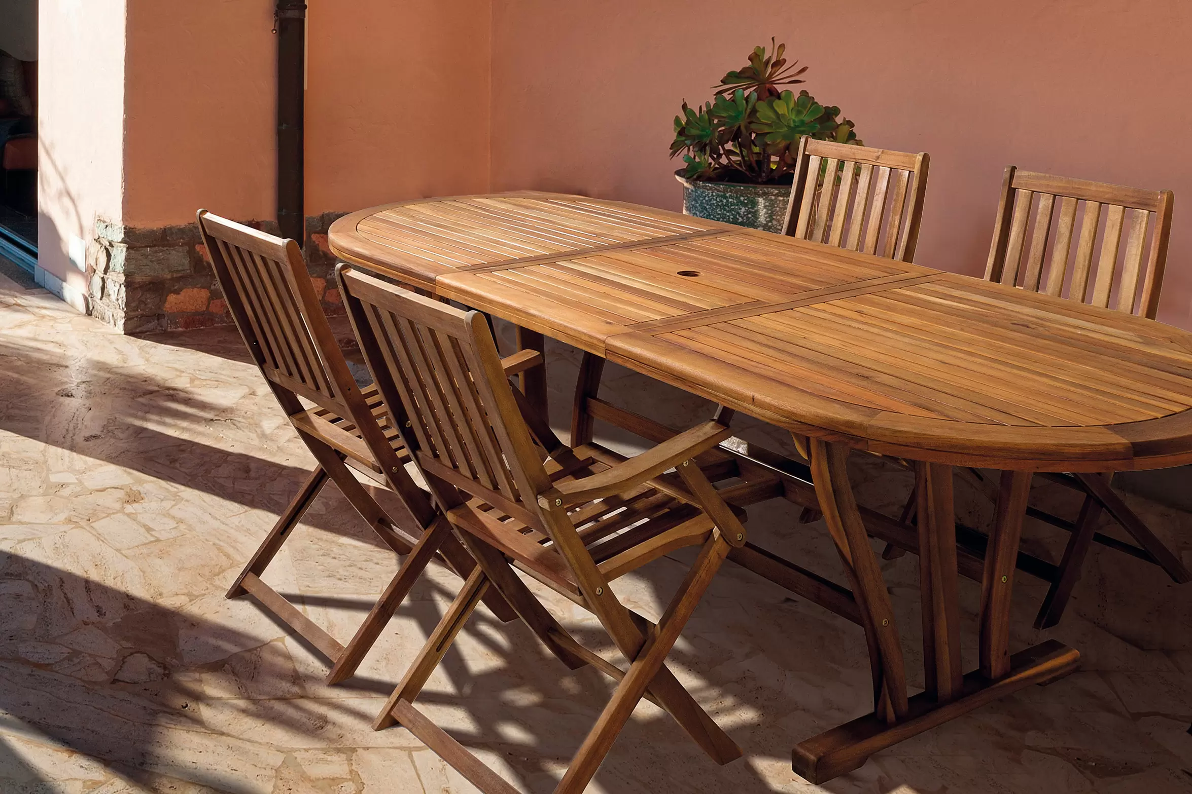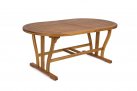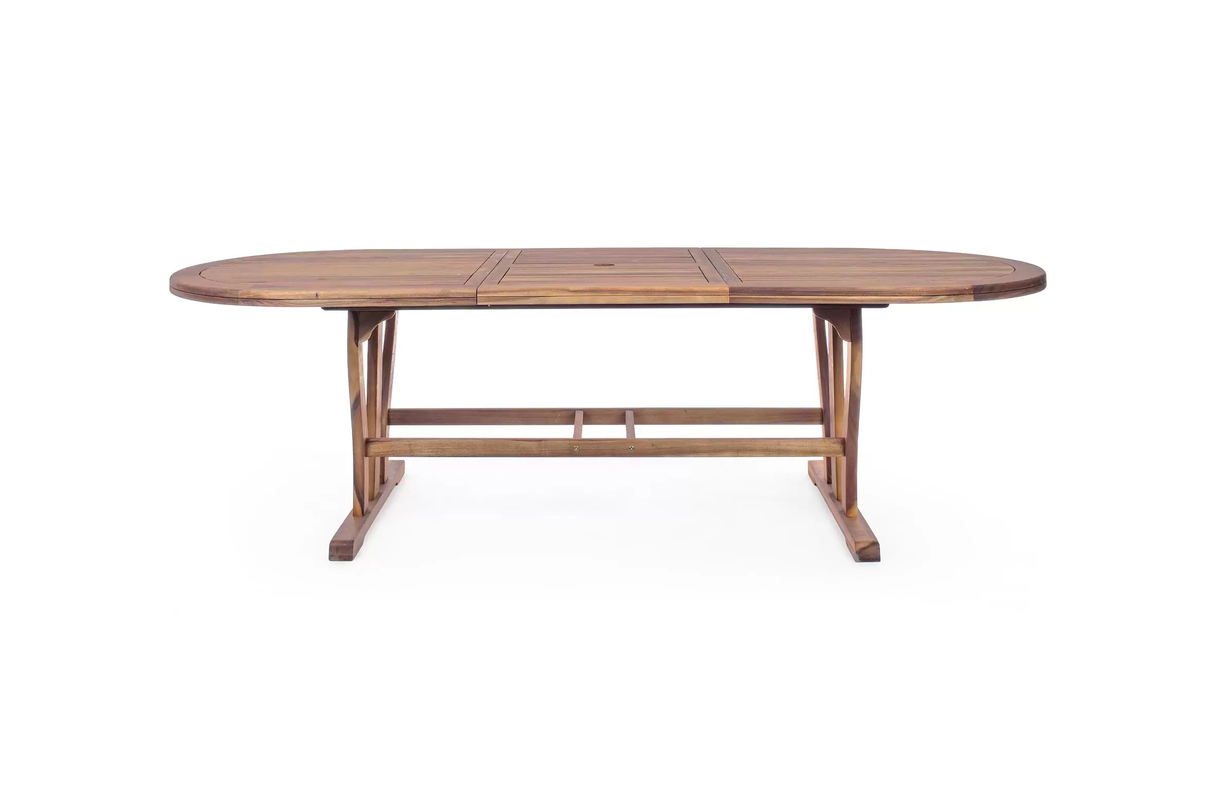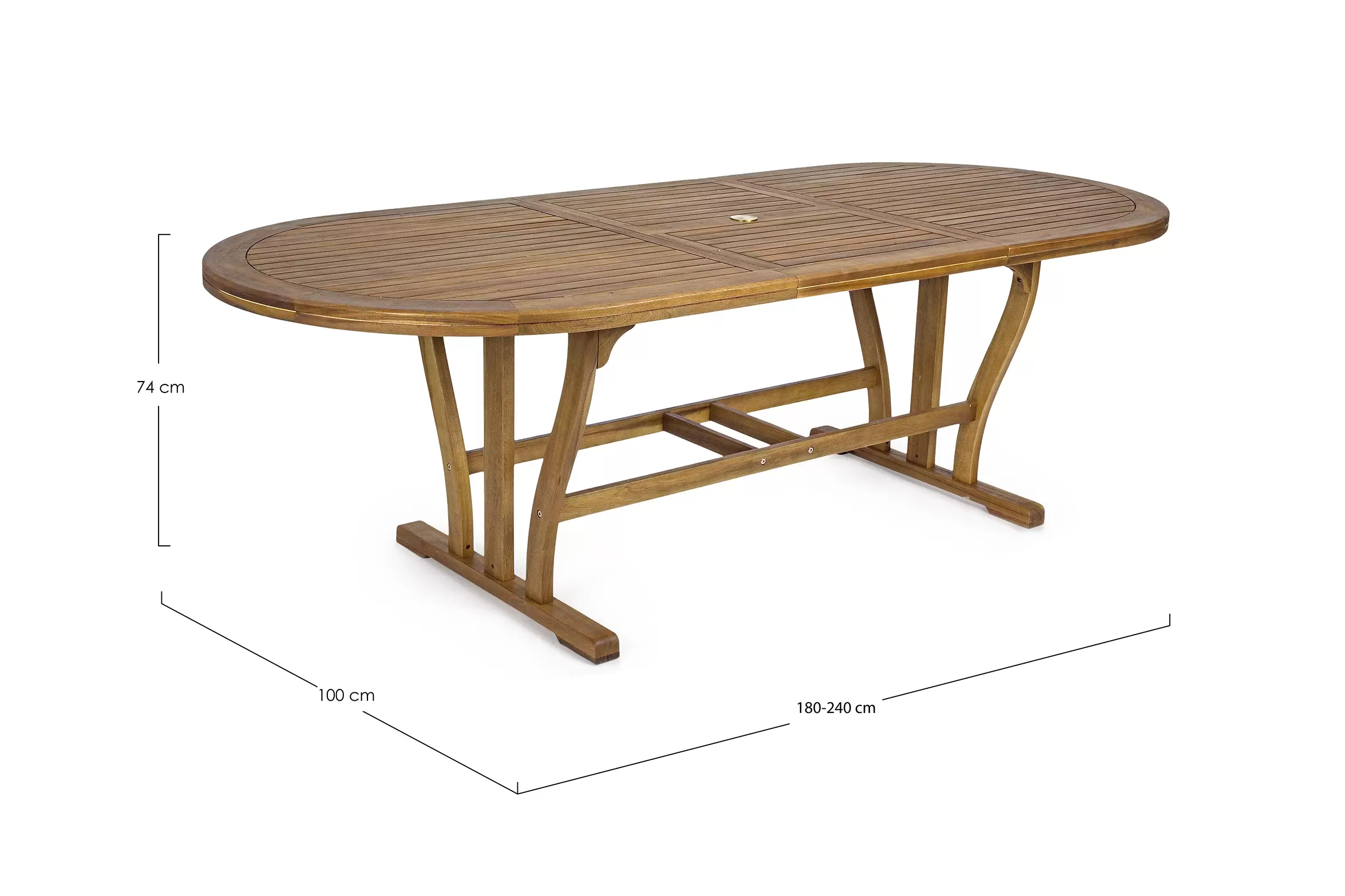 Stół z drewna akacjowego do wnętrz, ogrodu zimowego i na zadaszony taras. Wydłużany blat z motylkowym systemem rozkładania. Zaokrąglone końce stołu. Otwór na parasol.
