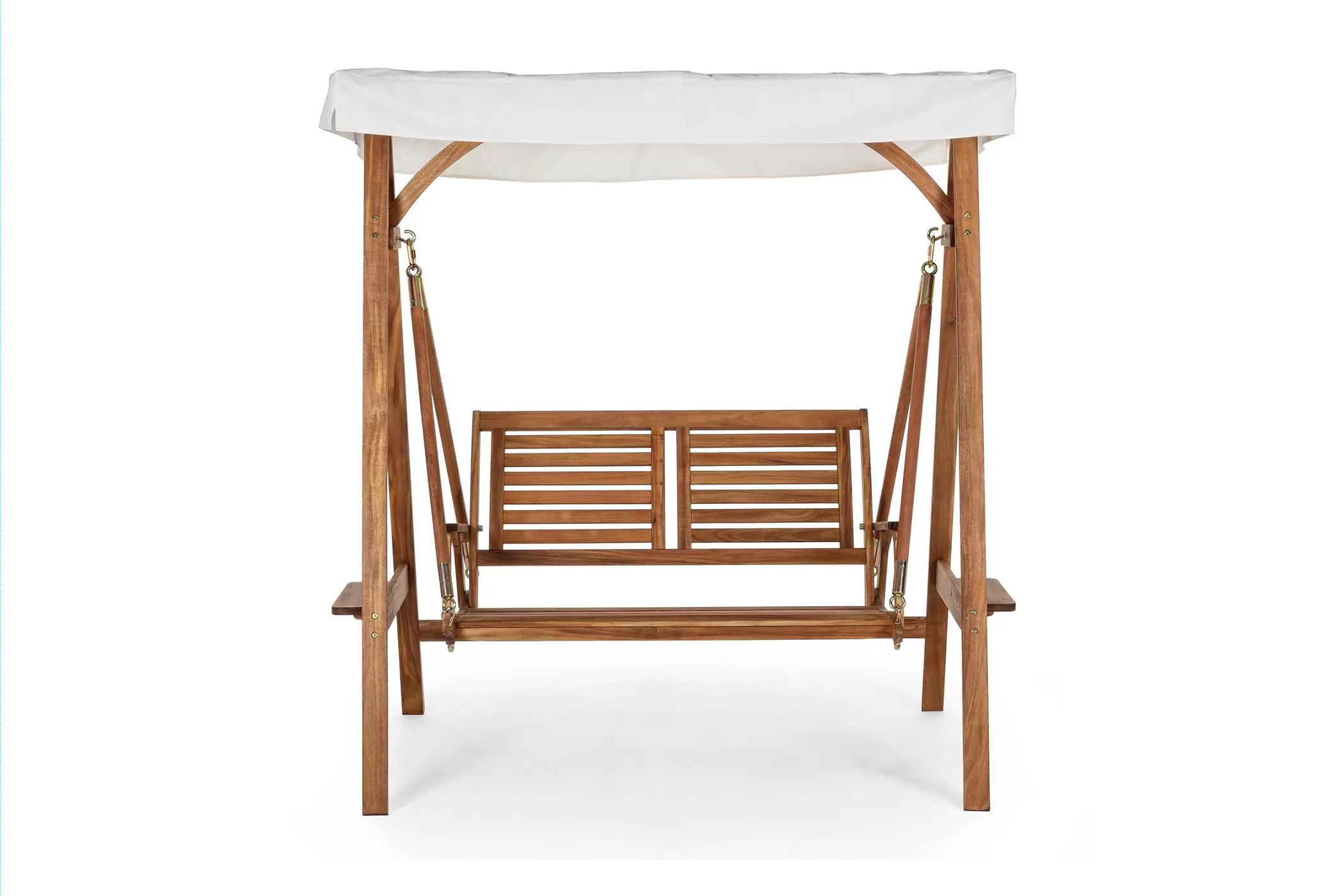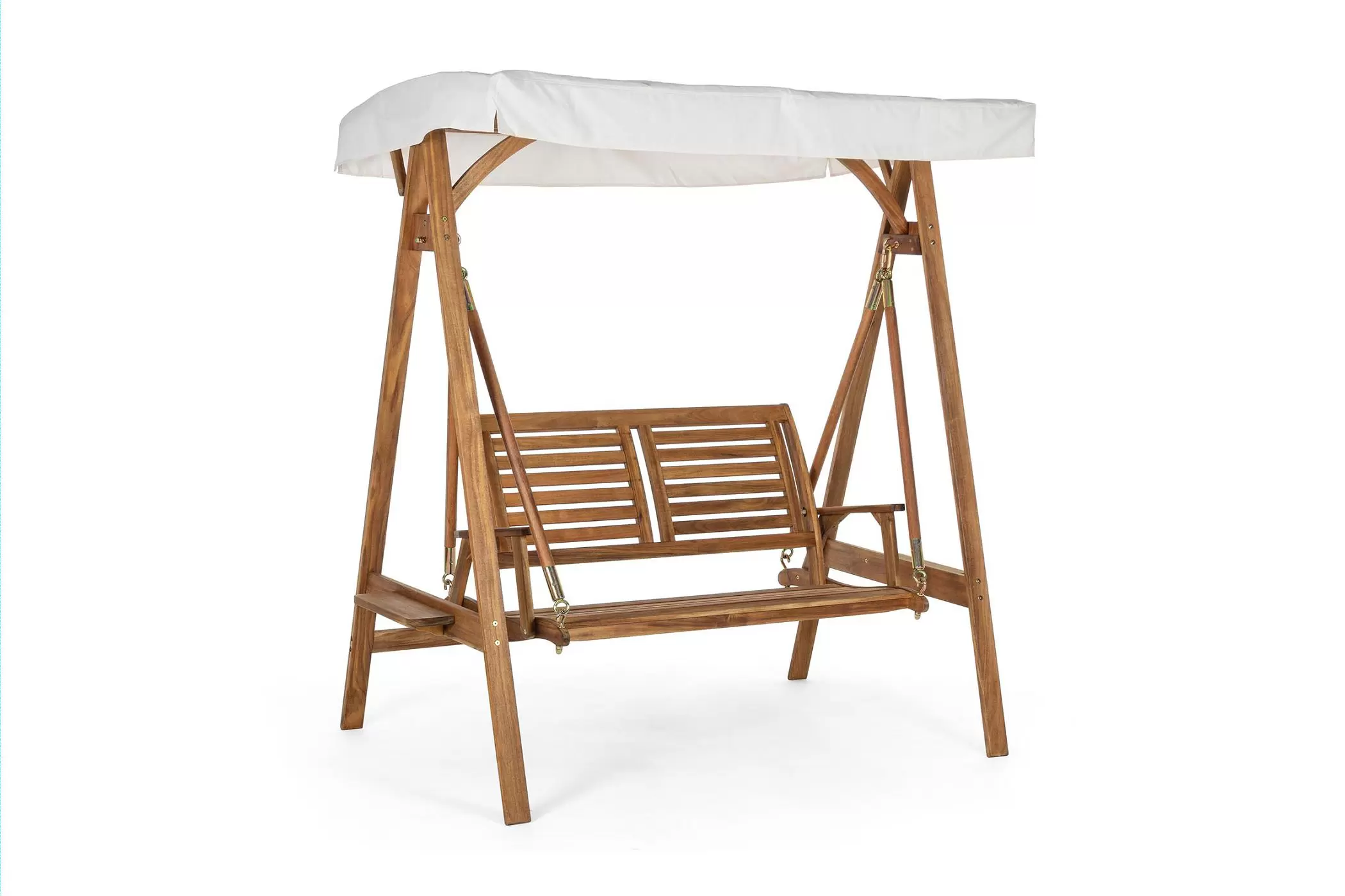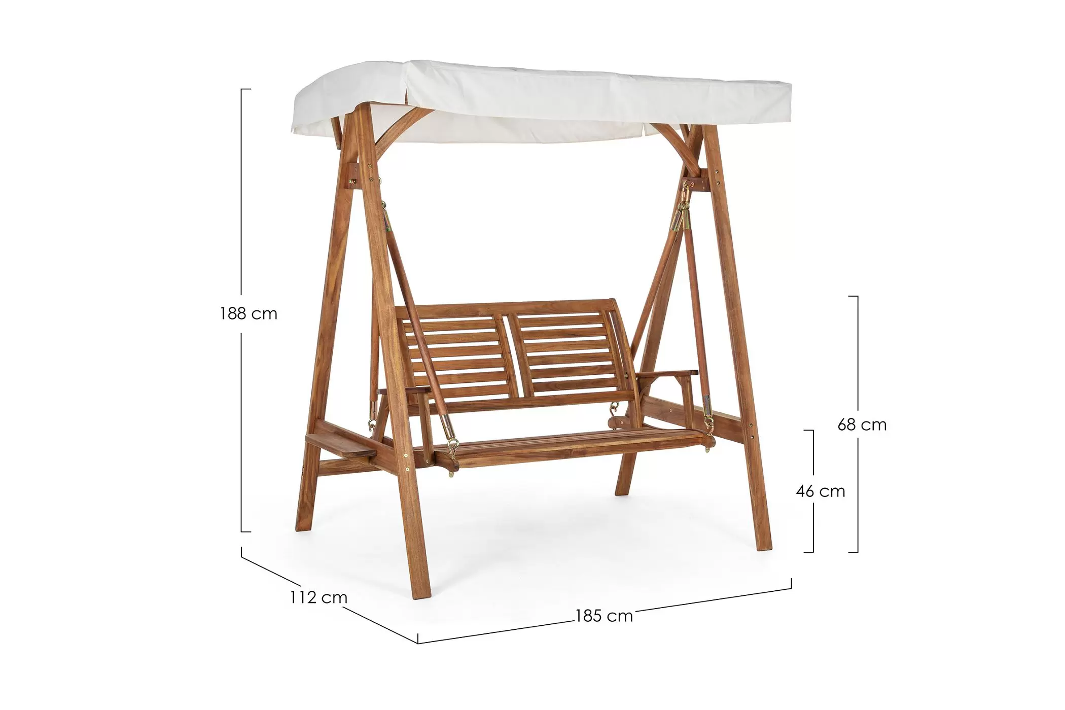 Huśtawka ogrodowa z drewna akacji z daszkiem. siedzisko o wymiarach 119 x 95 cm.