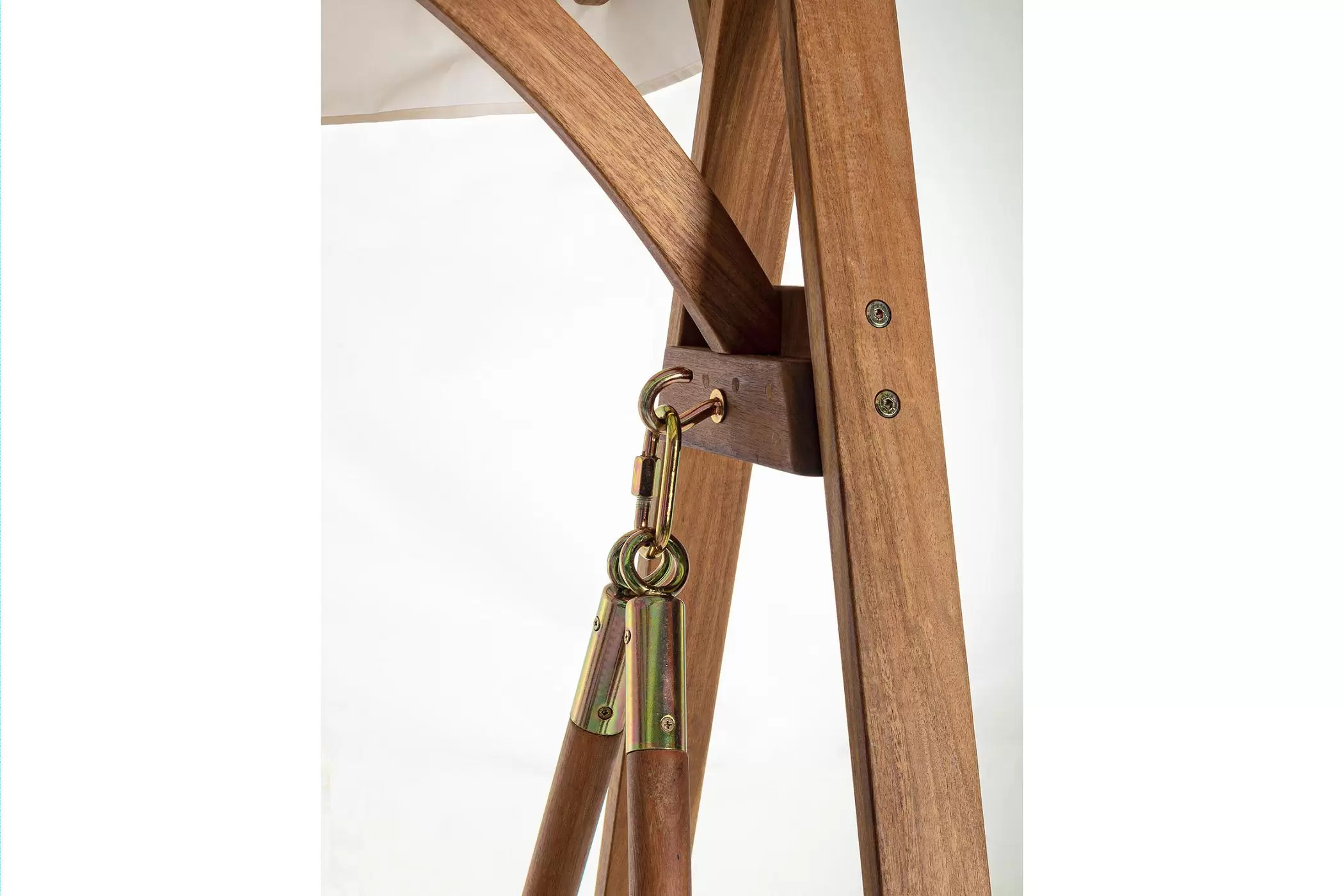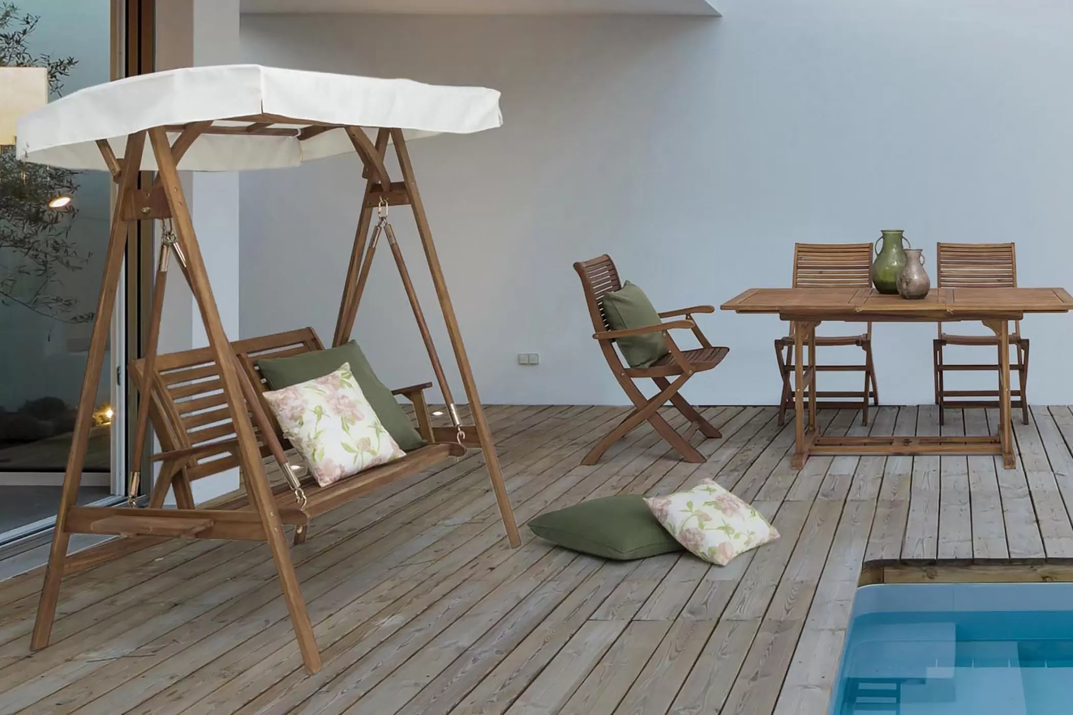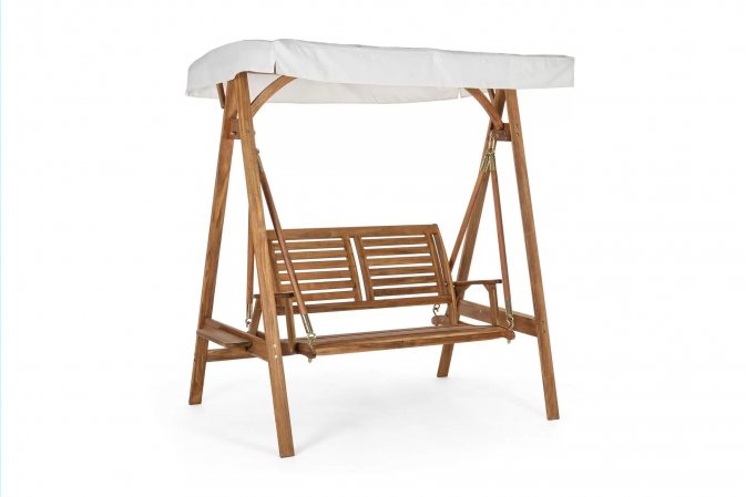 Huśtawka ogrodowa z drewna akacji z daszkiem. siedzisko o wymiarach 119 x 95 cm.