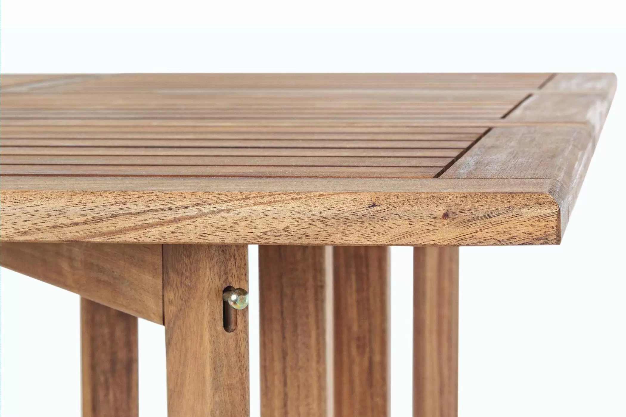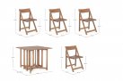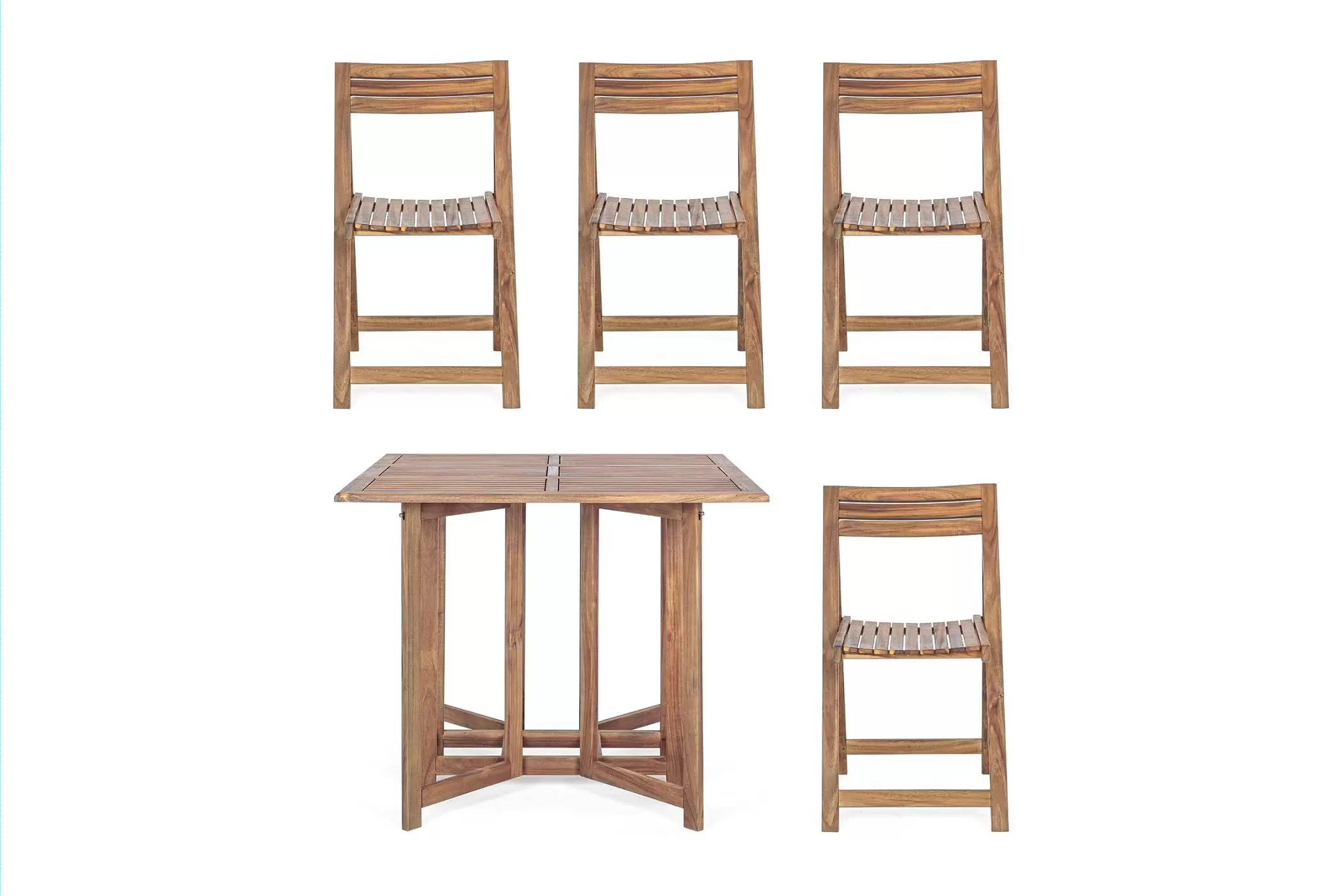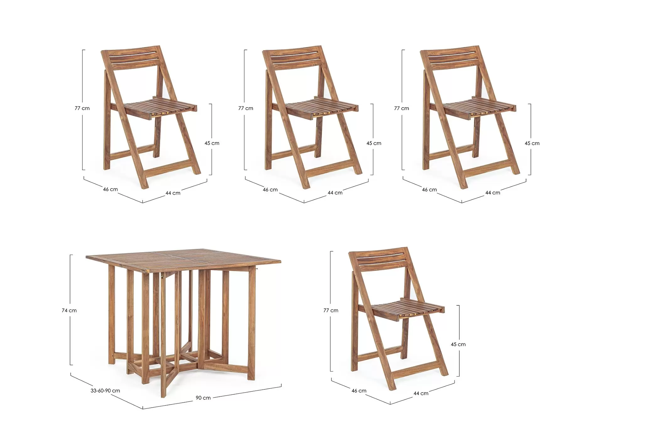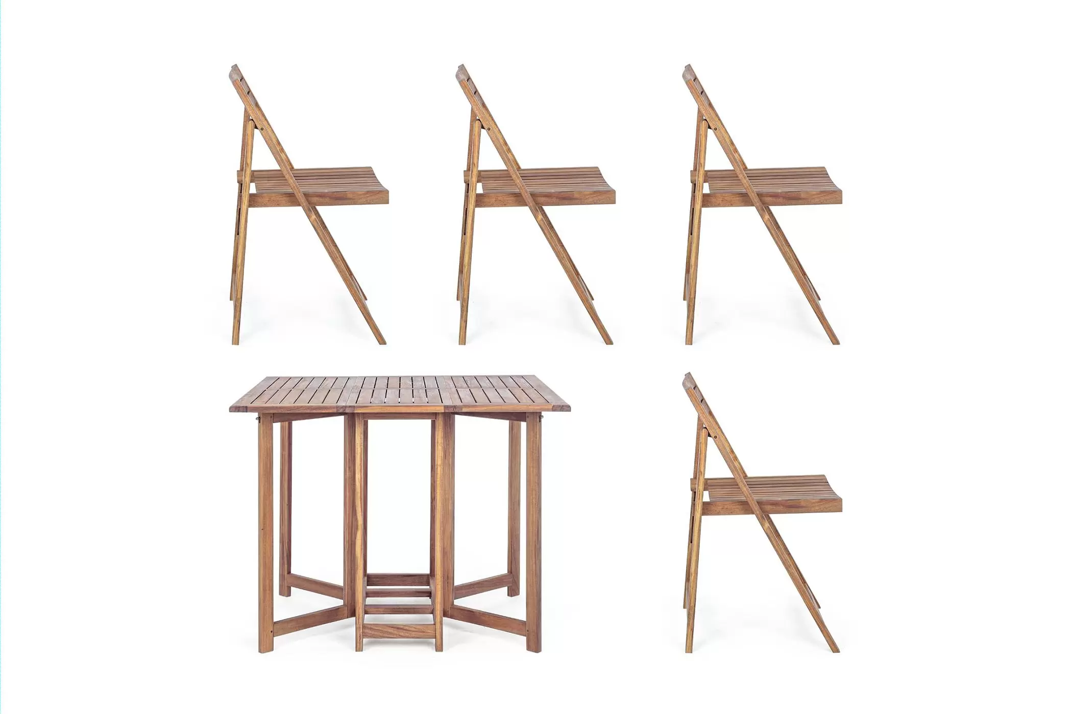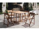 Składany komplet stołowy z drewna akacjowego dla 4 osób. Blat stołu oraz siedziska i oparcia krzeseł wykonane z deseczek. Boki blatu stołu można złożyć. Krzesła składane co ułatwia przechowywanie.