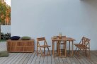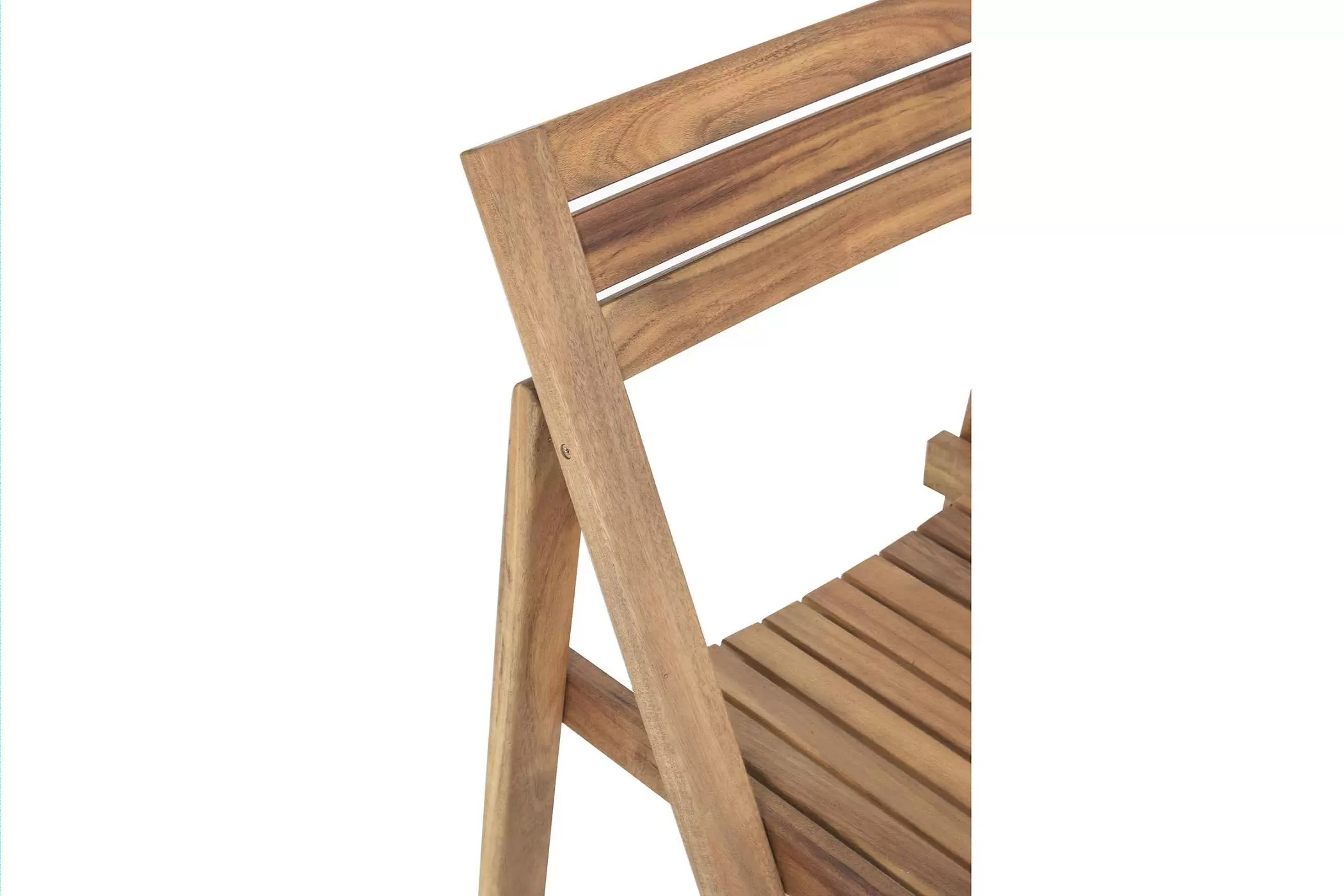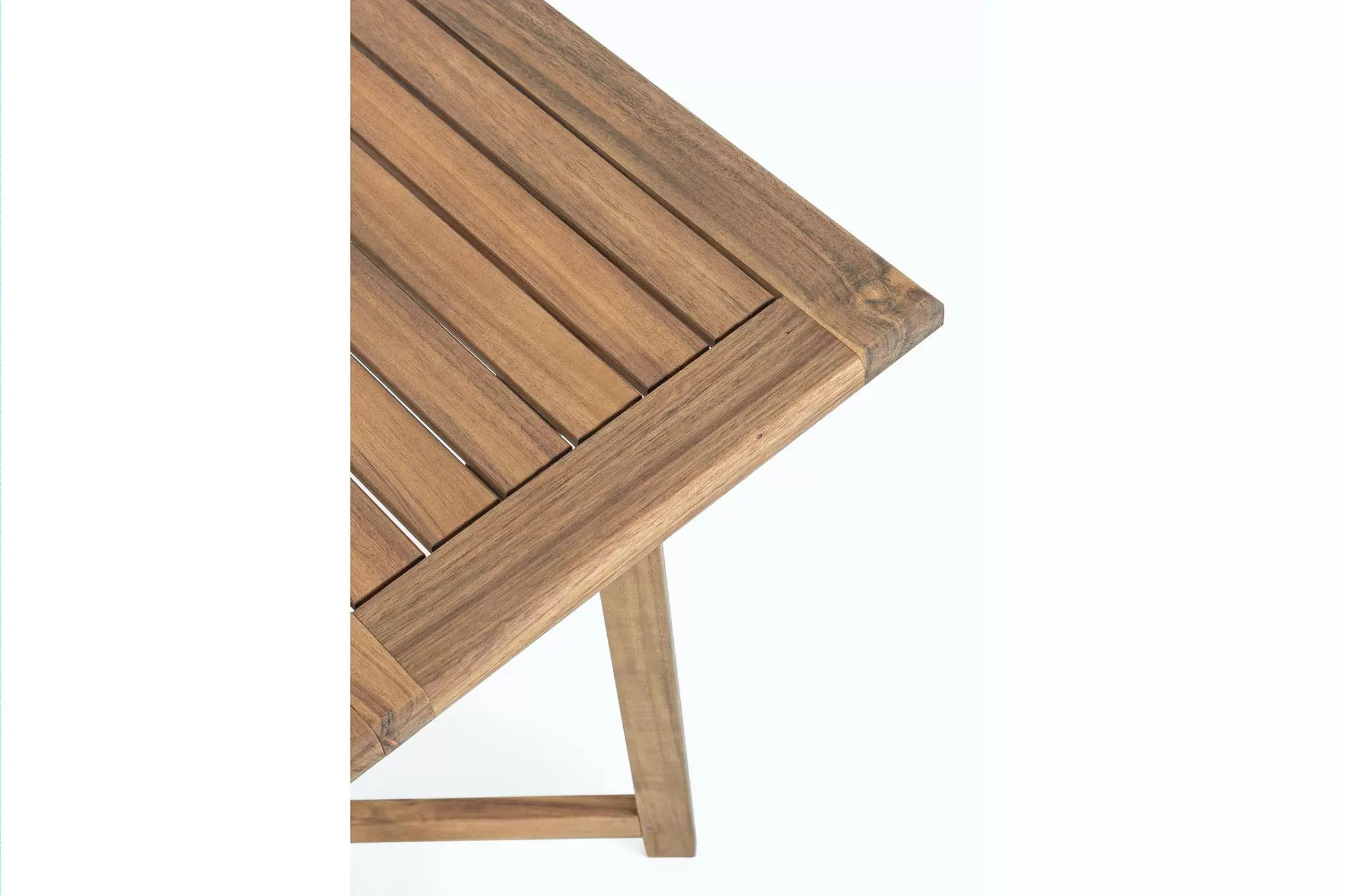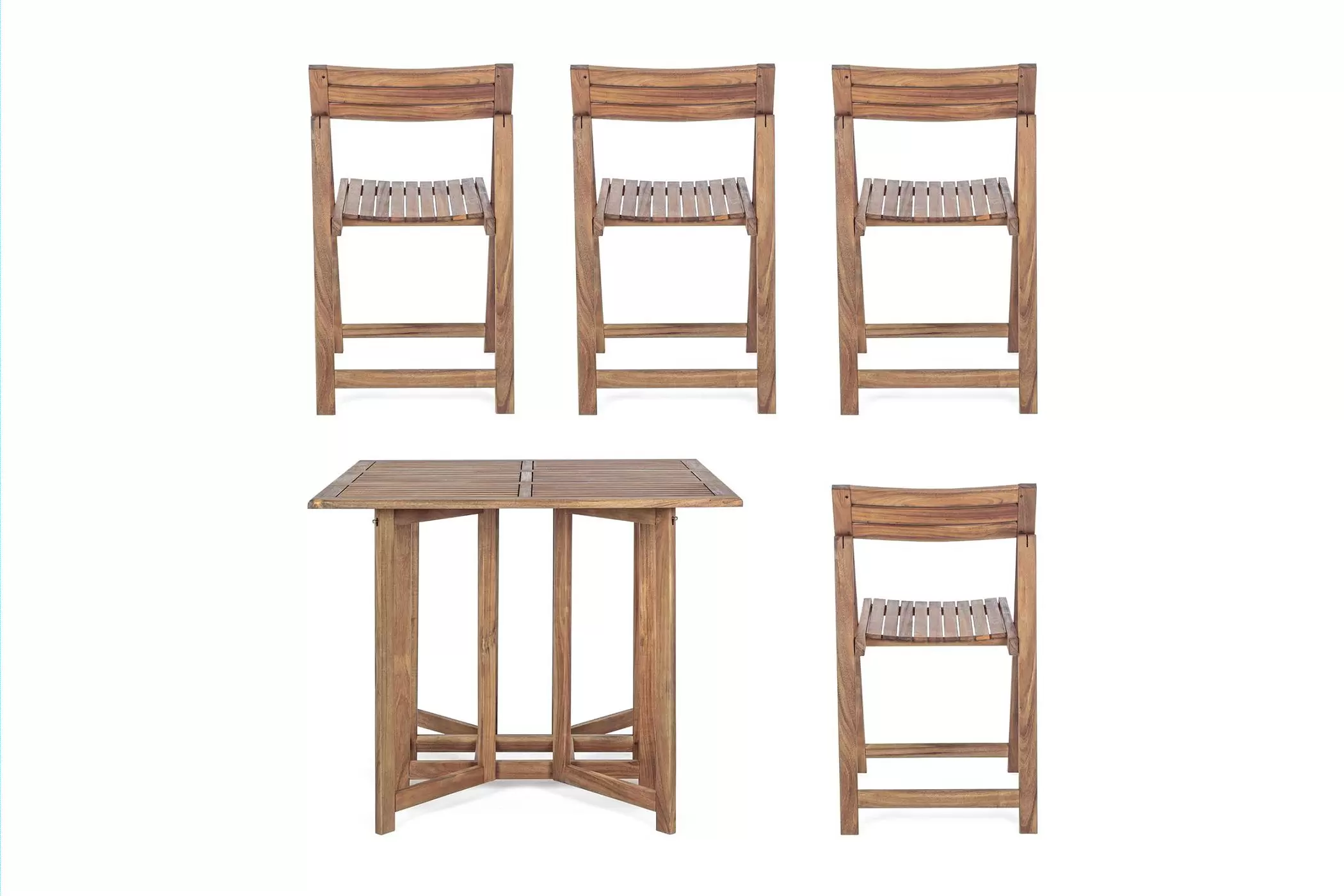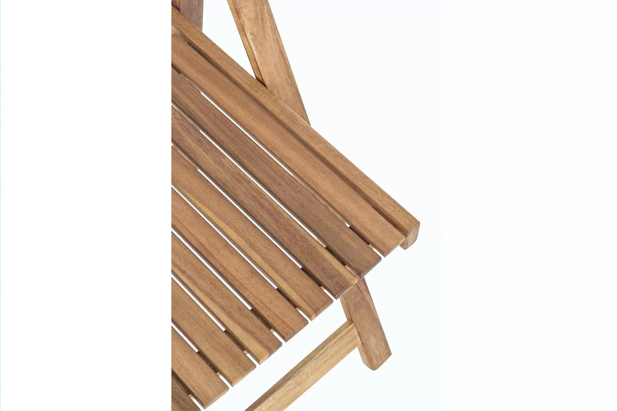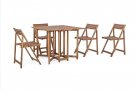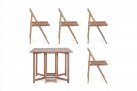 Składany komplet stołowy z drewna akacjowego dla 4 osób. Blat stołu oraz siedziska i oparcia krzeseł wykonane z deseczek. Boki blatu stołu można złożyć. Krzesła składane co ułatwia przechowywanie.