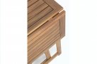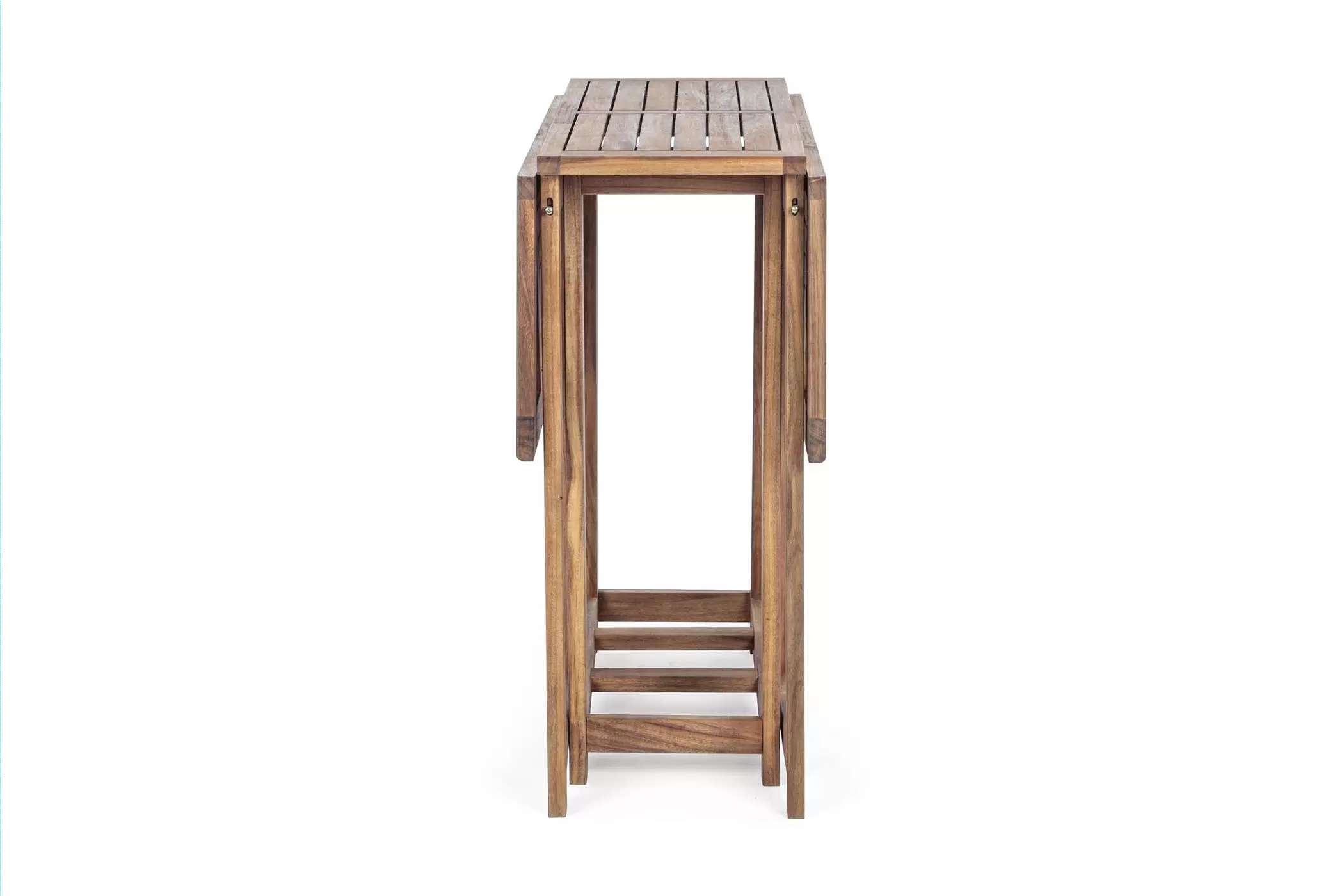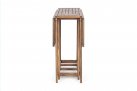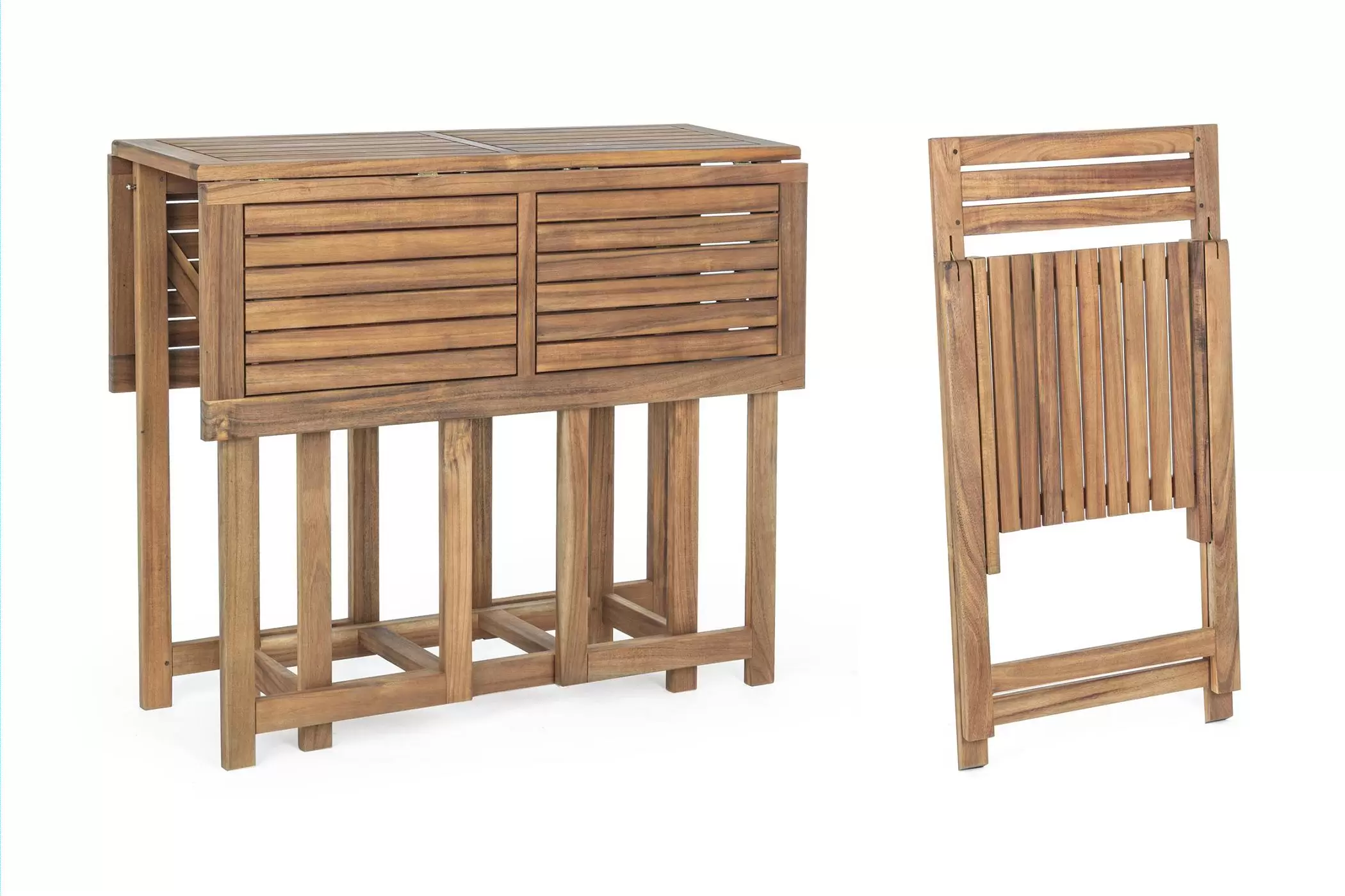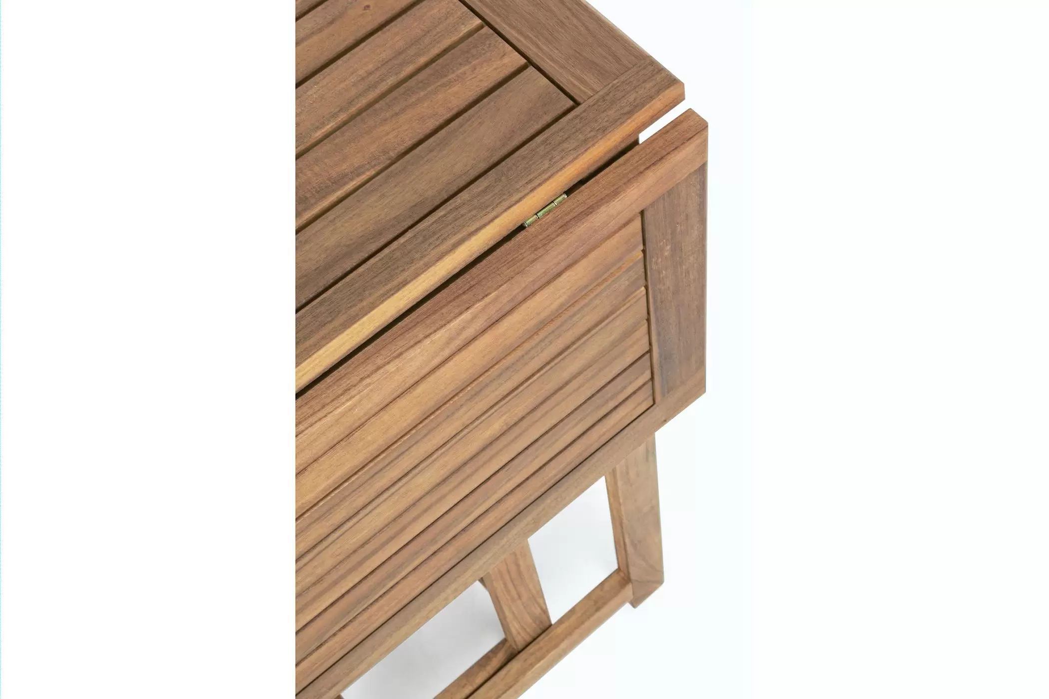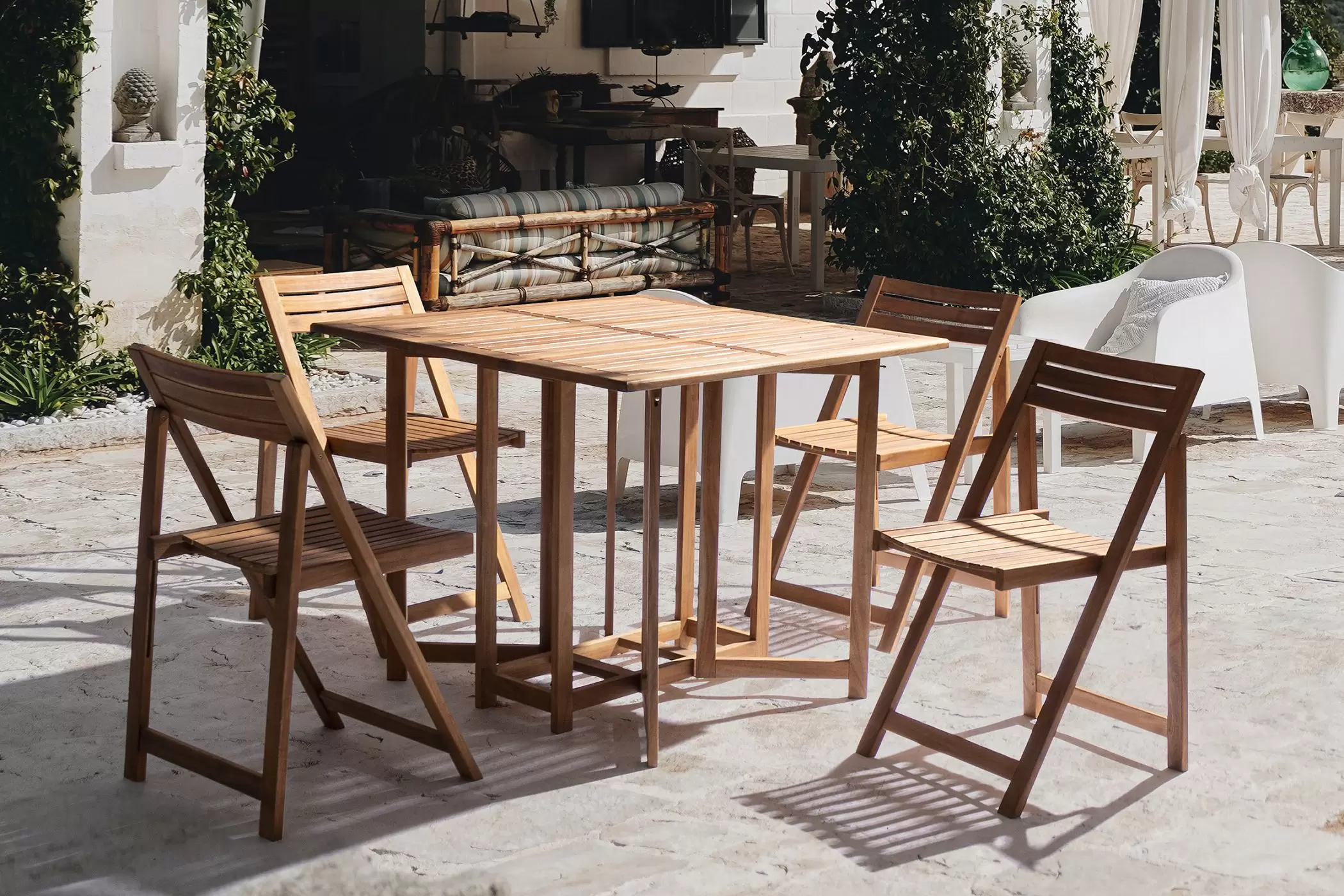 Składany komplet stołowy z drewna akacjowego dla 4 osób. Blat stołu oraz siedziska i oparcia krzeseł wykonane z deseczek. Boki blatu stołu można złożyć. Krzesła składane co ułatwia przechowywanie.