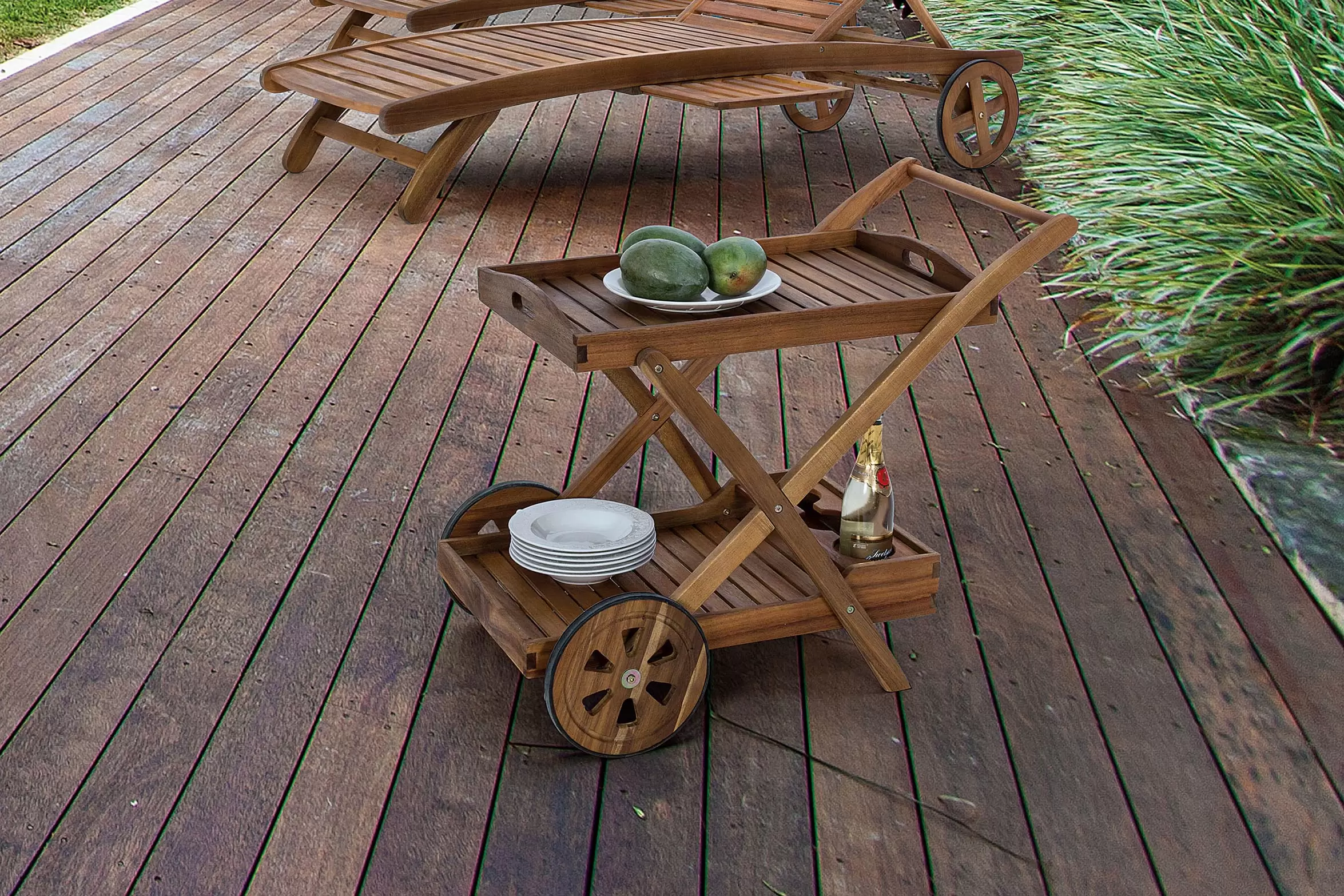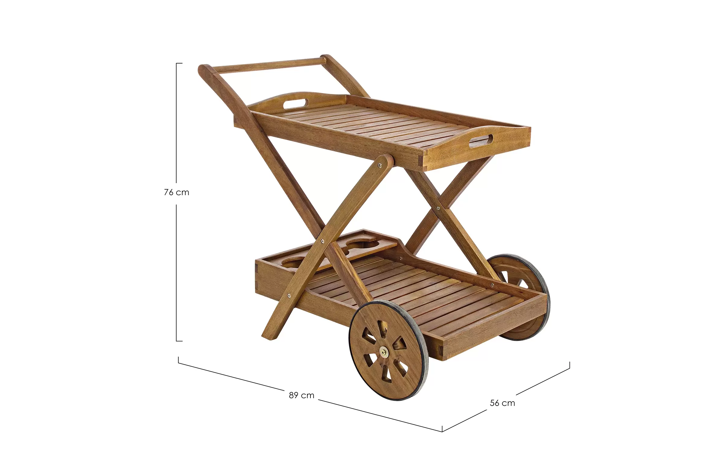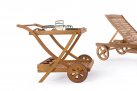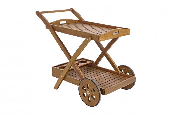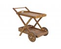 Wózek na drinki z dwoma tacami. Na dolnej tacy znajdują się uchwyty na butelki.