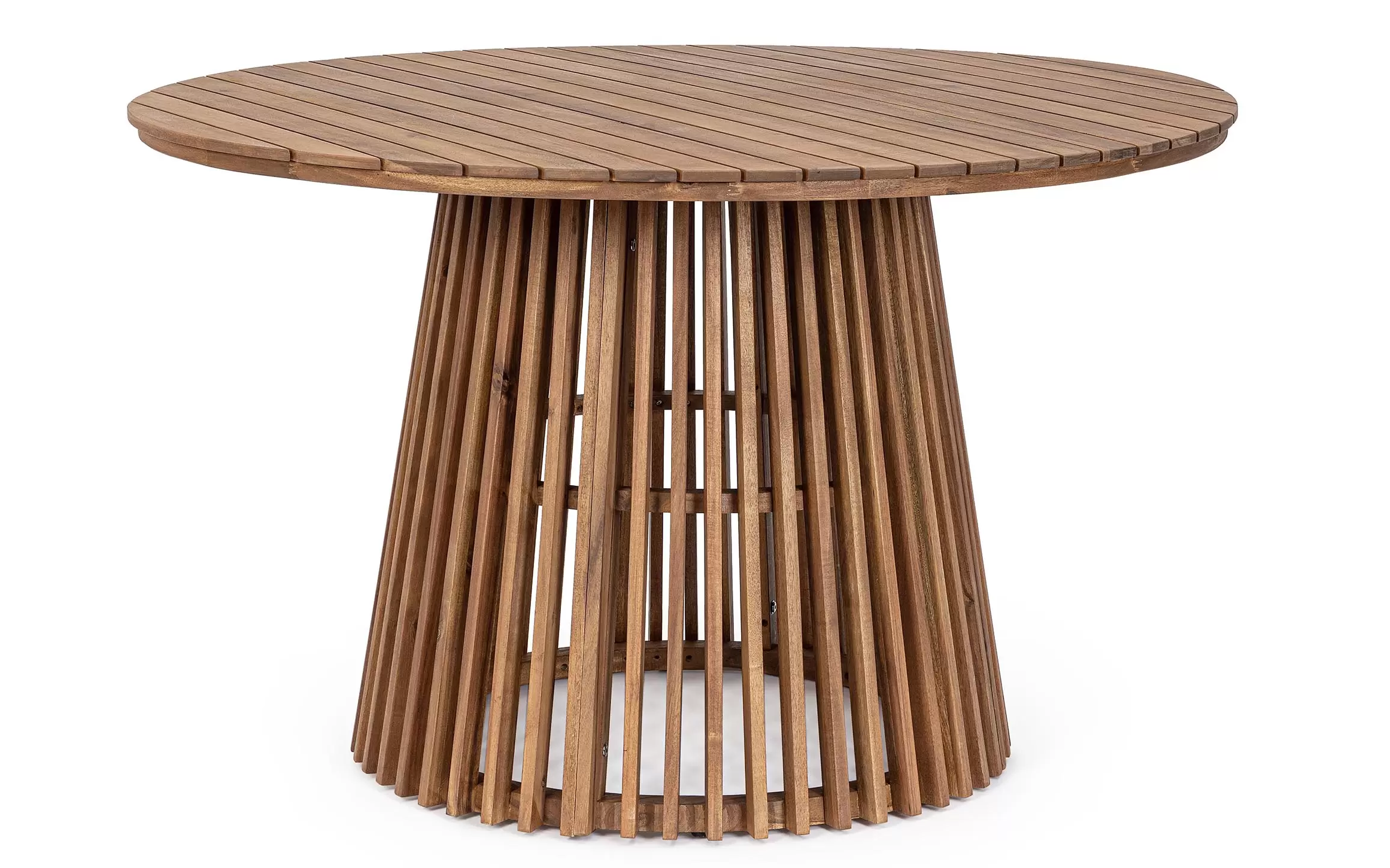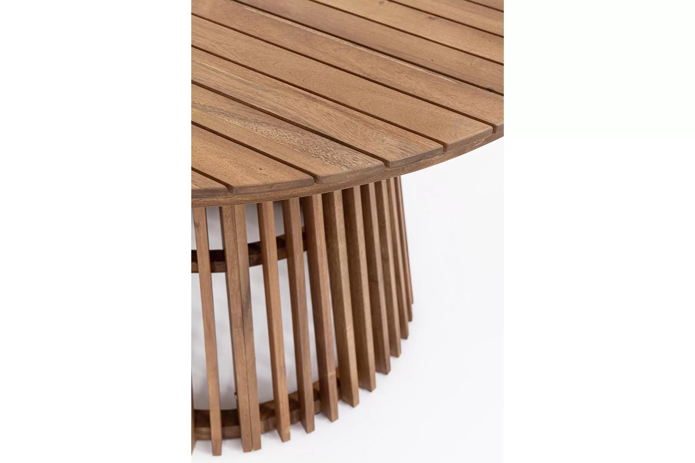 Stół okrągły z drewna akacjowego do wnętrz, ogrodu zimowego i na zadaszony taras z blatem o średnicy 120 cm. Ciekawa podstawa z pionowych deseczek.