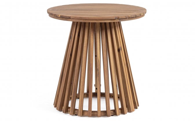 Stolik kawowy okrągły z drewna akacjowego do wnętrz, ogrodu zimowego i na zadaszony taras z blatem o średnicy 50 cm. Ciekawa podstawa z pionowych deseczek.