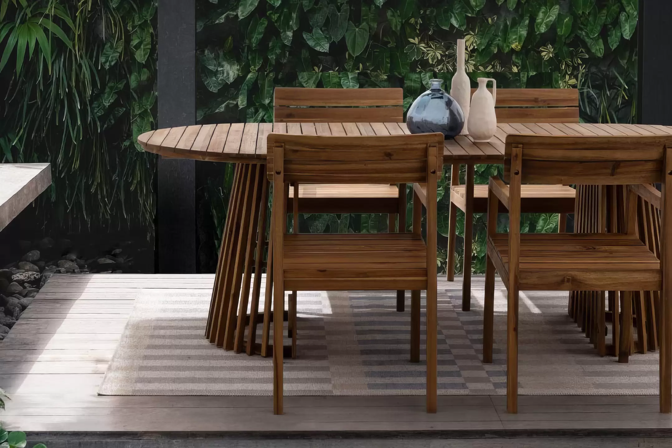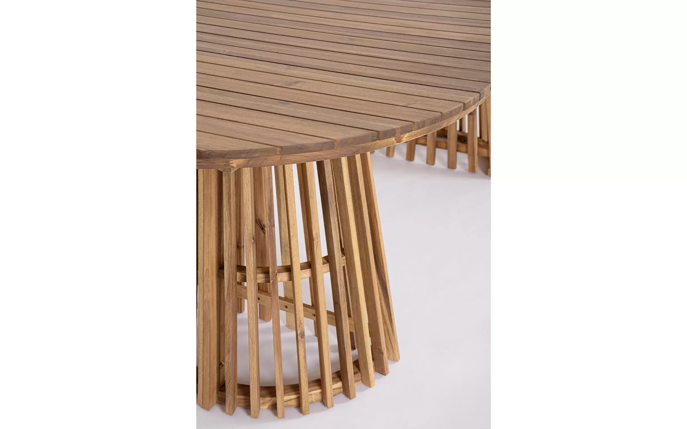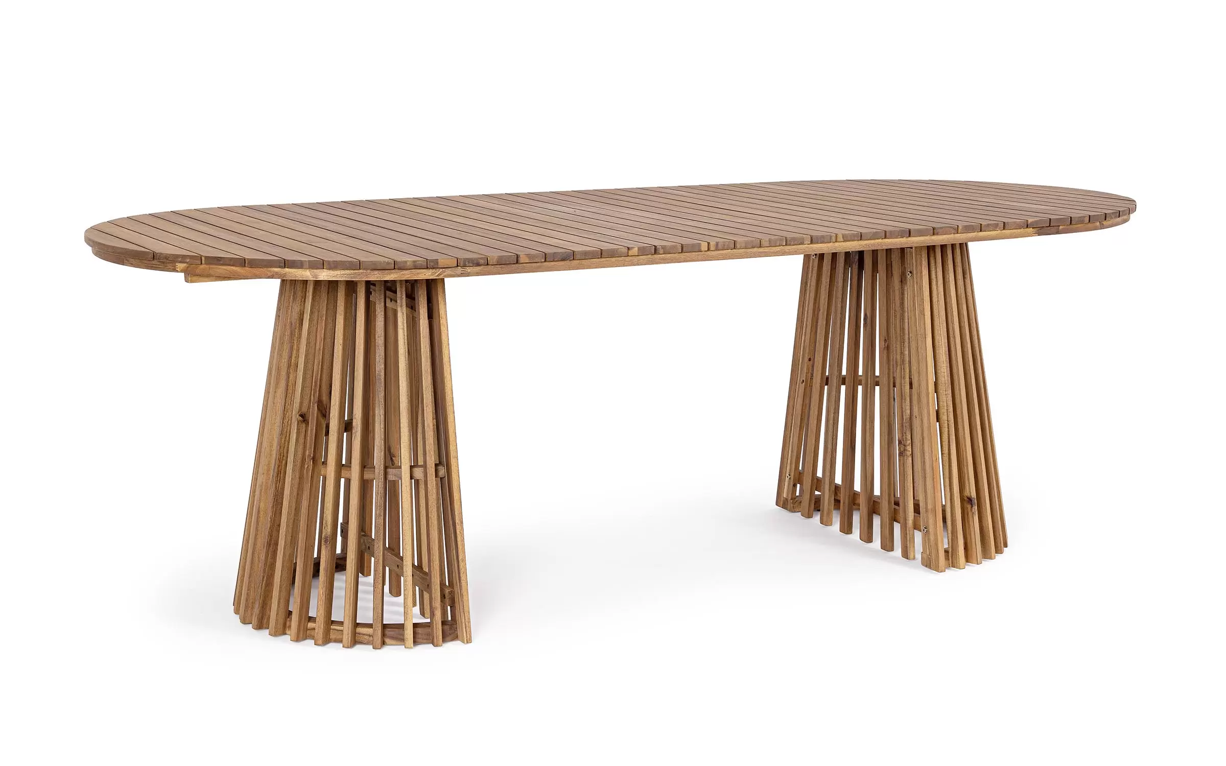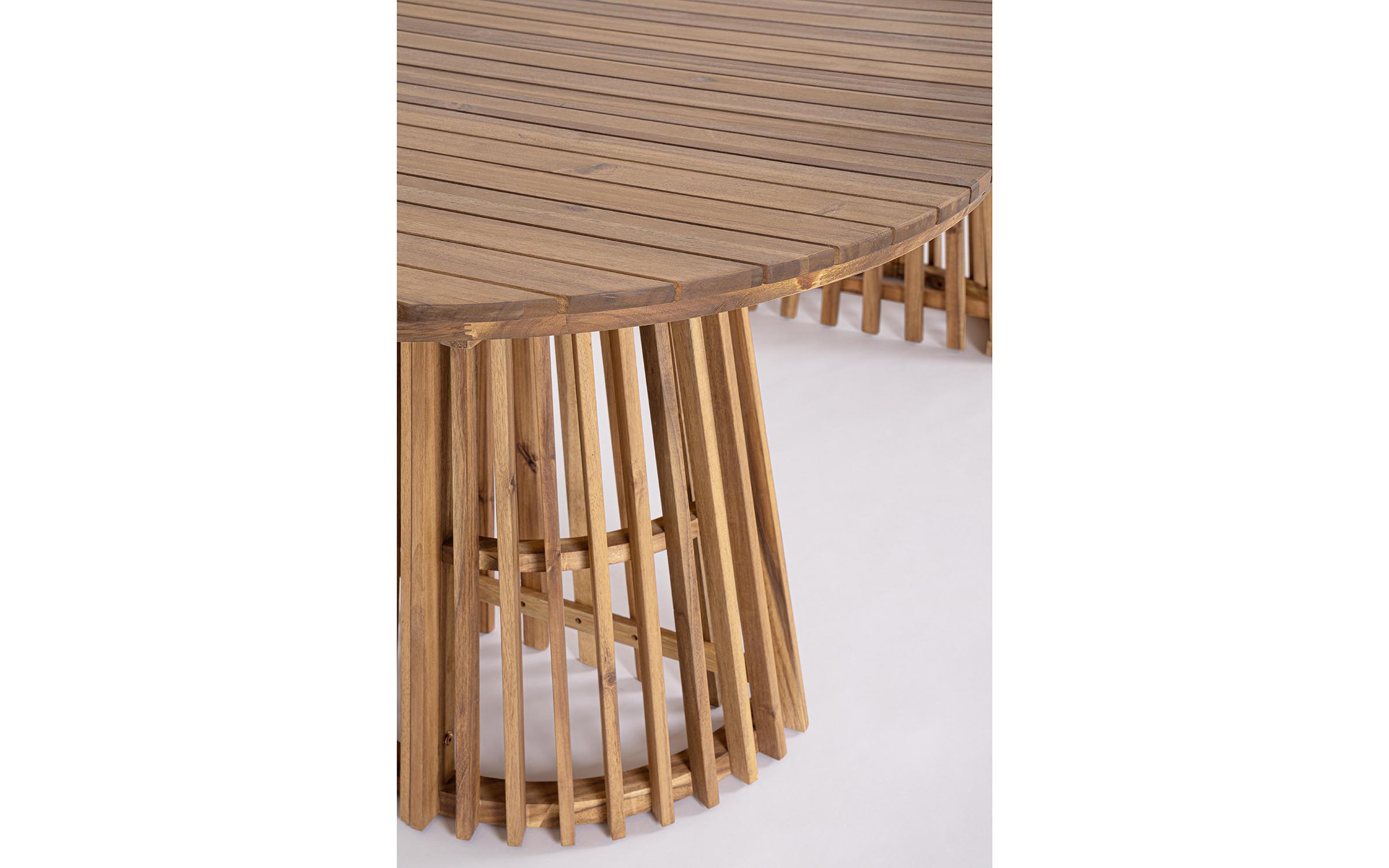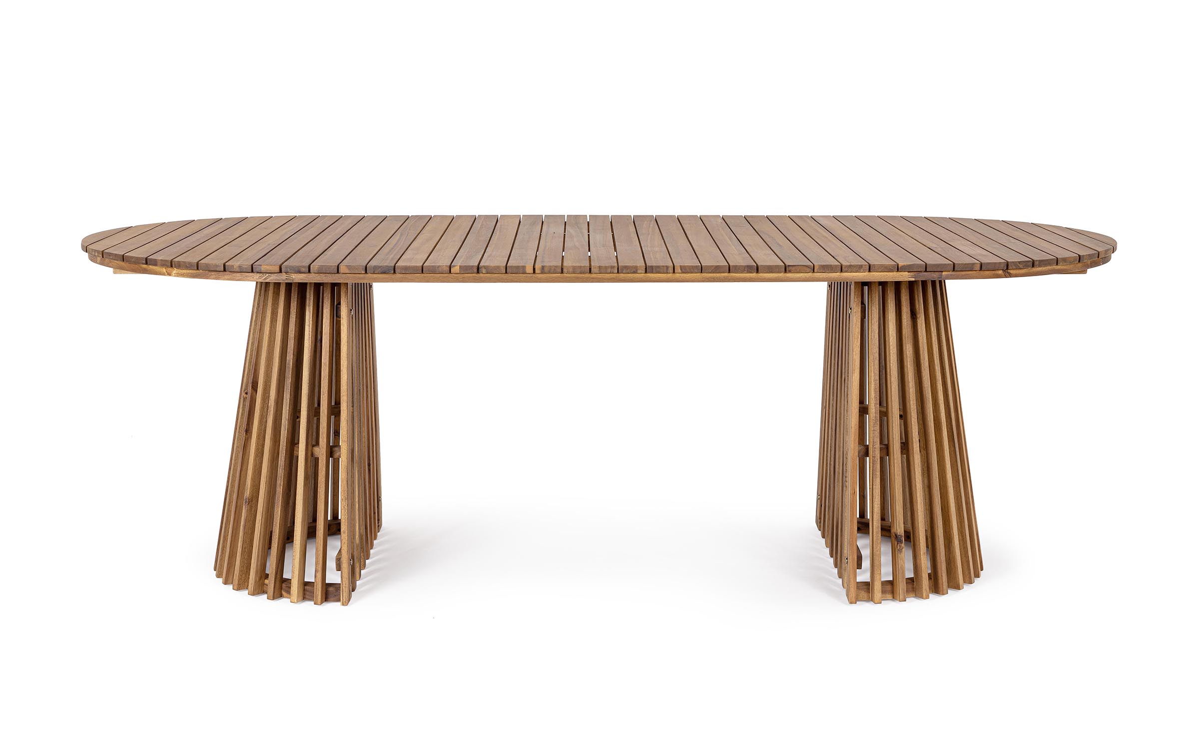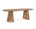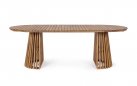 Stół prostokątny z drewna akacjowego do wnętrz, ogrodu zimowego i na zadaszony taras z blatem z poprzecznymi deskami. Końce blatu okrągłe.