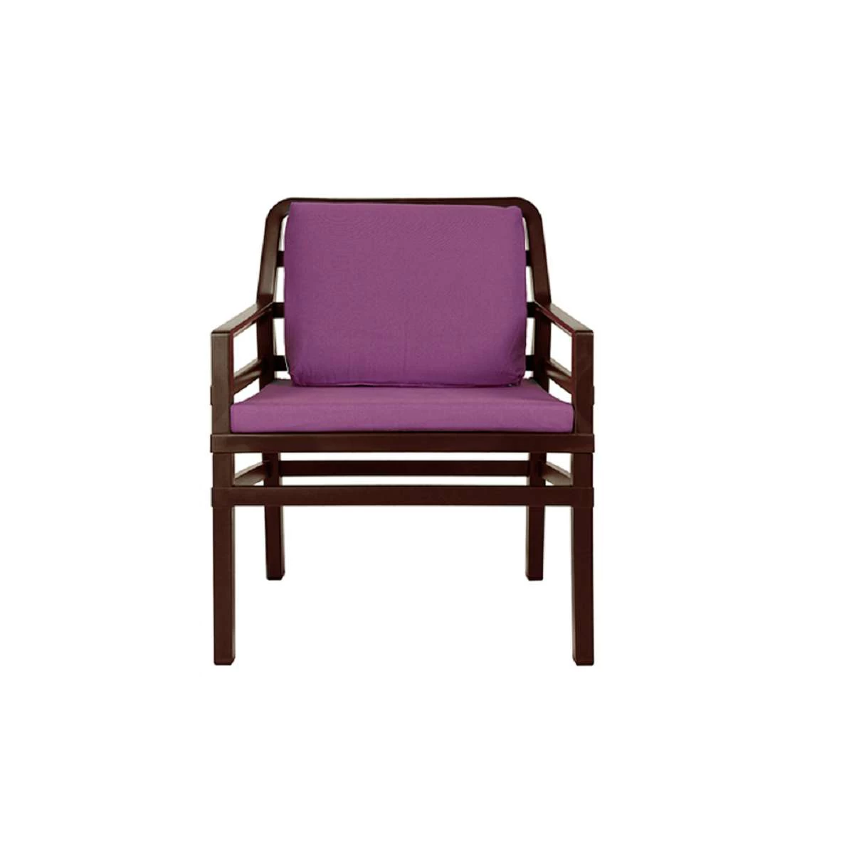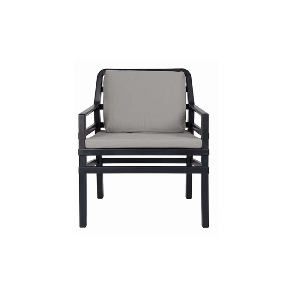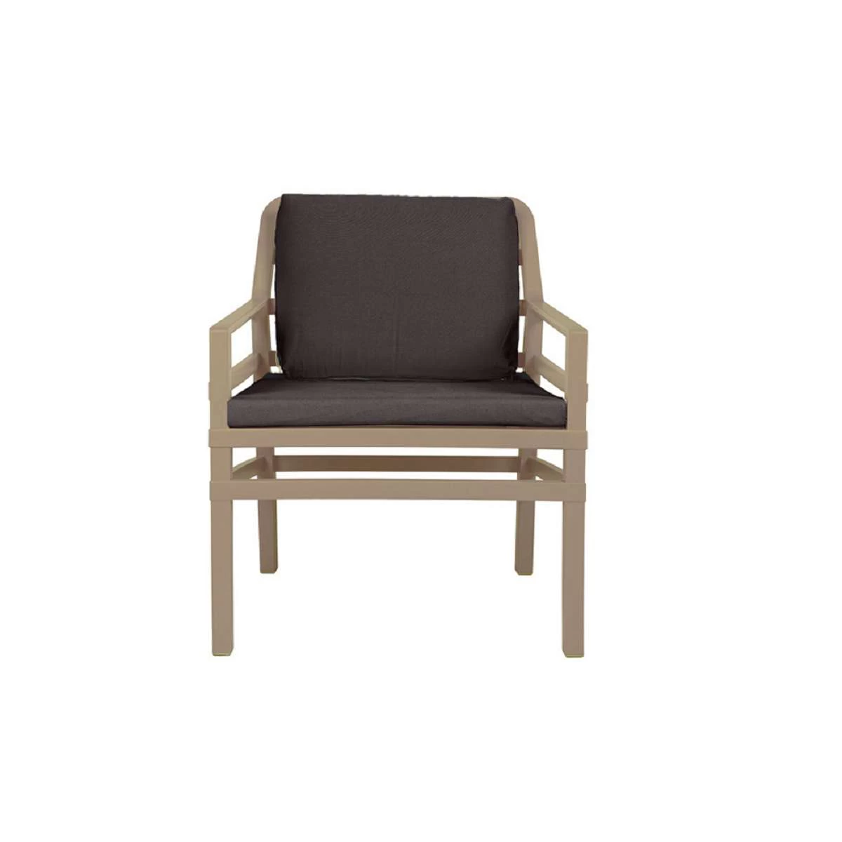 - fotel wypoczynkowy z poduszkami na siedzisku i oparciu