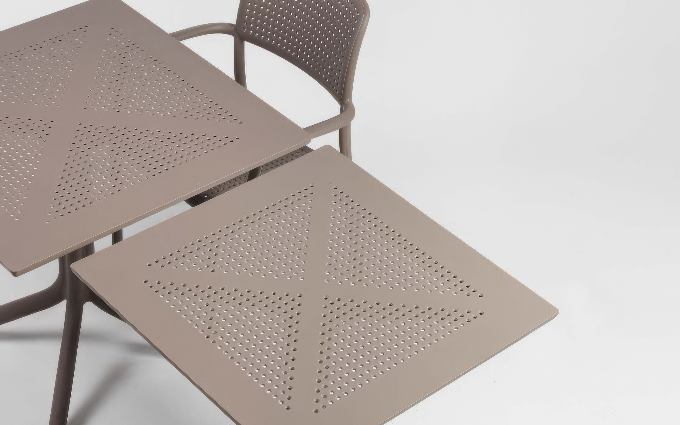 Stolik posiada rozwidlającą się u podstawy centralną nogę. Ażurowy blat z wytrzymałego materiału DurelTOP nadaje ciekawe wzornictwo.