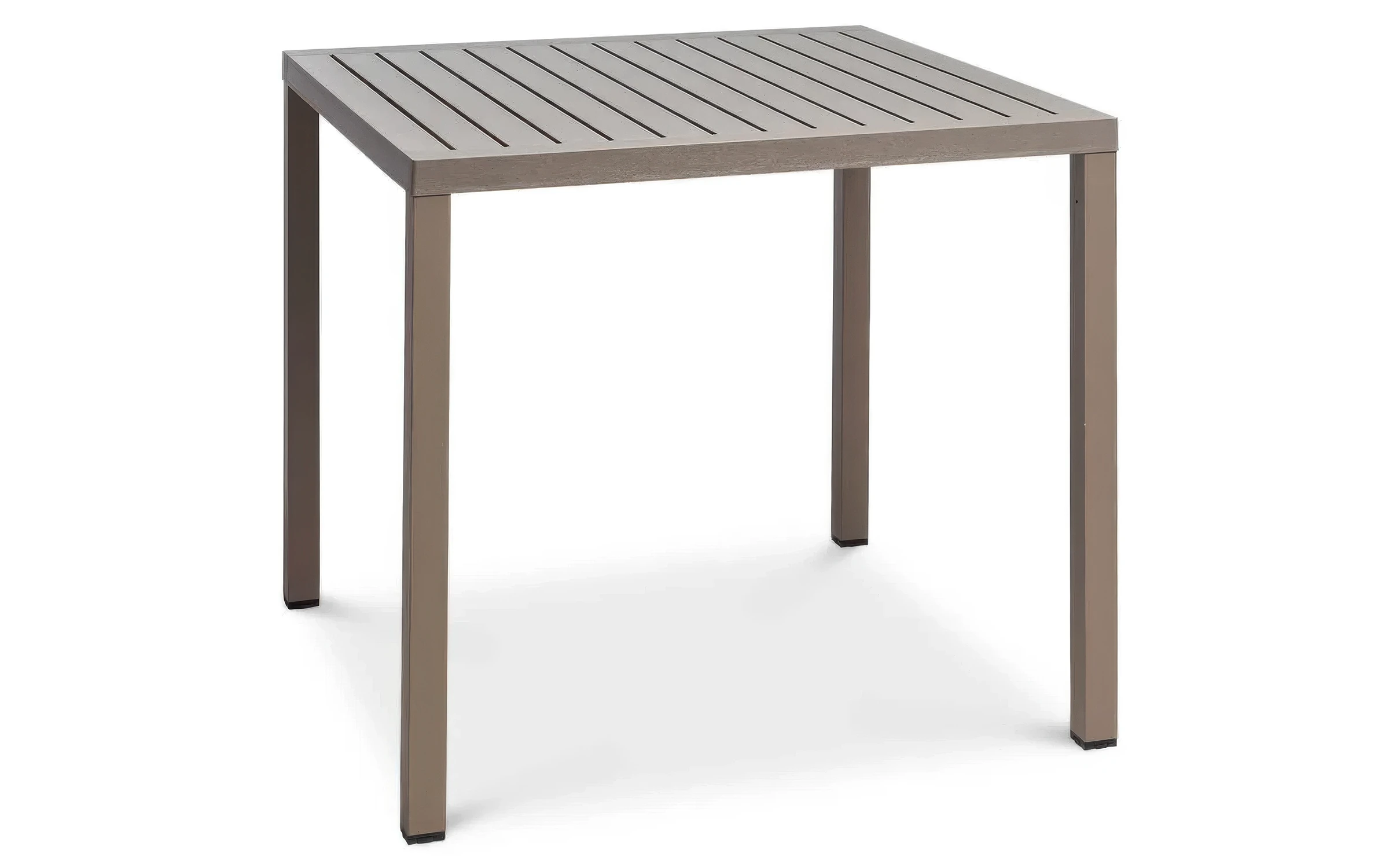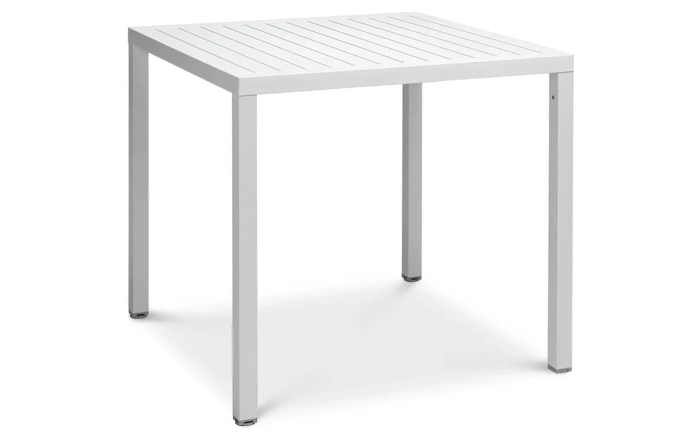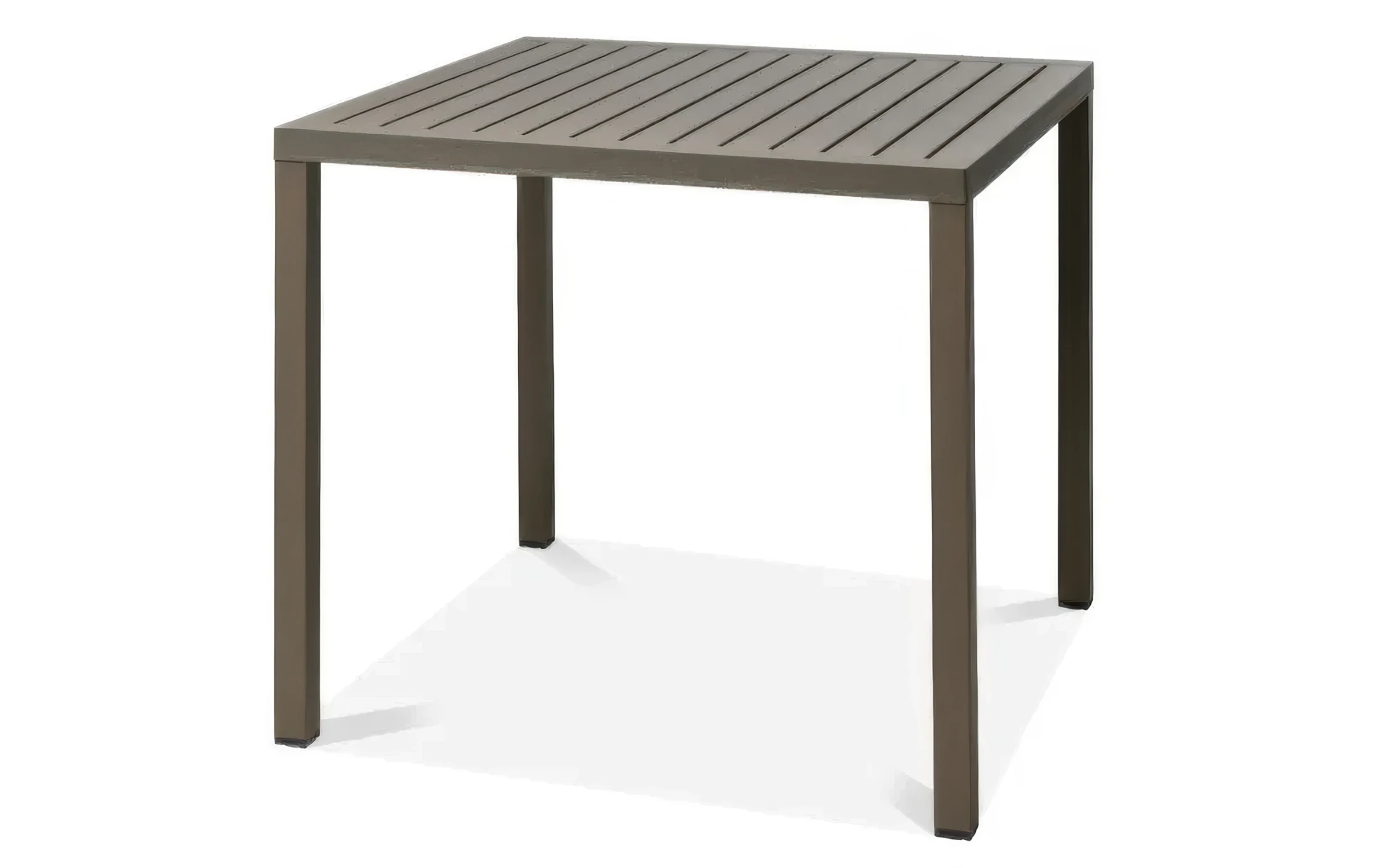 Prosty kwadratowy stół ogrodowy CUBE 80 renomowanej firmy Nardi o aluminiowej konstrukcji z blatem z odpornej na działanie warunków atmosferycznych i UV żywicy polipropylenowej wzmocnionej włóknem szklanym DuralTOP.