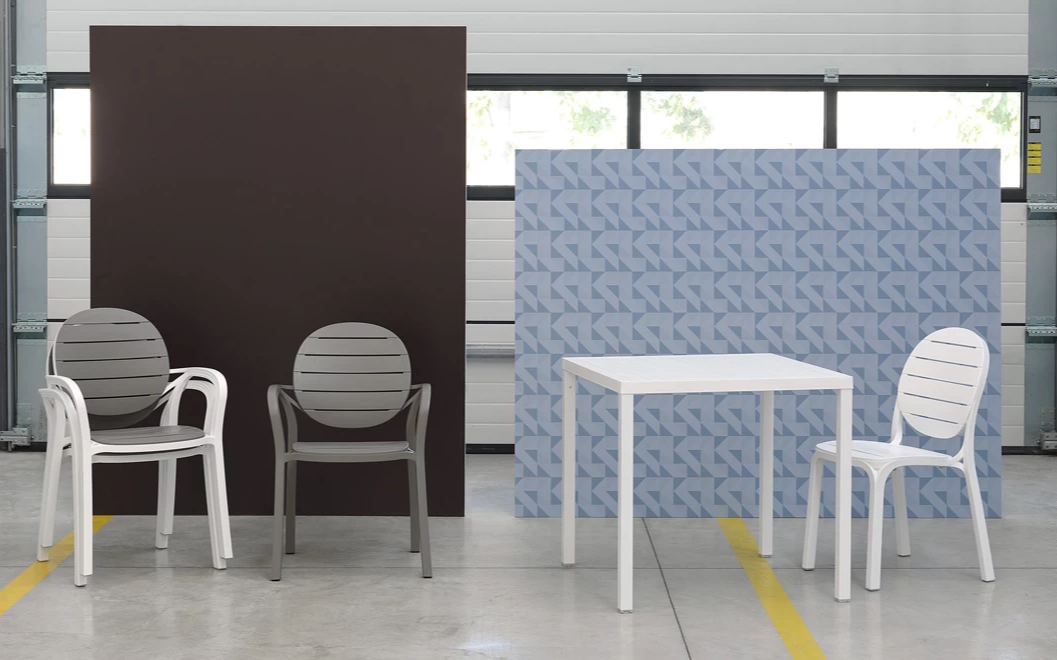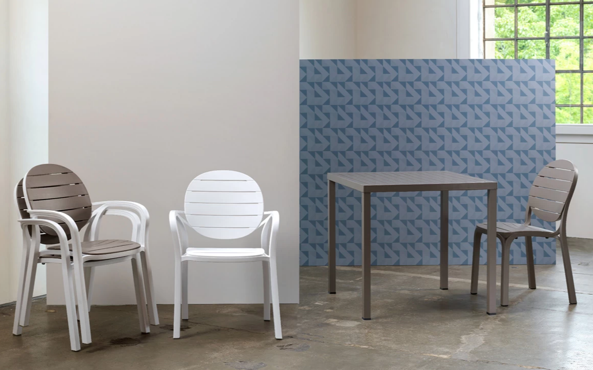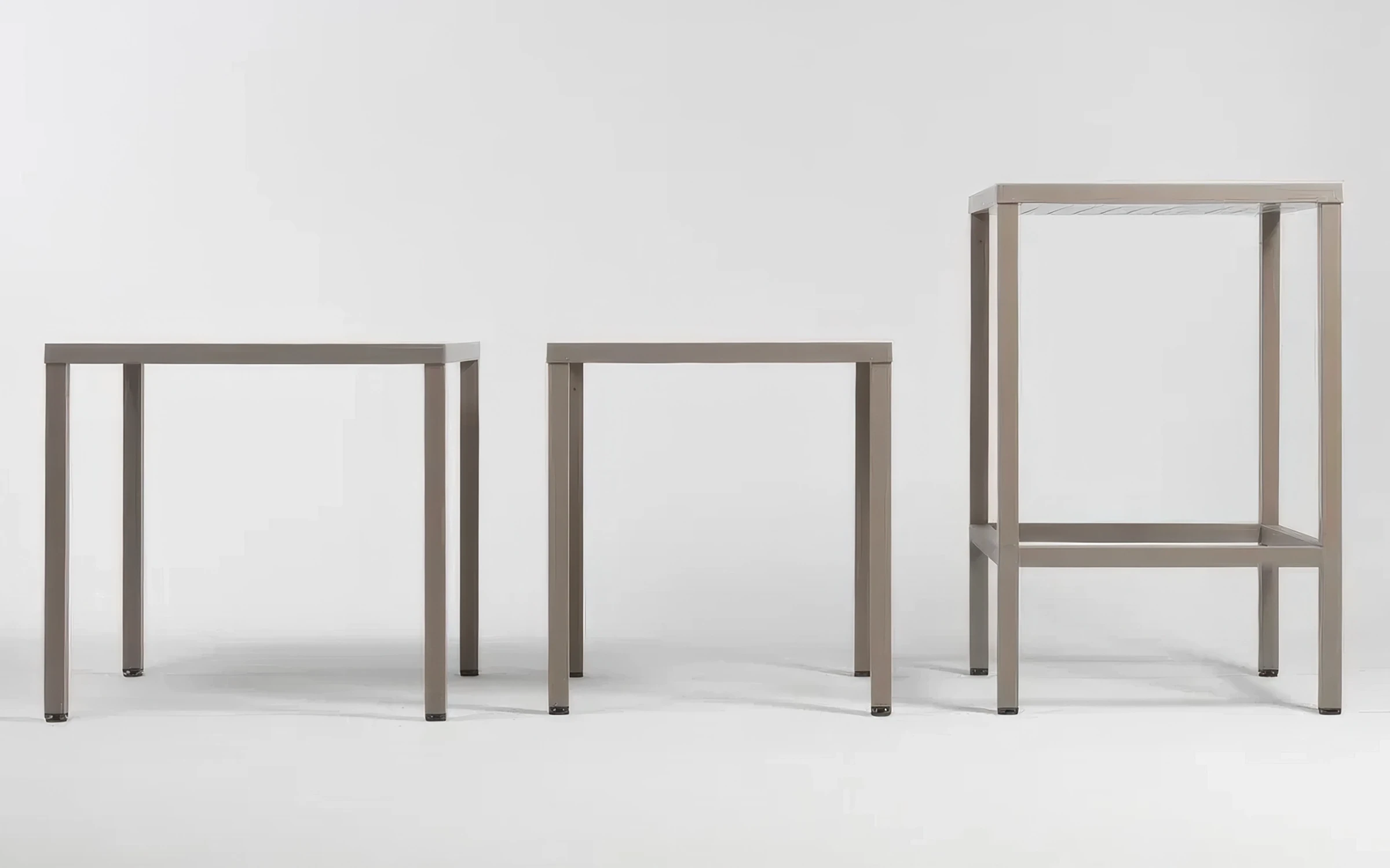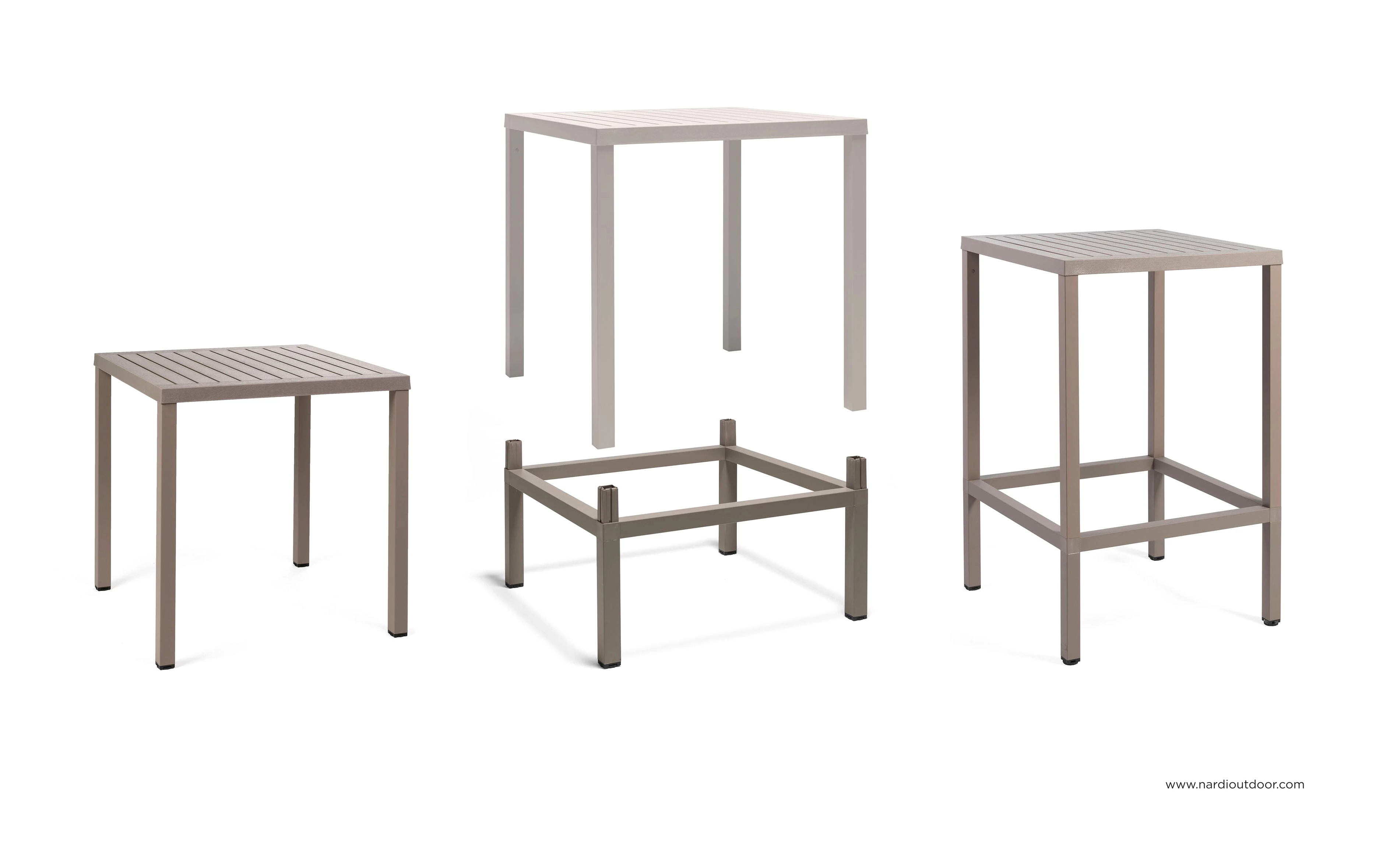 Prosty kwadratowy stół ogrodowy CUBE 80 renomowanej firmy Nardi o aluminiowej konstrukcji z blatem z odpornej na działanie warunków atmosferycznych i UV żywicy polipropylenowej wzmocnionej włóknem szklanym DuralTOP.