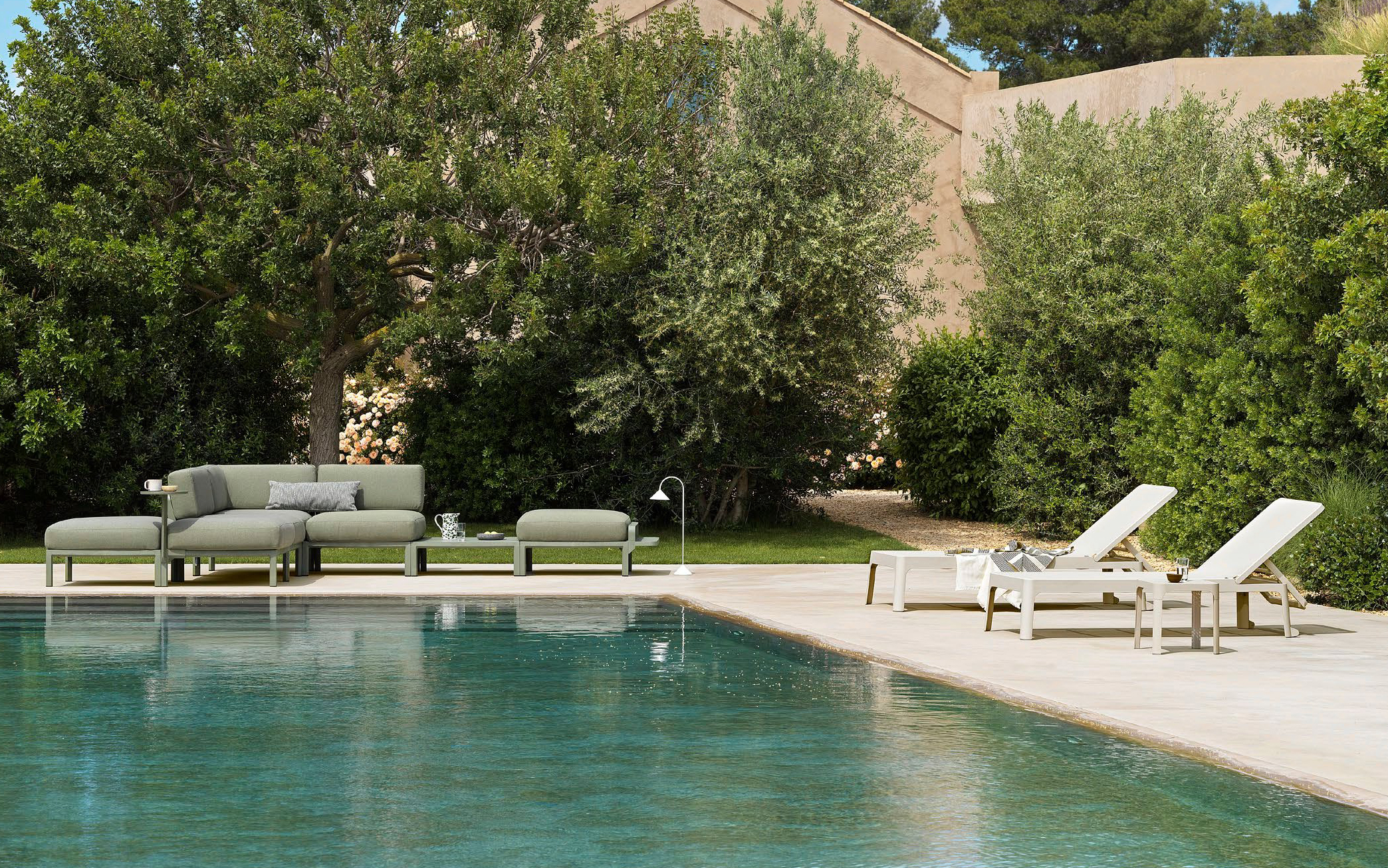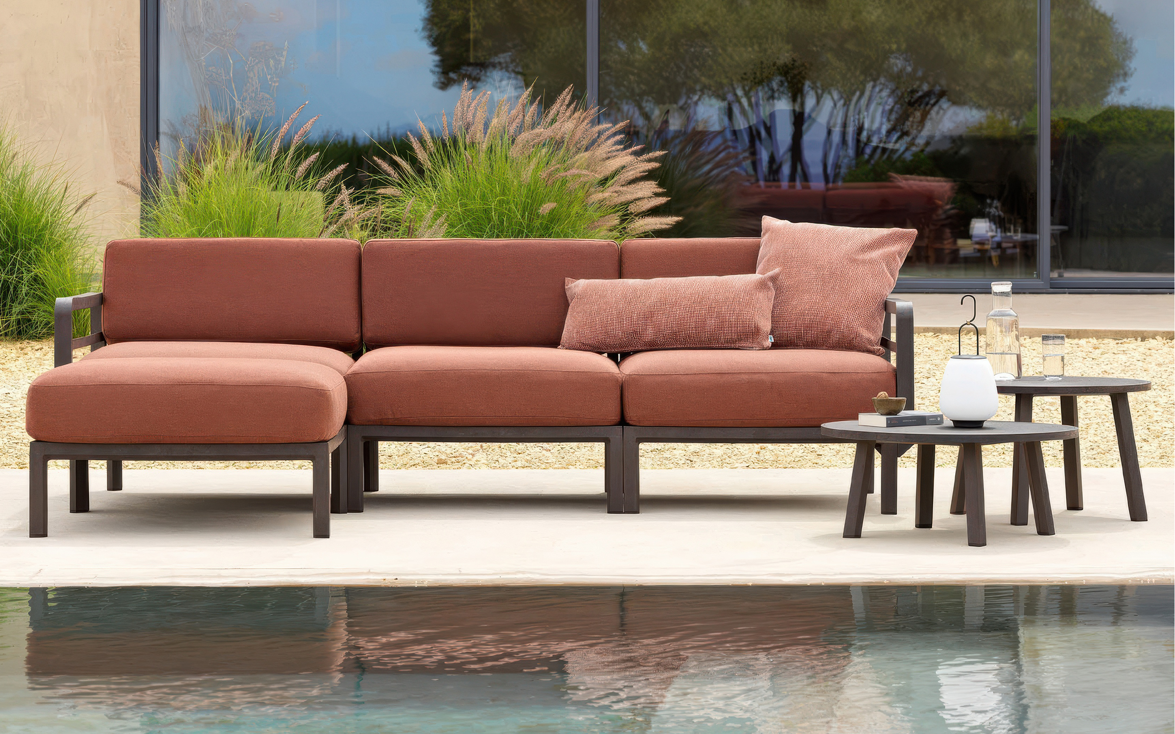 Sofa powstaje z modułów łączonych za pomocą systemu zaczepów, który umożliwia łatwe zestawianie elementów i dopasowanie układu do dostępnej przestrzeni. W komplecie znajdują się poduszki outdoor o zwiększonej odporności na wilgoć i promieniowanie UV. Pokrowce są zdejmowane, co ułatwia czyszczenie i pielęgnację. Dostępne cztery kolory poduszek można dowolnie zestawiać z kolorami konstrukcji.