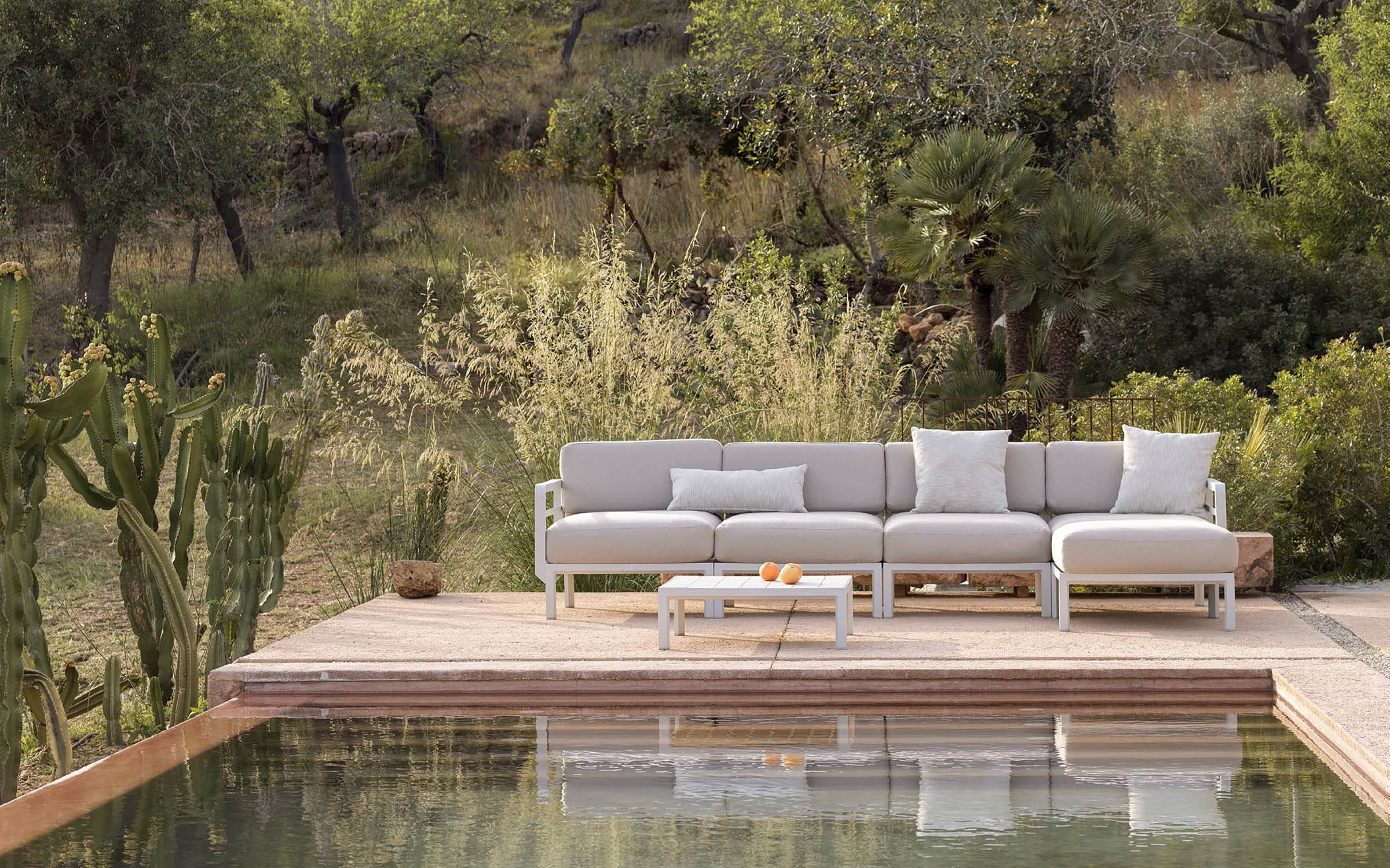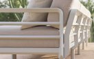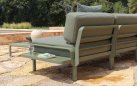 Sofa powstaje z modułów łączonych za pomocą systemu zaczepów, który umożliwia łatwe zestawianie elementów i dopasowanie układu do dostępnej przestrzeni. W komplecie znajdują się poduszki outdoor o zwiększonej odporności na wilgoć i promieniowanie UV. Pokrowce są zdejmowane, co ułatwia czyszczenie i pielęgnację. Dostępne cztery kolory poduszek można dowolnie zestawiać z kolorami konstrukcji.