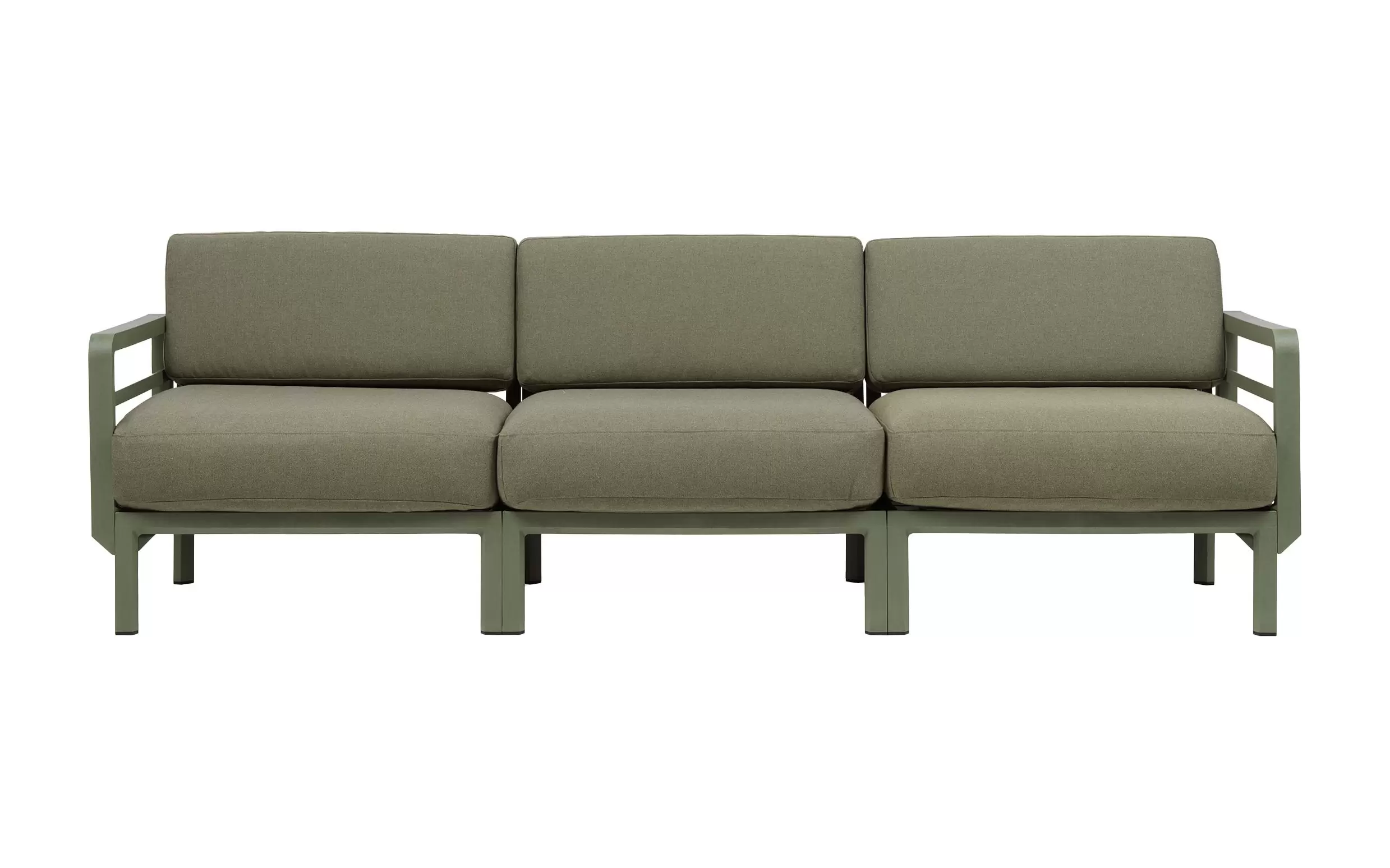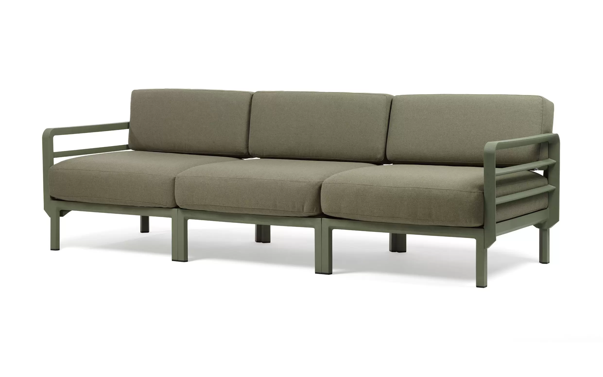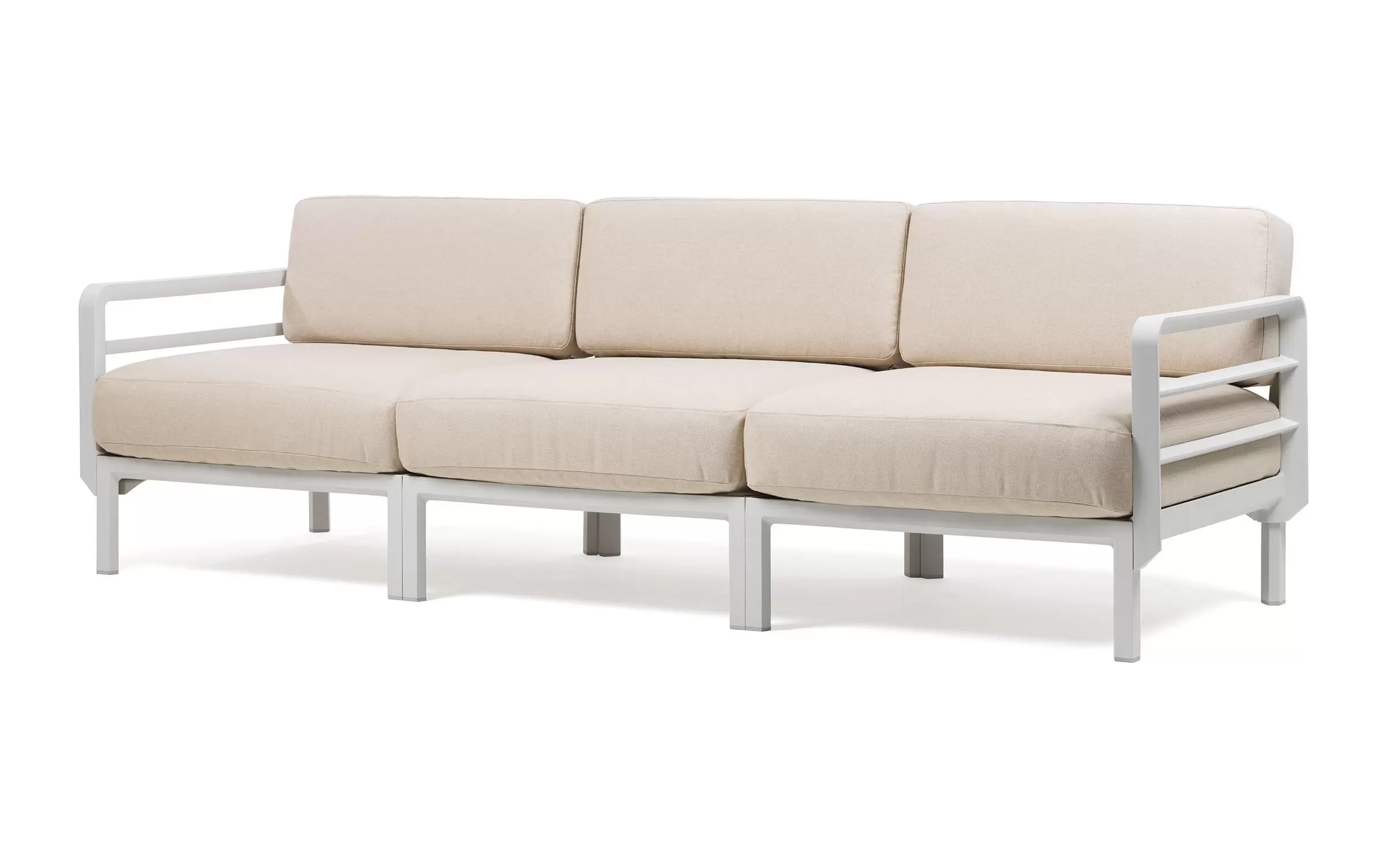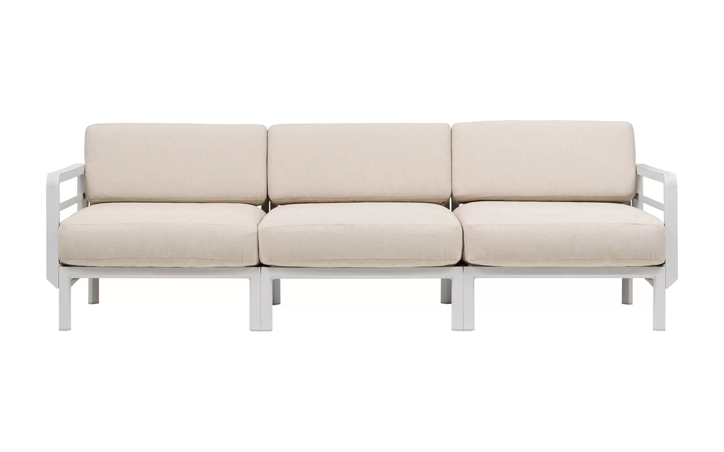 Sofa powstaje z modułów łączonych za pomocą systemu zaczepów, który umożliwia łatwe zestawianie elementów i dopasowanie układu do dostępnej przestrzeni. W komplecie znajdują się poduszki outdoor o zwiększonej odporności na wilgoć i promieniowanie UV. Pokrowce są zdejmowane, co ułatwia czyszczenie i pielęgnację. Dostępne cztery kolory poduszek można dowolnie zestawiać z kolorami konstrukcji.