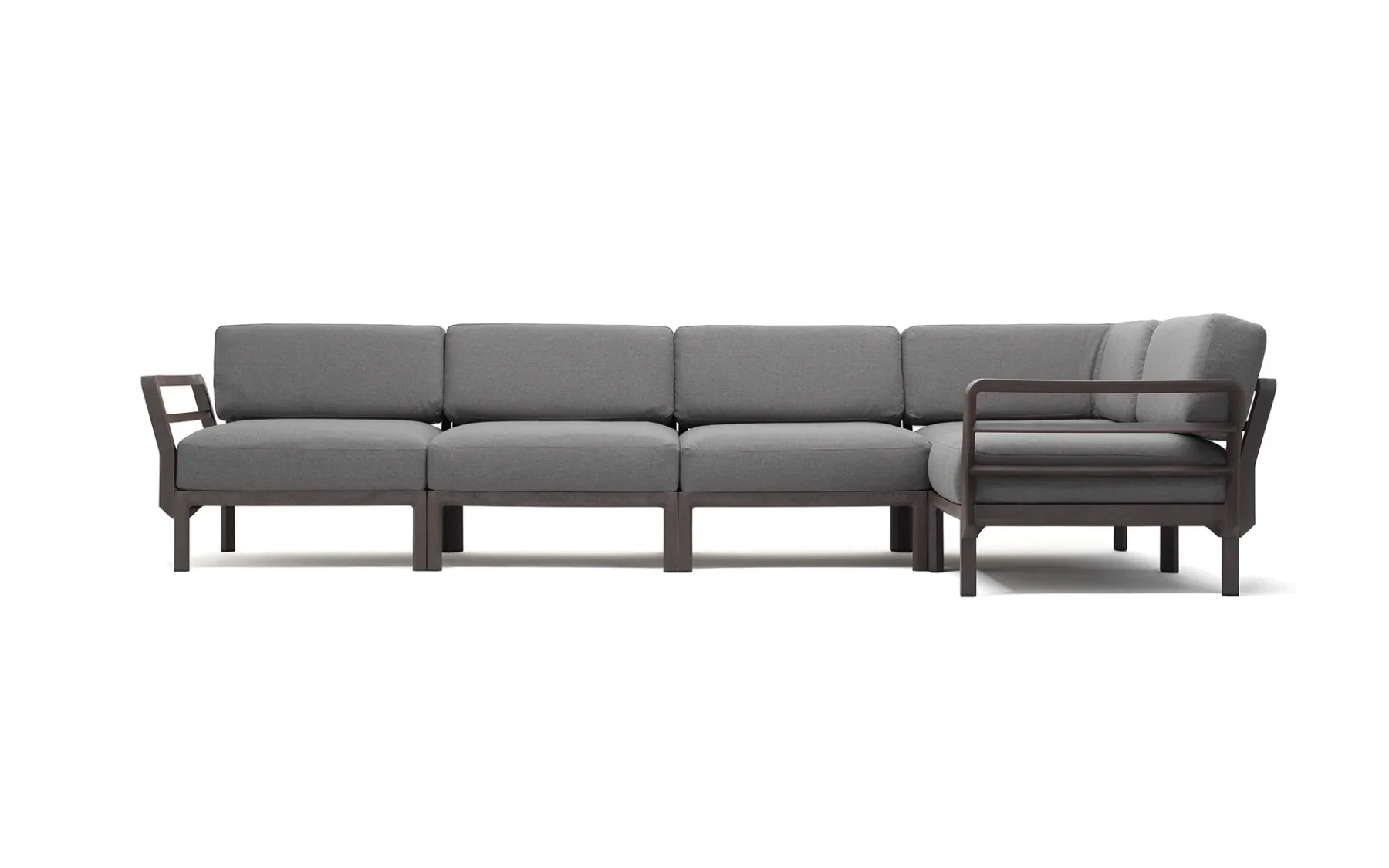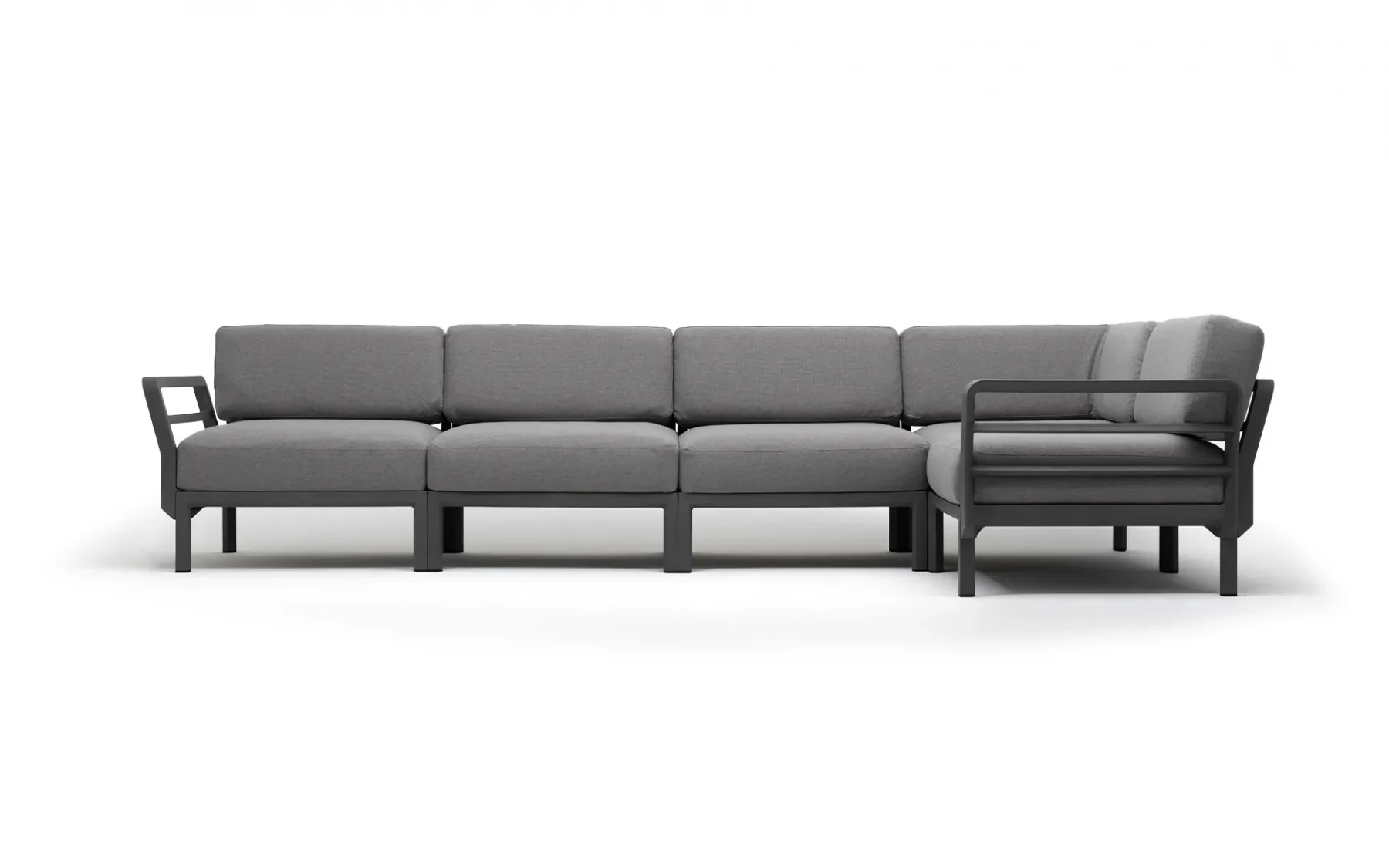 Modułowość narożnika ogrodowego w tym przypadku oznacza możliwość ustawień - zarówno w wersji z dłuższym ramieniem po prawej lub lewej stronie lub symetrycznej o równych ramionach.