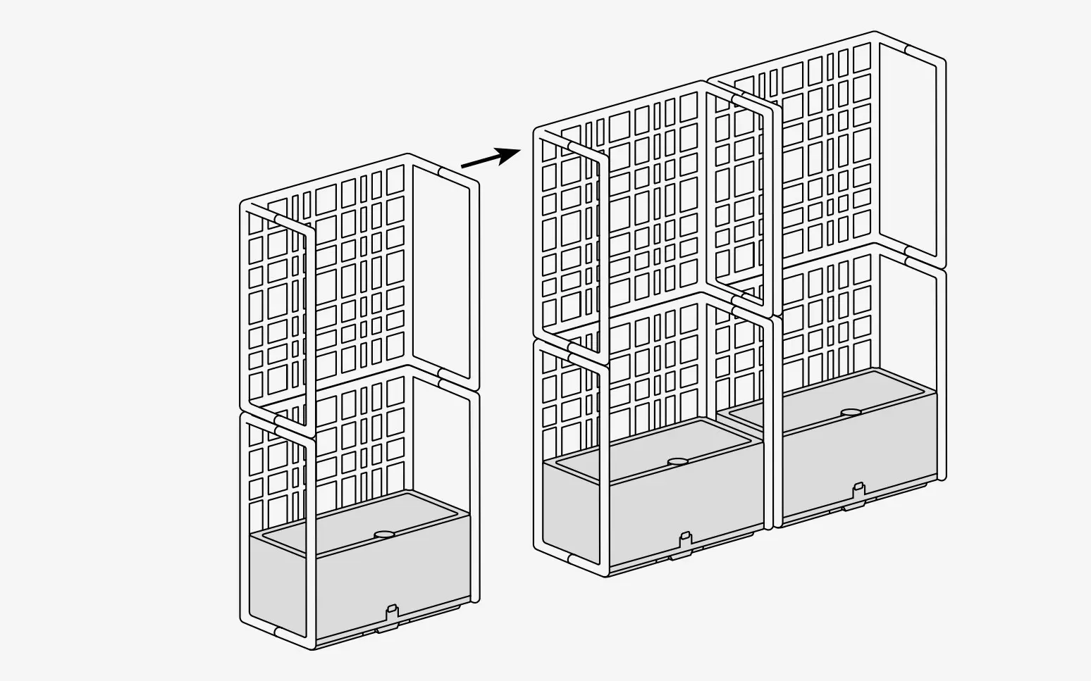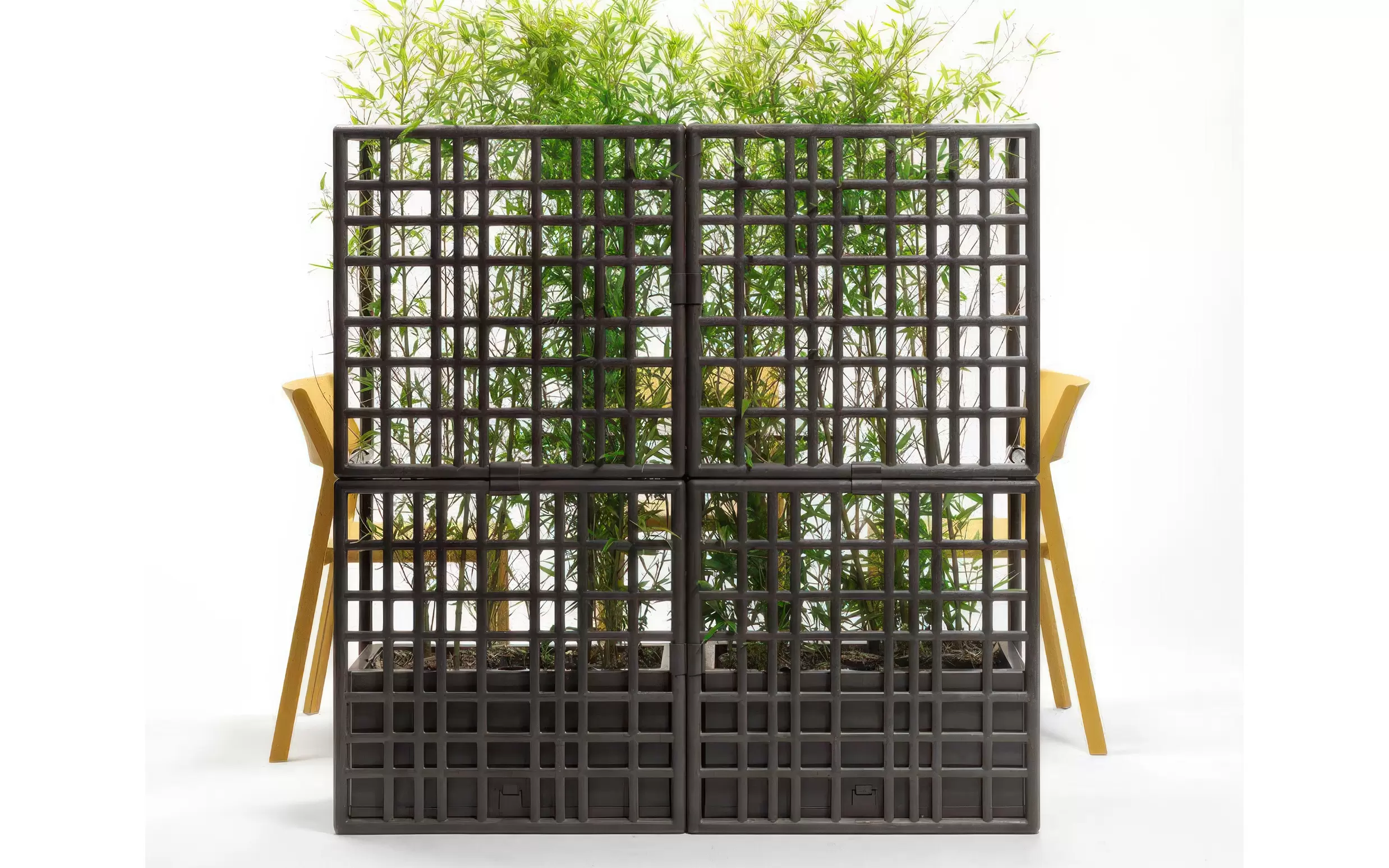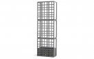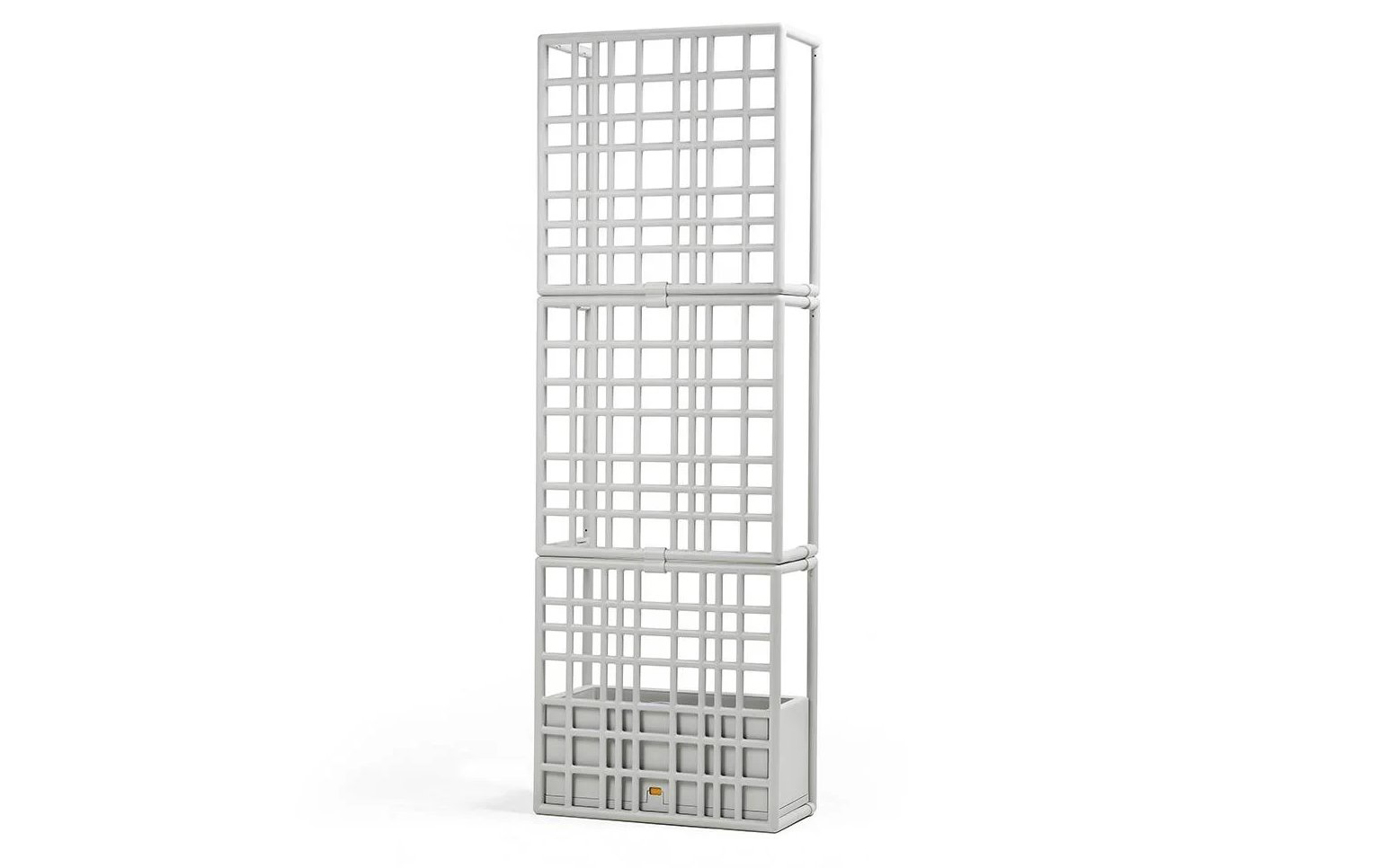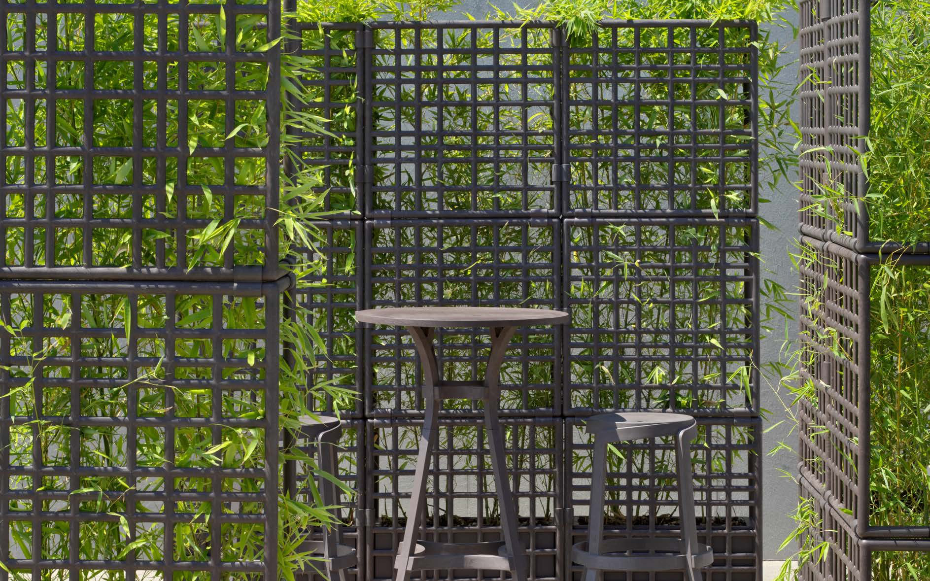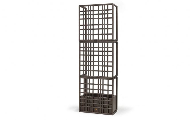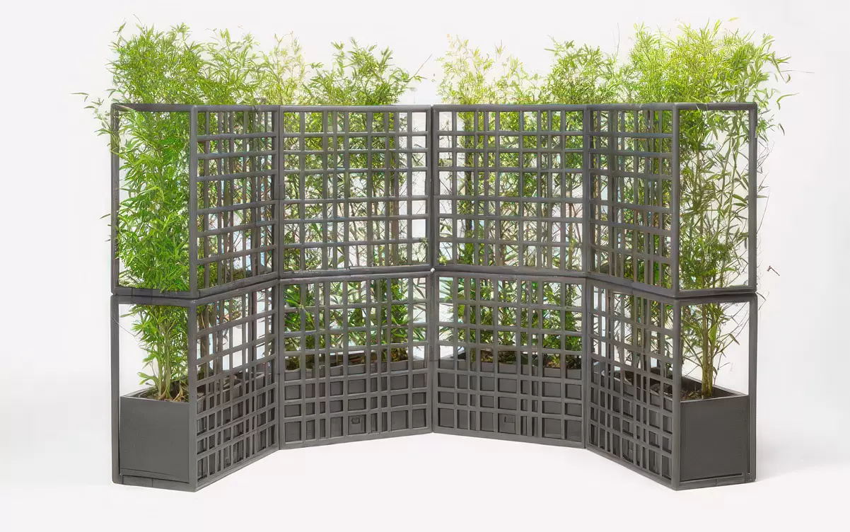 Model składa się z trzech elementów kratowych, które łączą się ze sobą bez użycia śrub, oraz z donicą samonawadniającą. System umożliwia tworzenie konfiguracji liniowych, łamanych oraz zakrzywionych, a także piętrowanie modułów do trzech poziomów, co pozwala budować wysokie i stabilne przegrody ogrodowe.