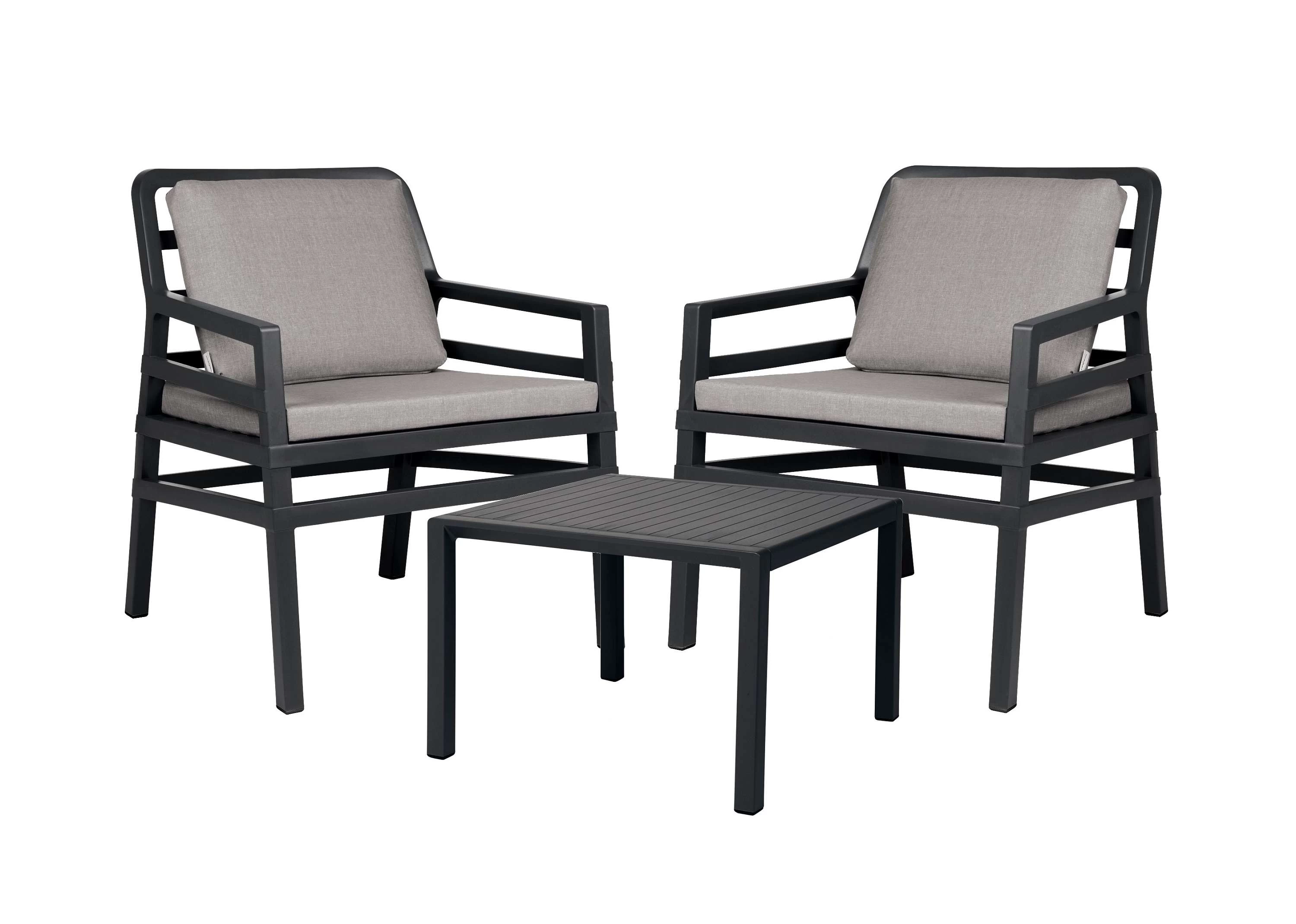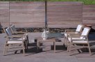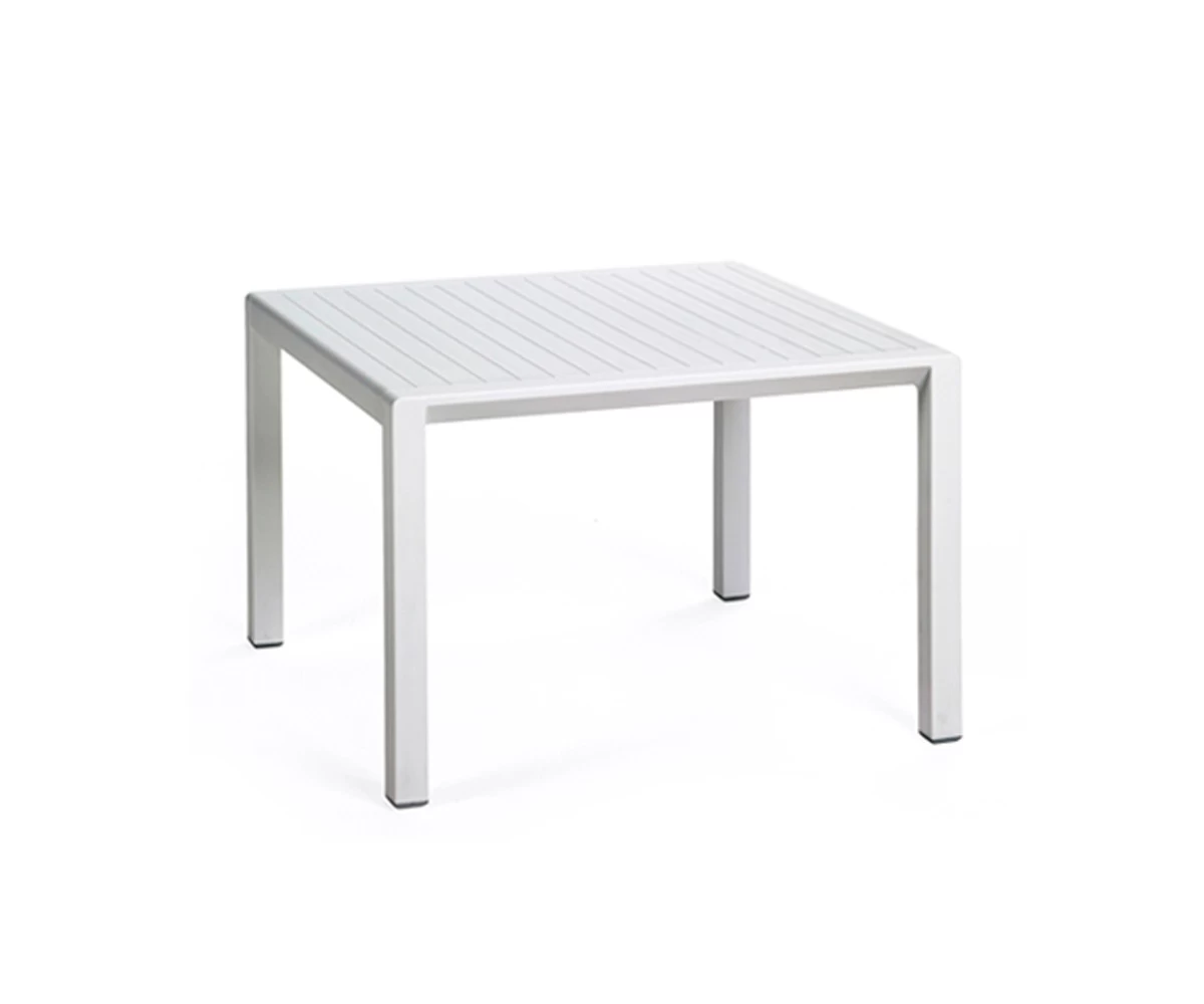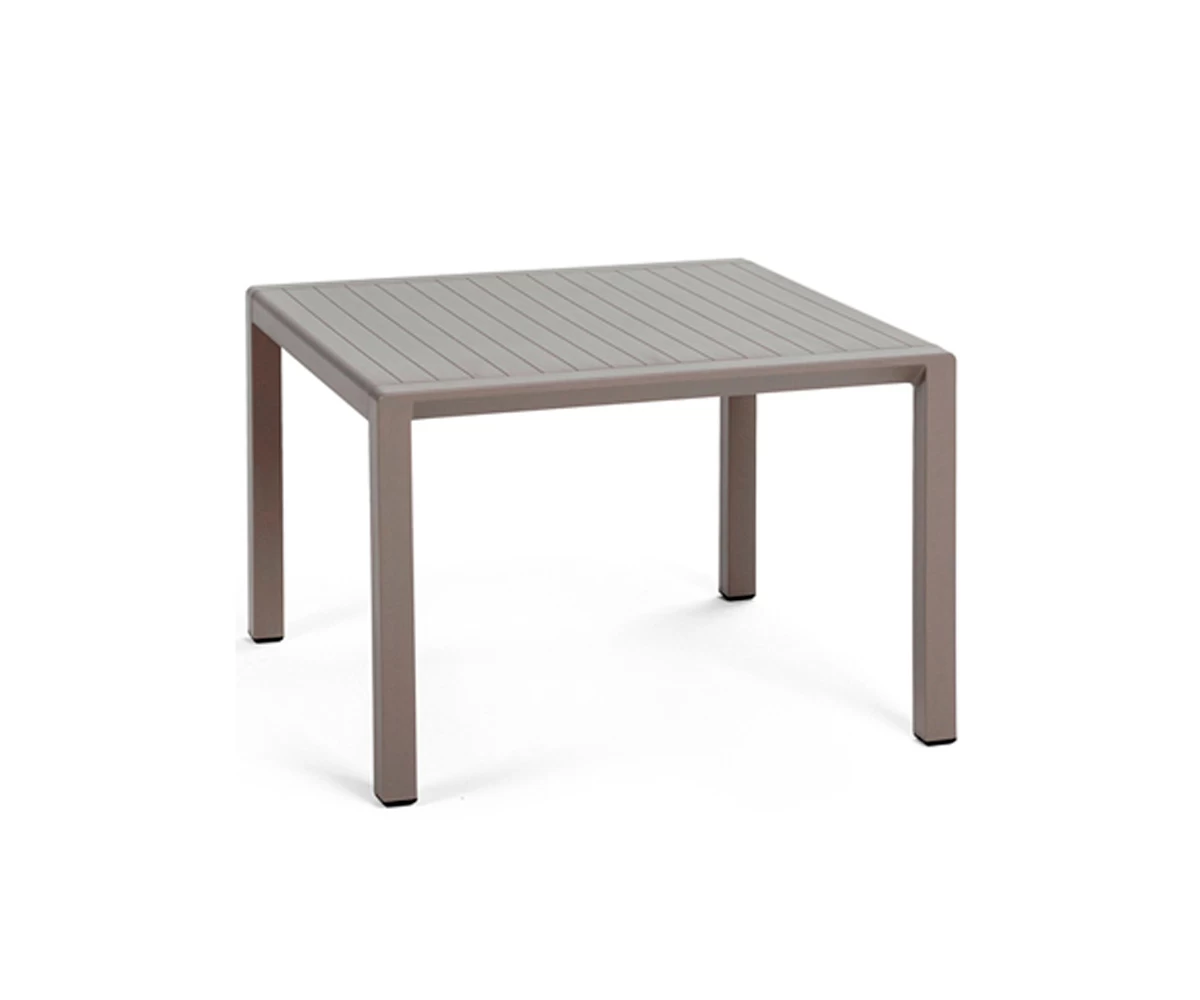 Stolik kawowy kwadratowy wykonany z polipropylenu wzmocnionego włóknem szklanym. Blat stolika z imitacją poprzecznych deseczek.